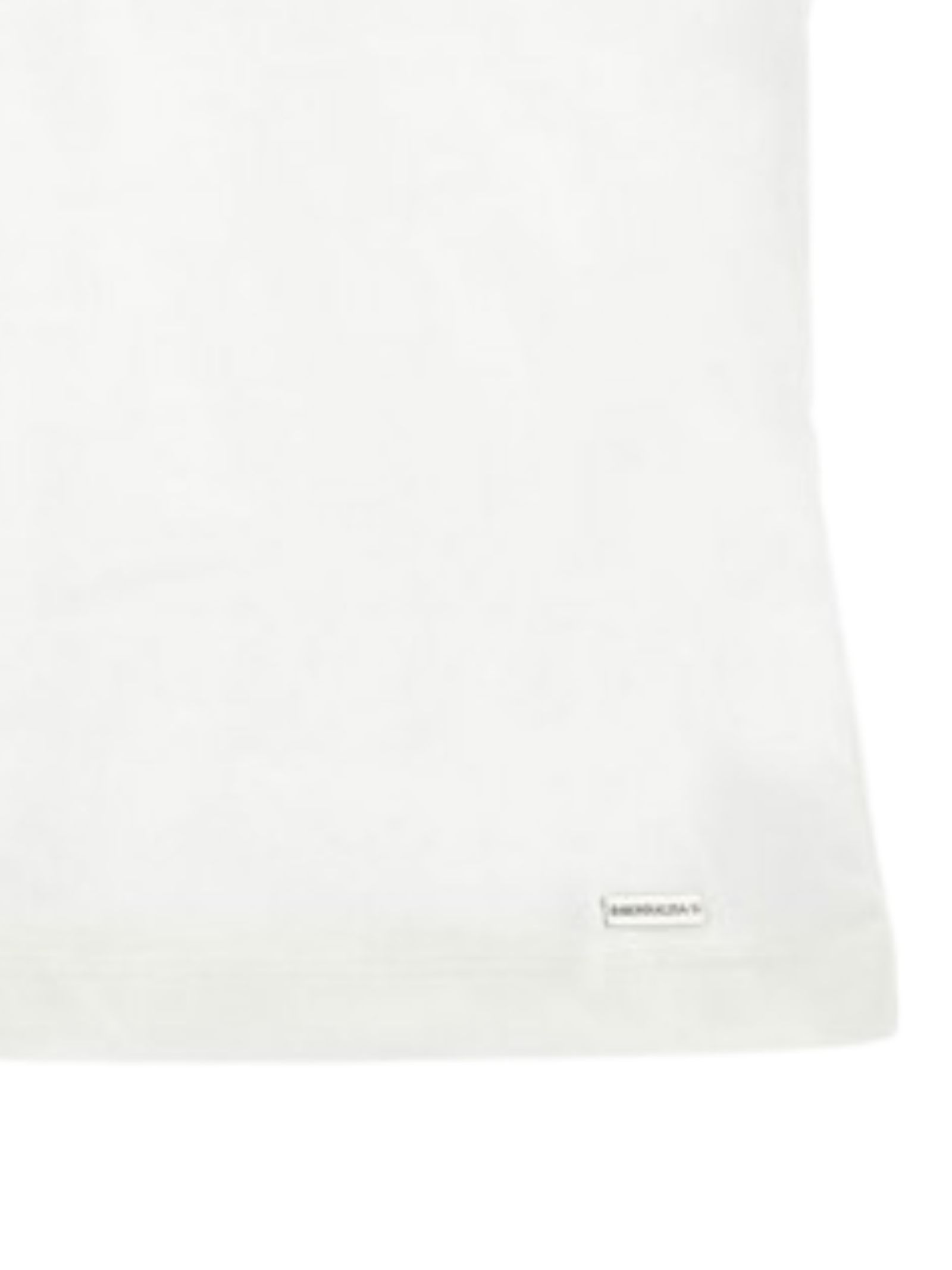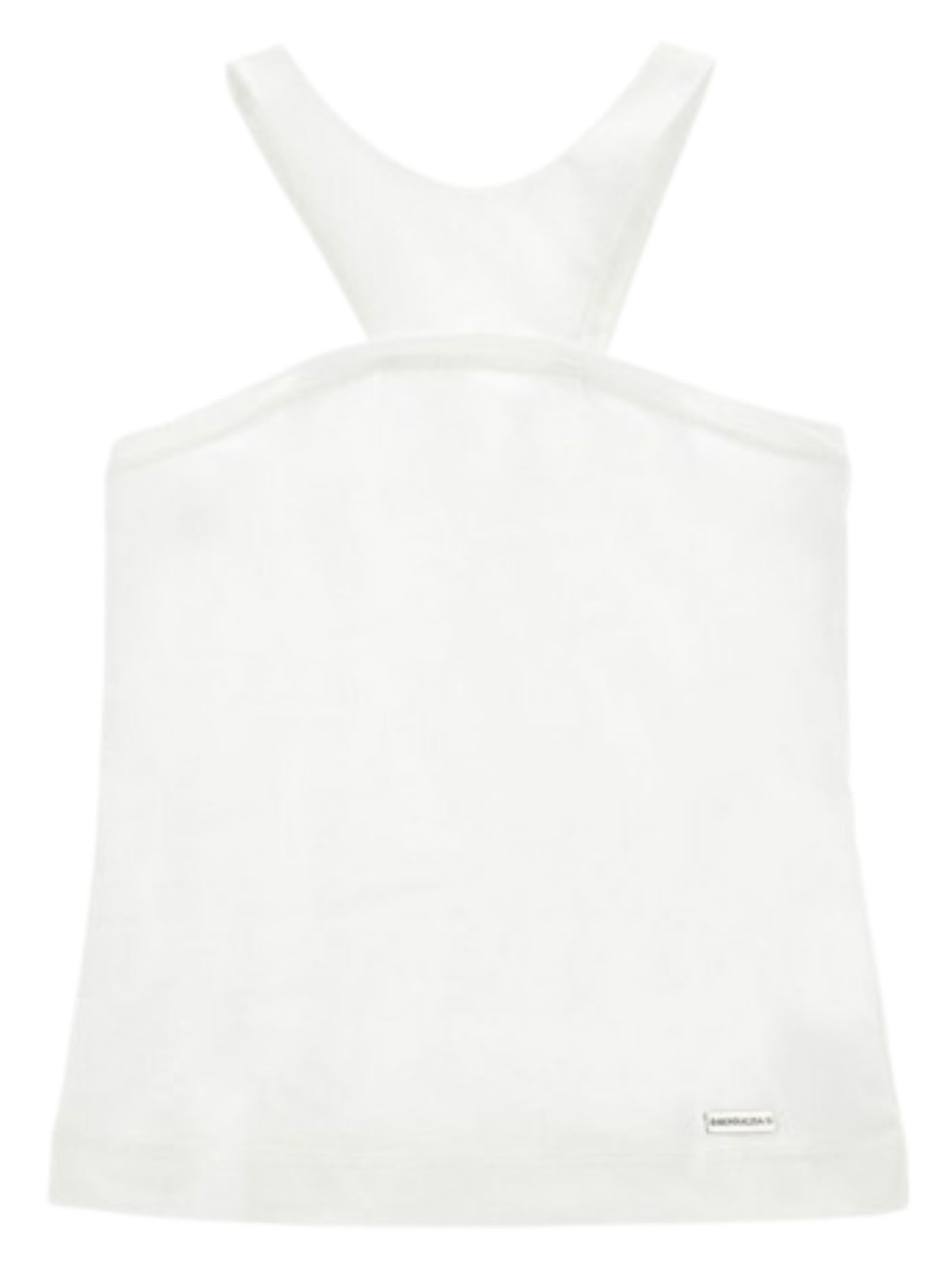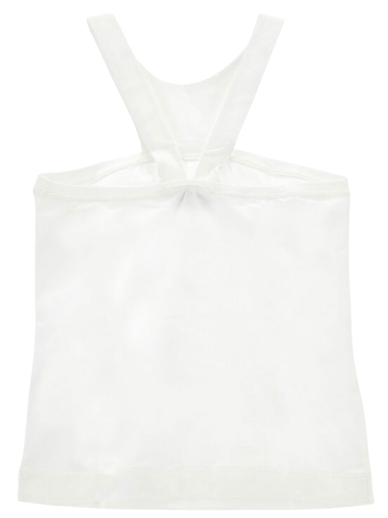Monnalisa Kids canotta di colore bianco, design con scollatura ampia, bretelle incrociate, applicazione logo in metallo, vestibilità aderente. Composizione: 95% cotone 5% elastan. Made in Italy