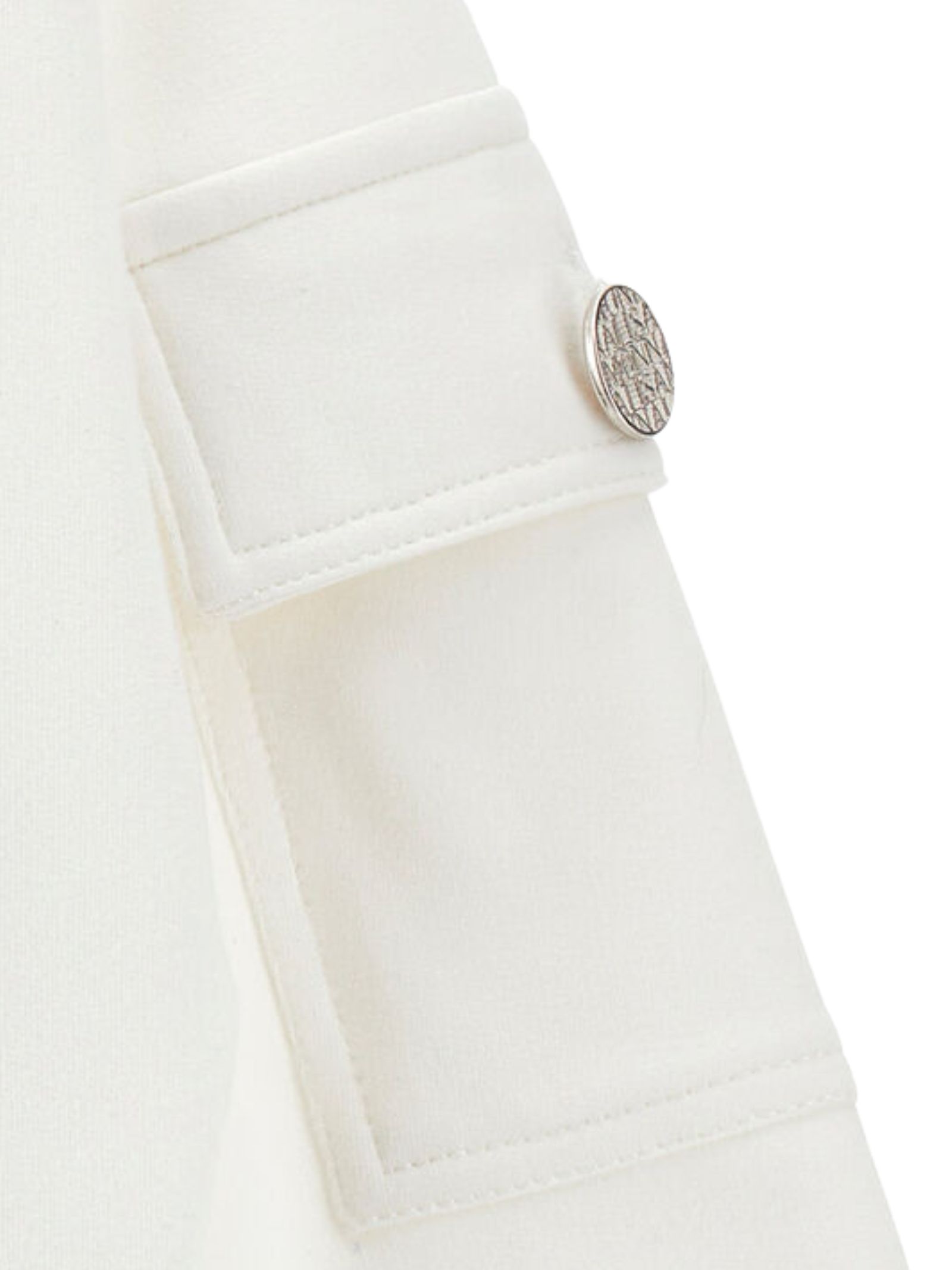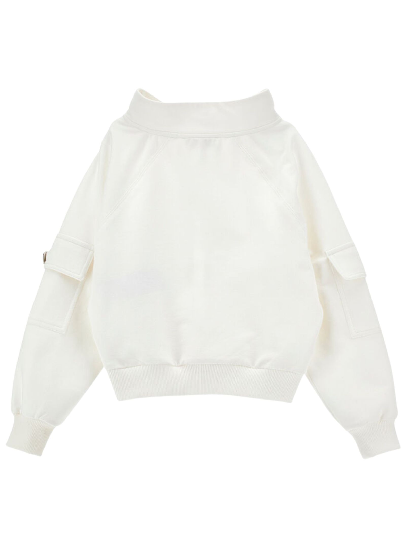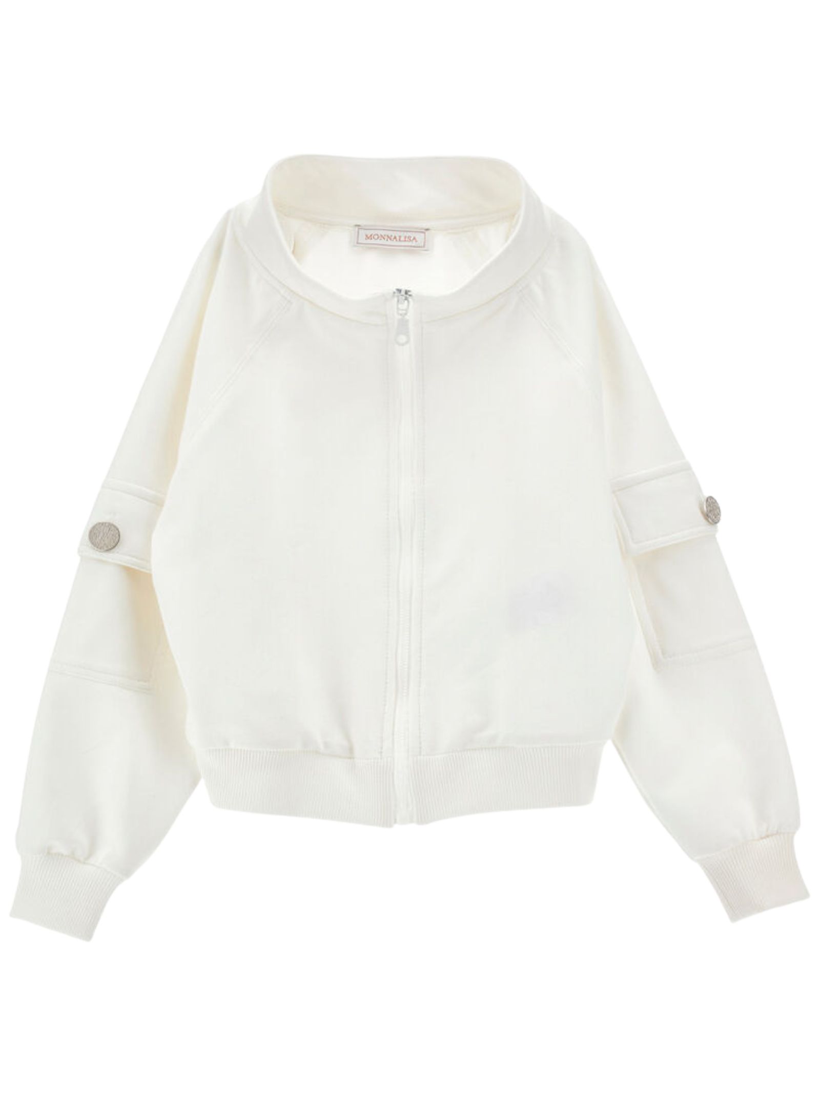Monnalisa Kids felpa di colore bianco, design con colletto rialzato, maniche lunghe, due tasconi applicati sulle braccia, orli a costine. Composizione: 95% cotone 5% elastan