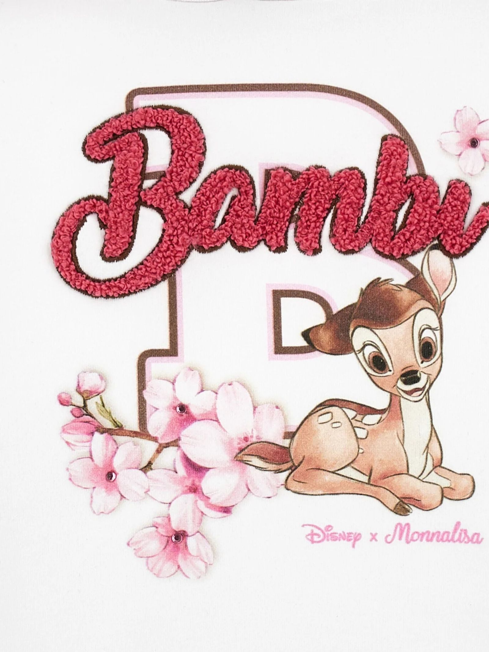 Monnalisa Kids felpa di colore bianco, modello con cappuccio, maniche lunghe, stampa centrale Bambi multicolor con applicazione strass, orli a costine, due spacchi laterali, vestibilità regolare. Composizione: 94% cotone 6% elastan