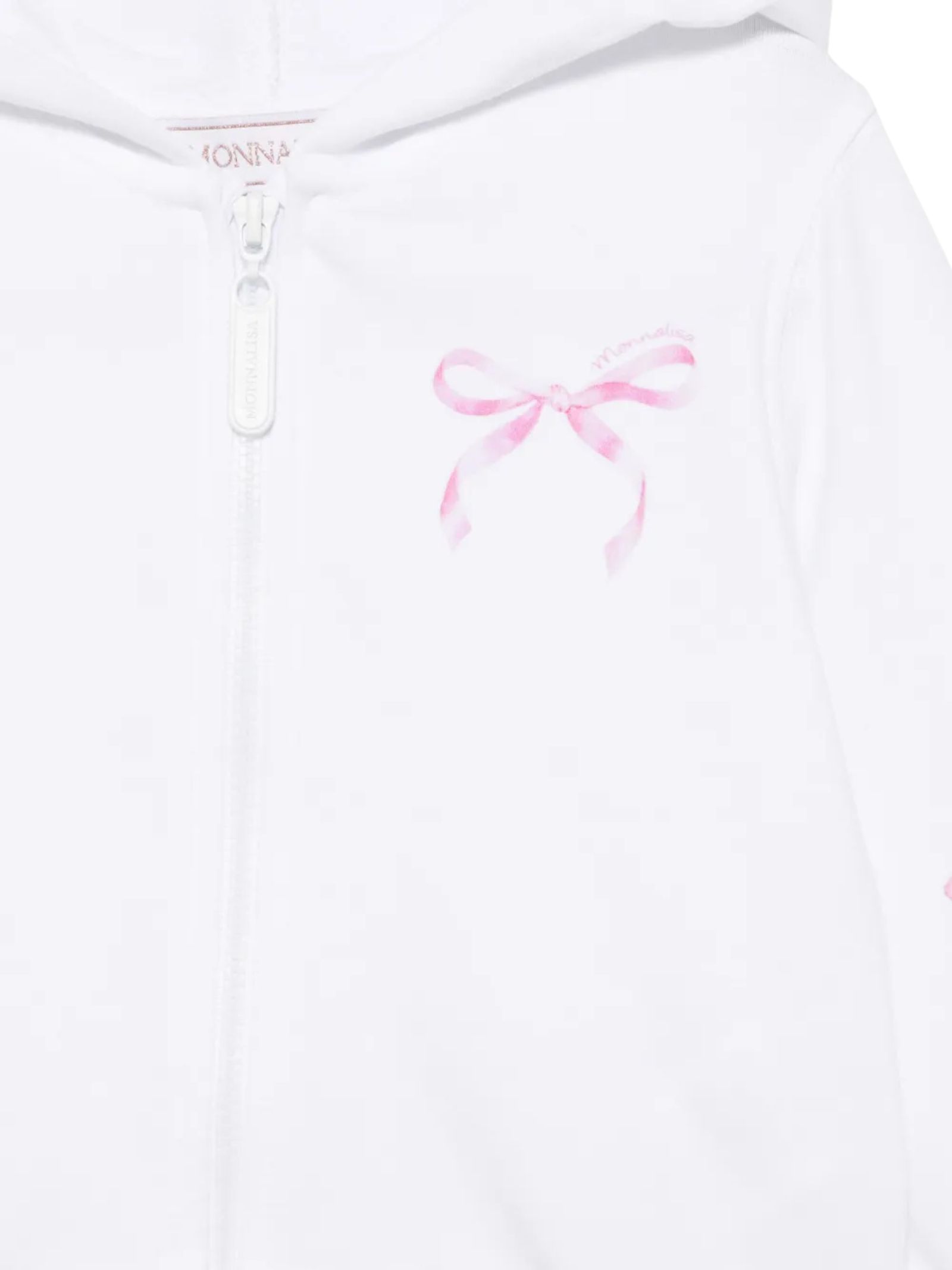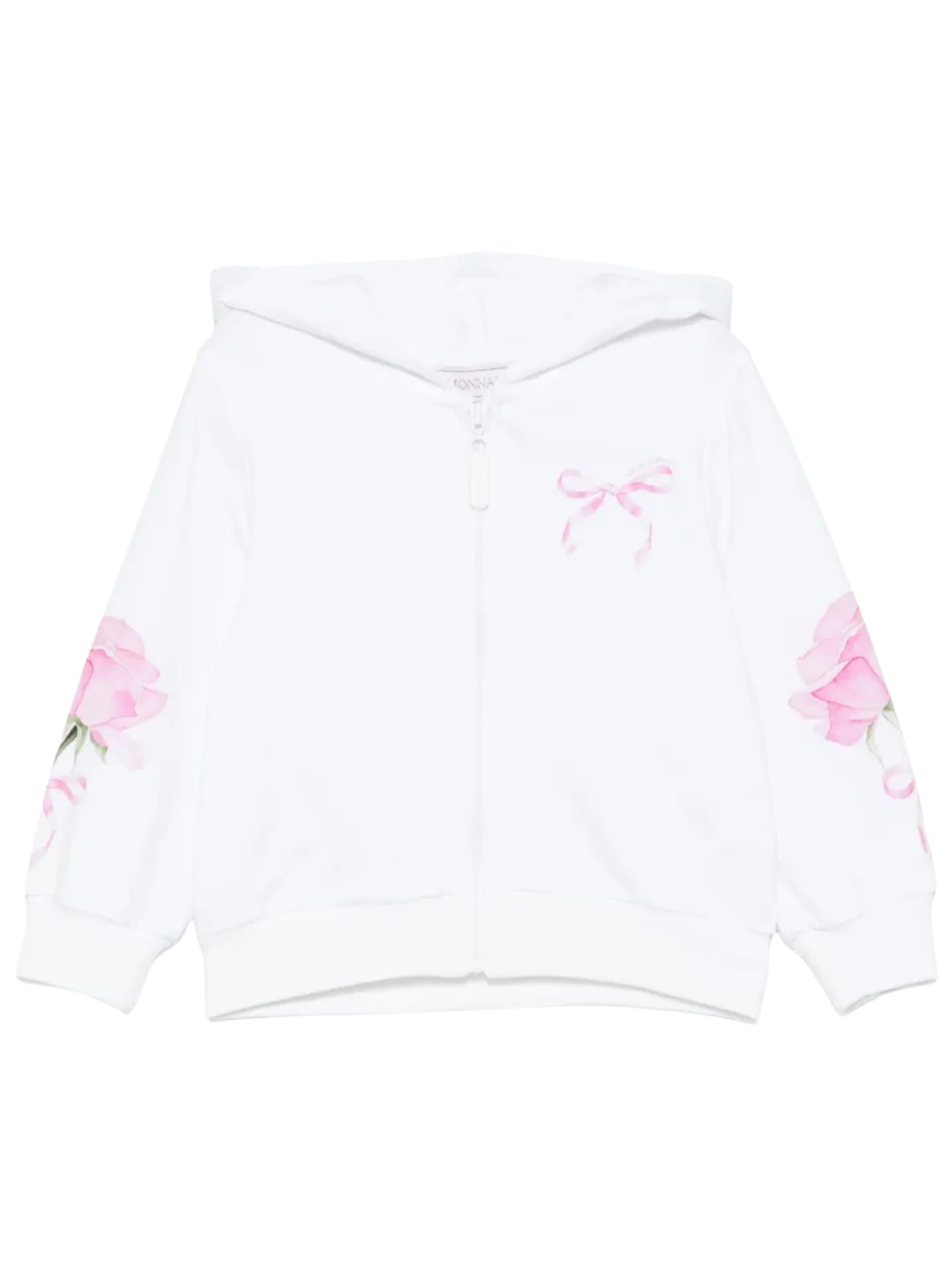 Monnalisa Kids felpa di colore bianco, modello con cappuccio, zip centrale, stampa fiori sui gomiti e sul petto a contrasto con logo, orli a costine, vestibilità regolare. Composizione: 95% cotone 5% elastan