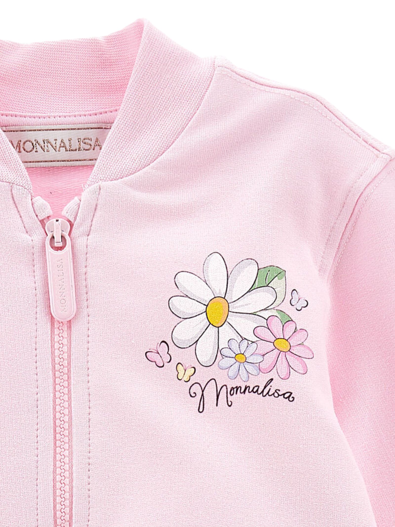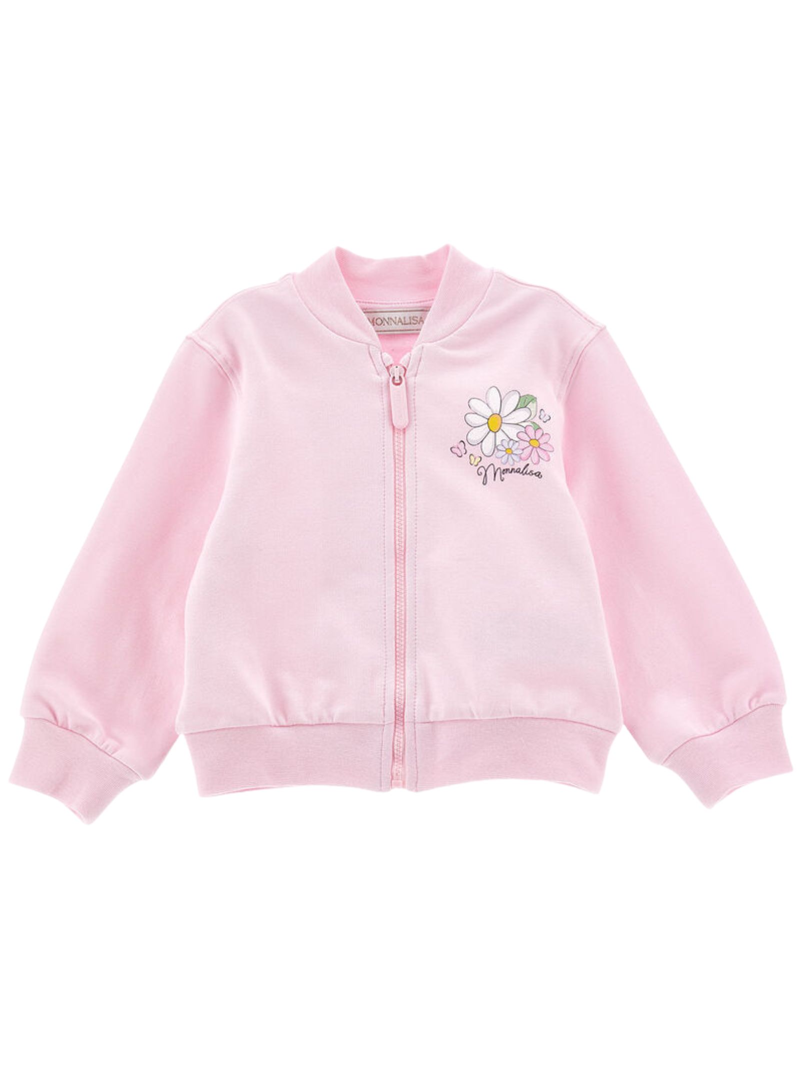 Monnalisa Kids felpa di colore rosa, modello senza collo, zip centrale, stampa fiori sul petto a contrasto con logo, orli a costine, vestibilità regolare. Composizione: 95% cotone 5% elastan