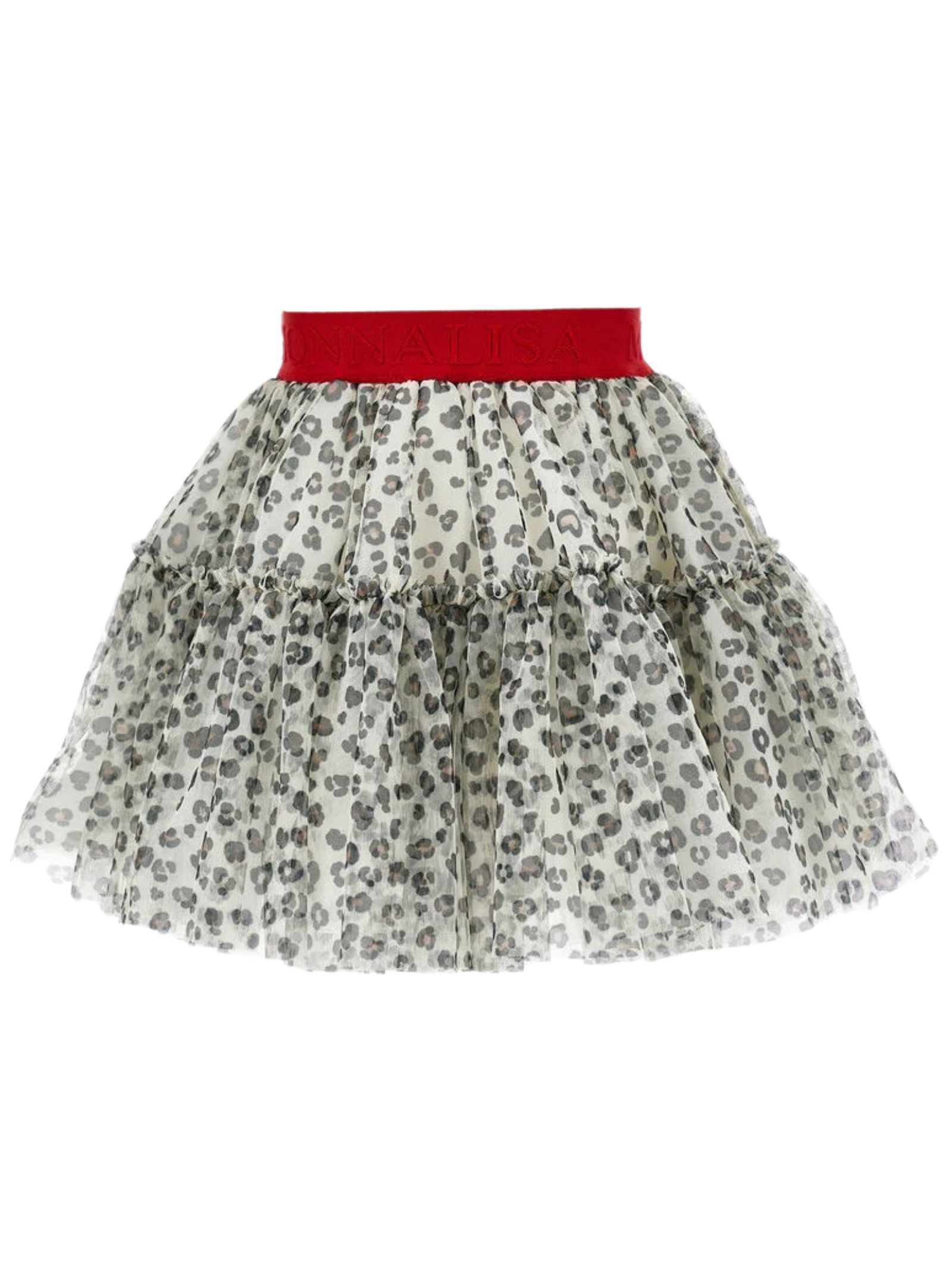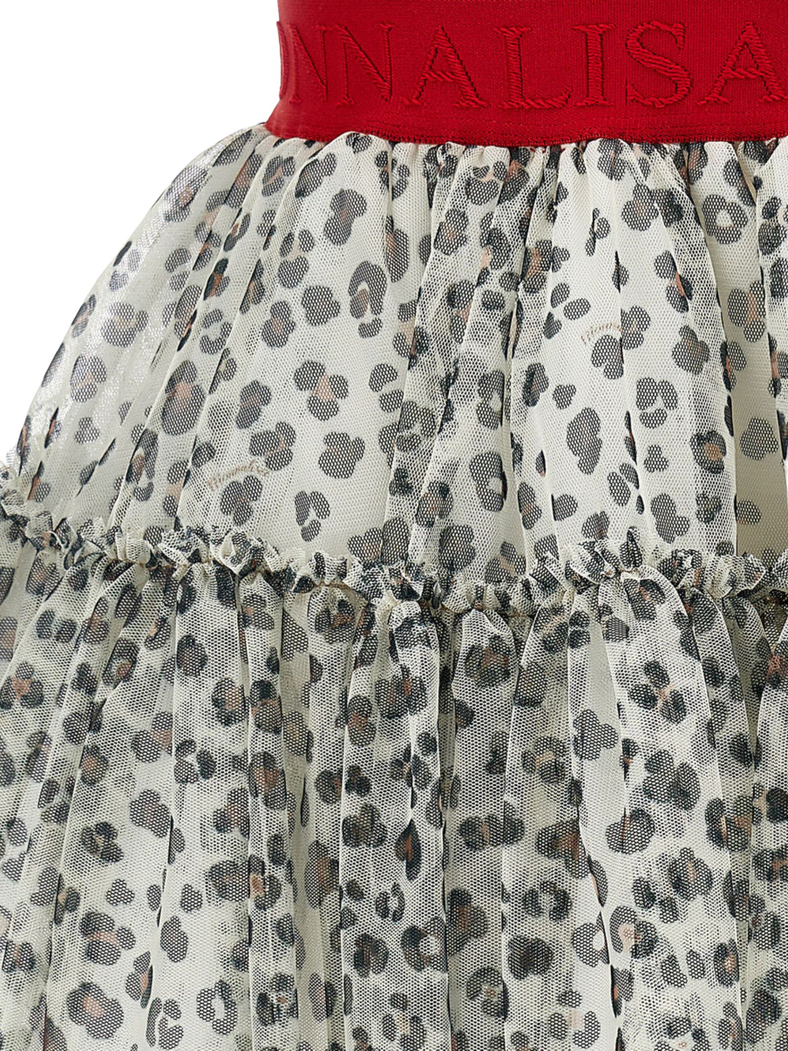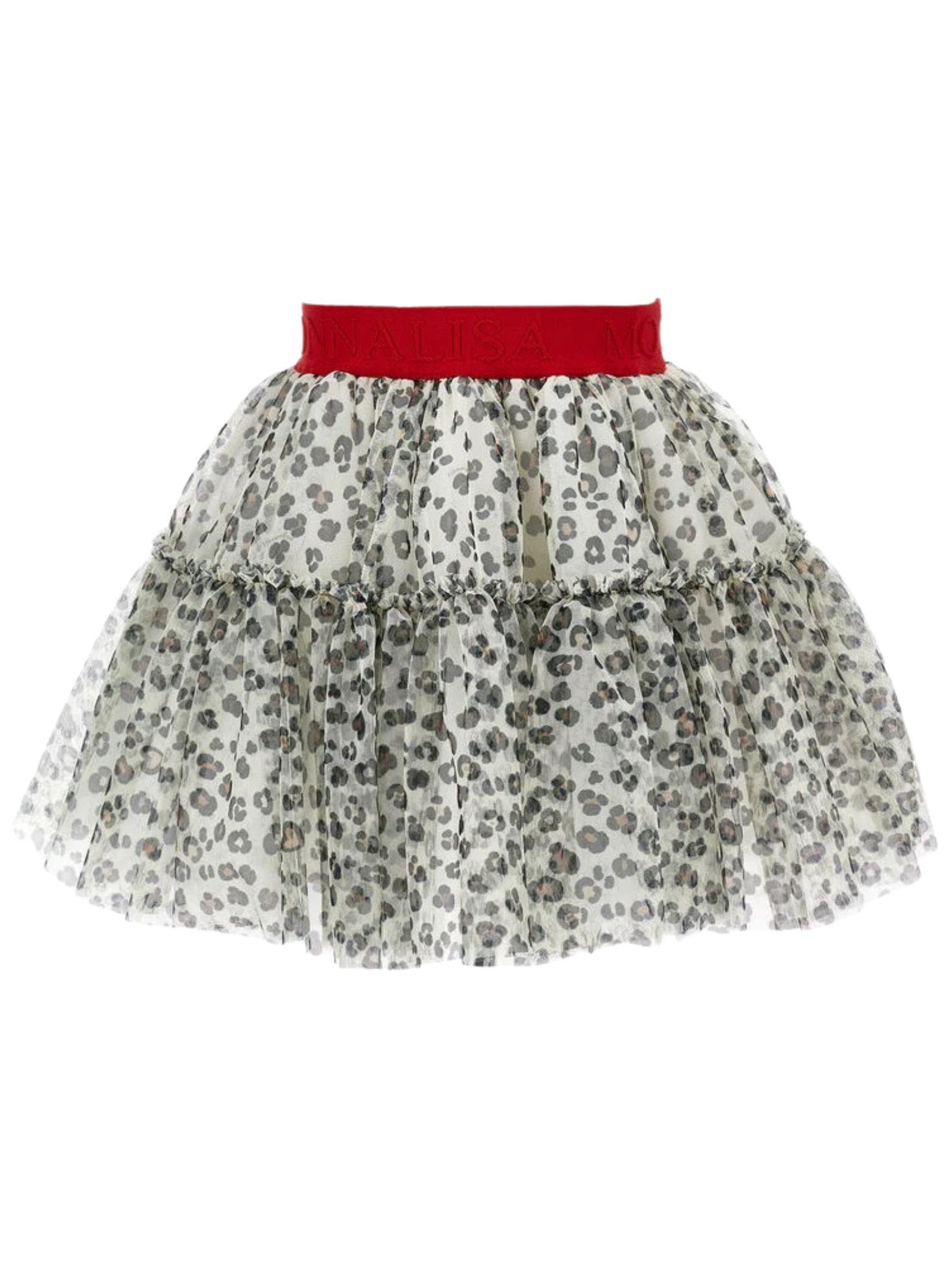 Monnalisa Kids gonna realizzata in tulle con stampa maculato, presenta un cinturino elastico rosso in vita con logo Monnalisa ricamato, design leggero e vaporoso, foderata in mussola di cotone. Composizione: Poliestere 100%. Fodera: 100% cotone
