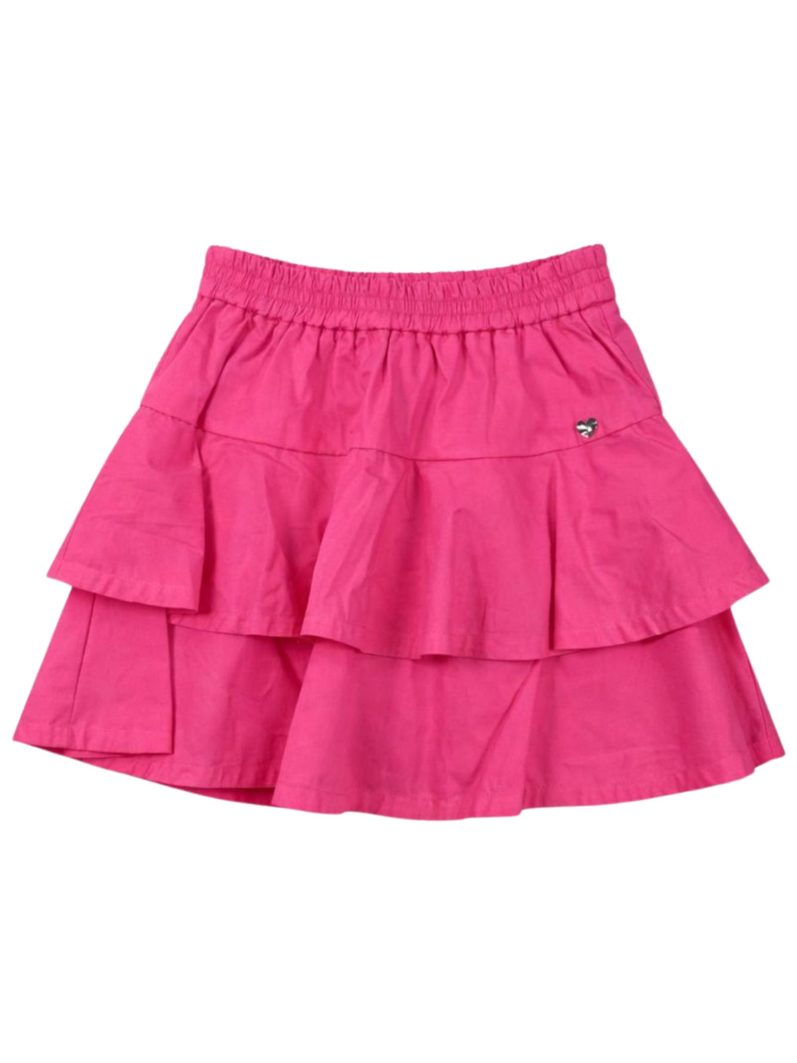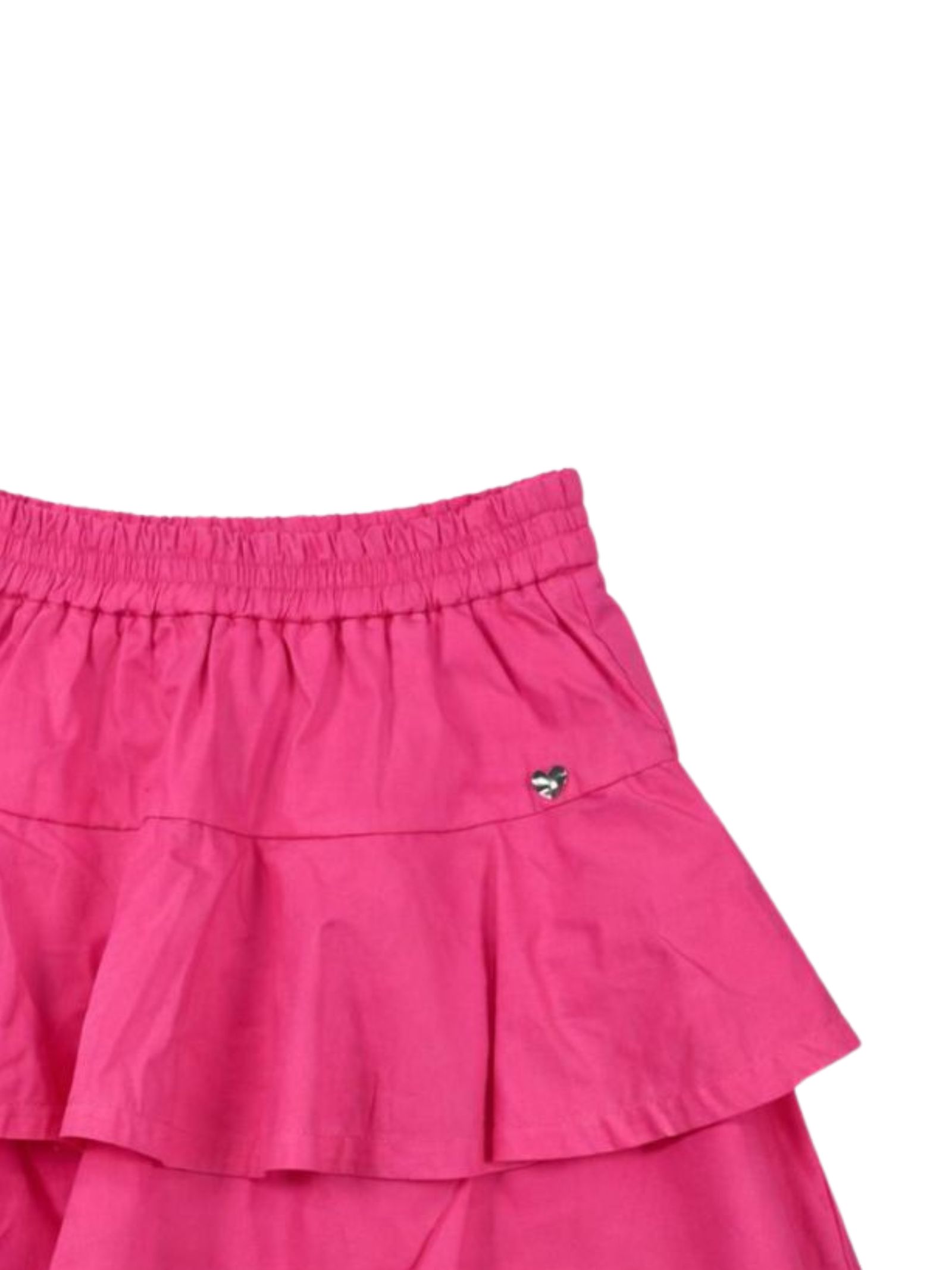 Monnalisa Kids gonna di colore rosa fluo, modello a pantaloncino con elastico in vita, vari strati, applicazione cuore in metallo con logo, design svasato. Composizione: 71% cotone 26% nylon 3% elastan. Fodera: 100% cotone. Made in Italy