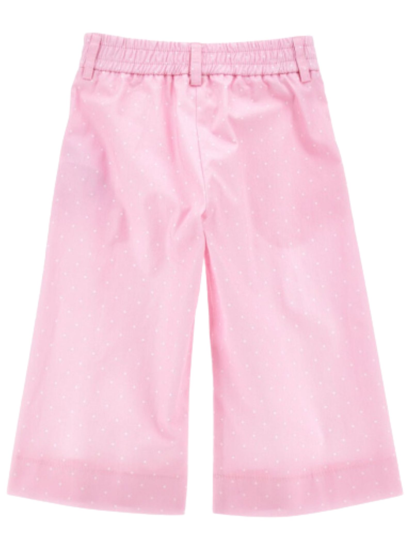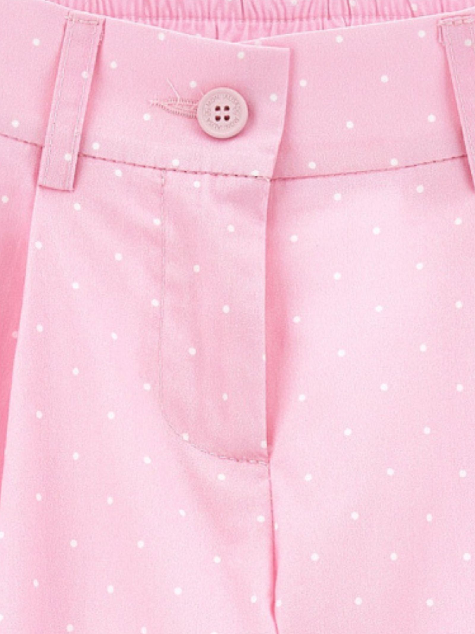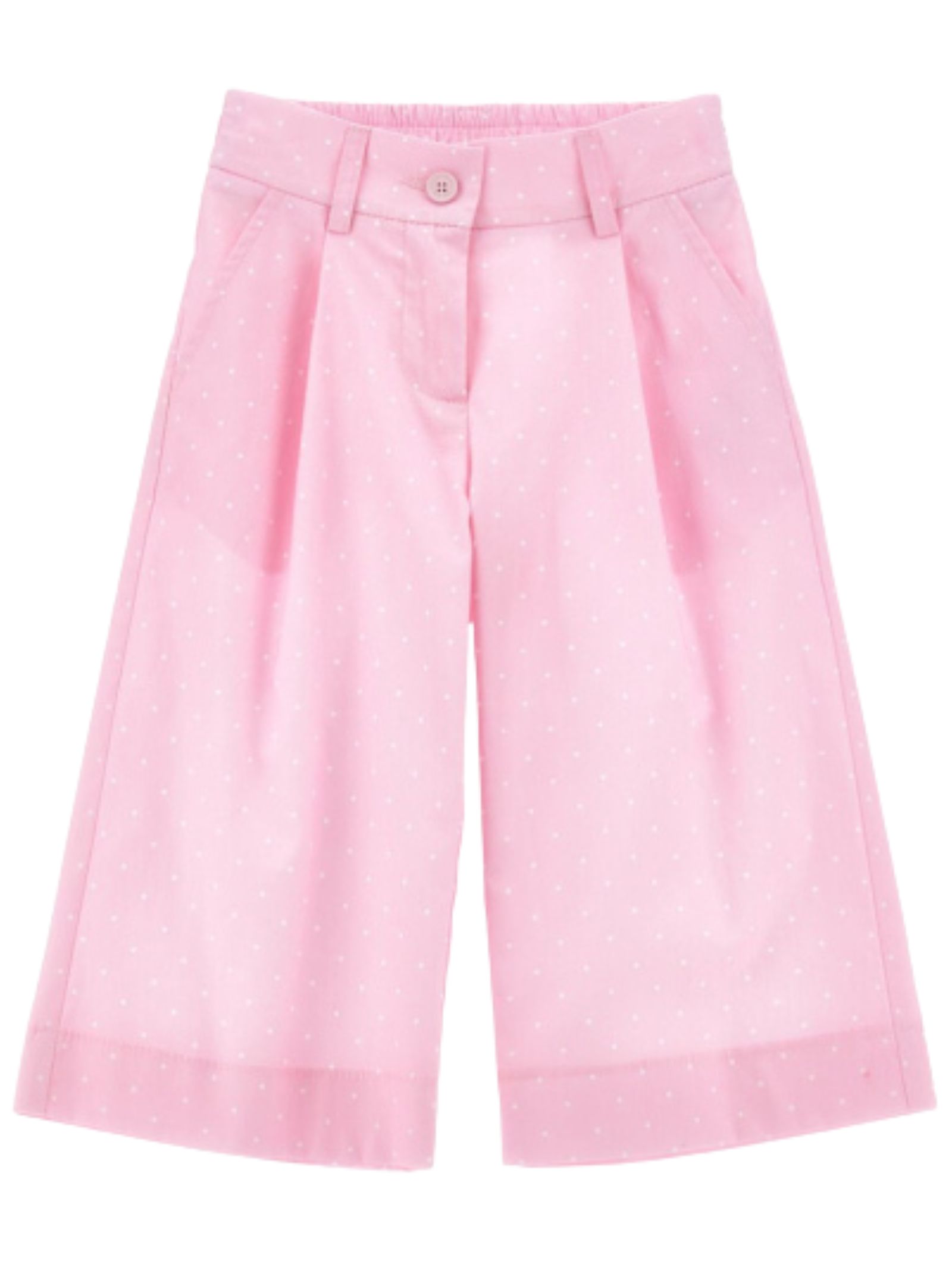 Monnalisa Kids pantalone di colore rosa/bianco in fantasia a pois, vita regolare con passanti, elastico sul retro, fodera in cotone, vestibilità gamba ampia. Composizione: 100% cotone. Made in Italy