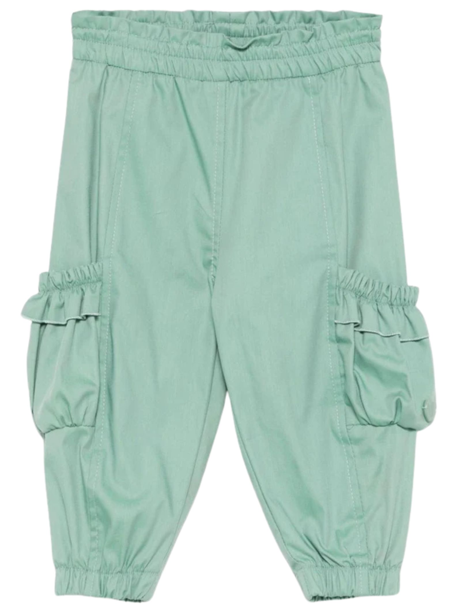 Monnalisa Kids pantalone di colore verde, realizzato in cotone stretch con elastico in vita, tasche laterali con elastico e rouches applicate, logo cuore a rilievo applicato, caviglie elastiche. Composizione: 71% cotone 26% poliammide 3% elastan. Made in Italy