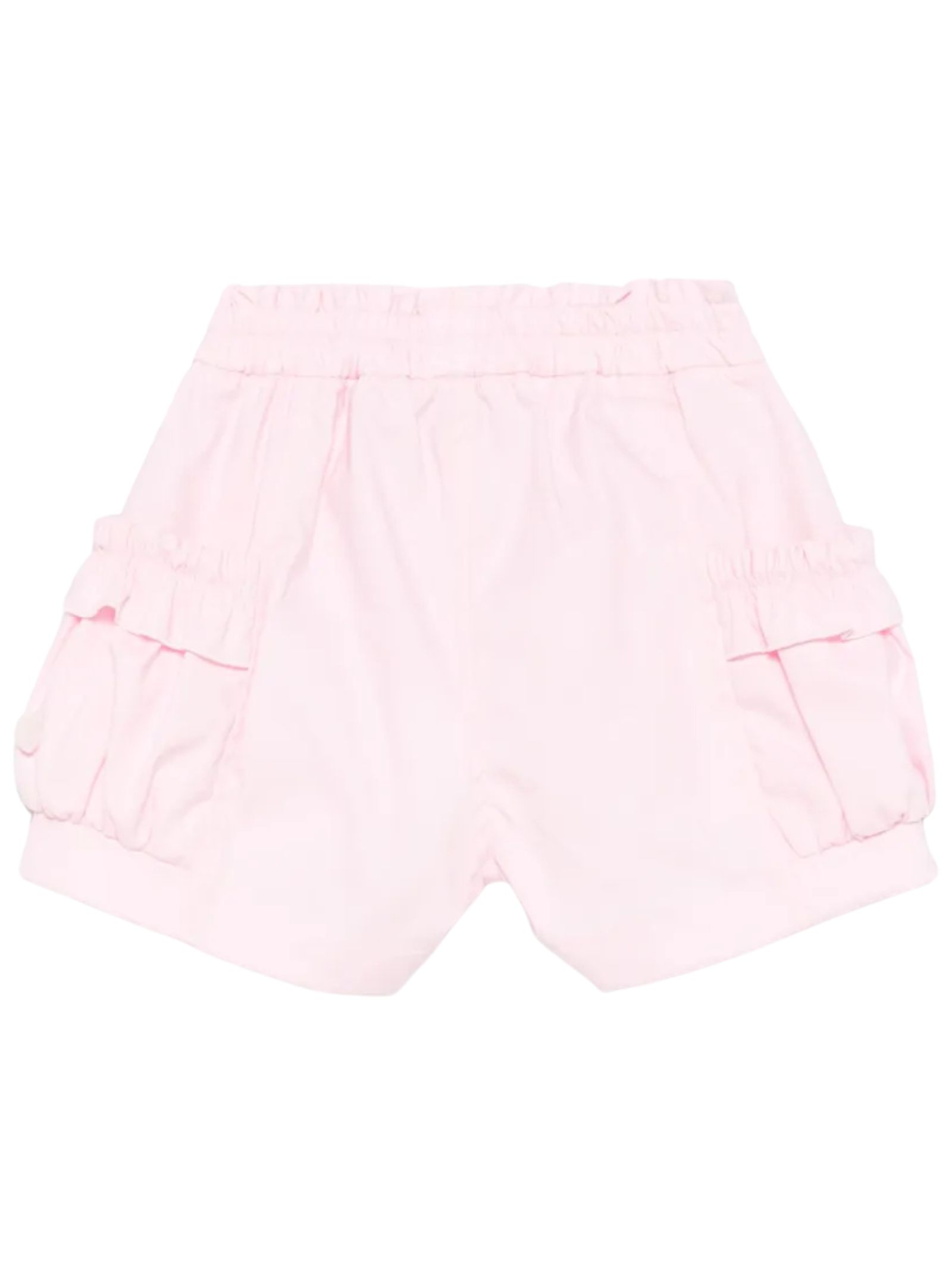 Monnalisa Kids shorts di colore rosa, realizzato in cotone stretch con elastico in vita, tasche laterali con elastico e rouches applicate, logo cuore a rilievo applicato. Composizione: 71% cotone 26% poliammide 3% elastan. Made in Italy