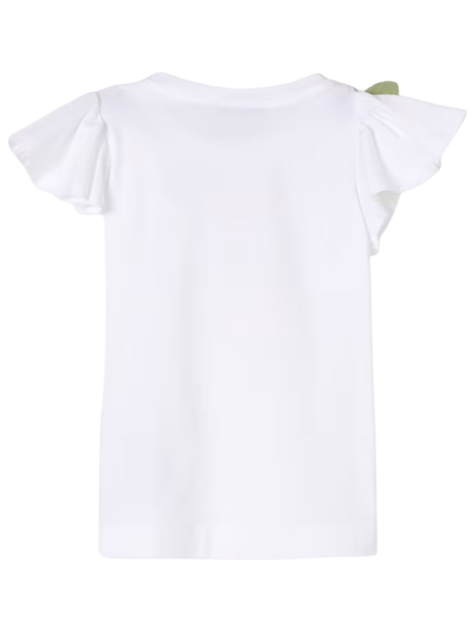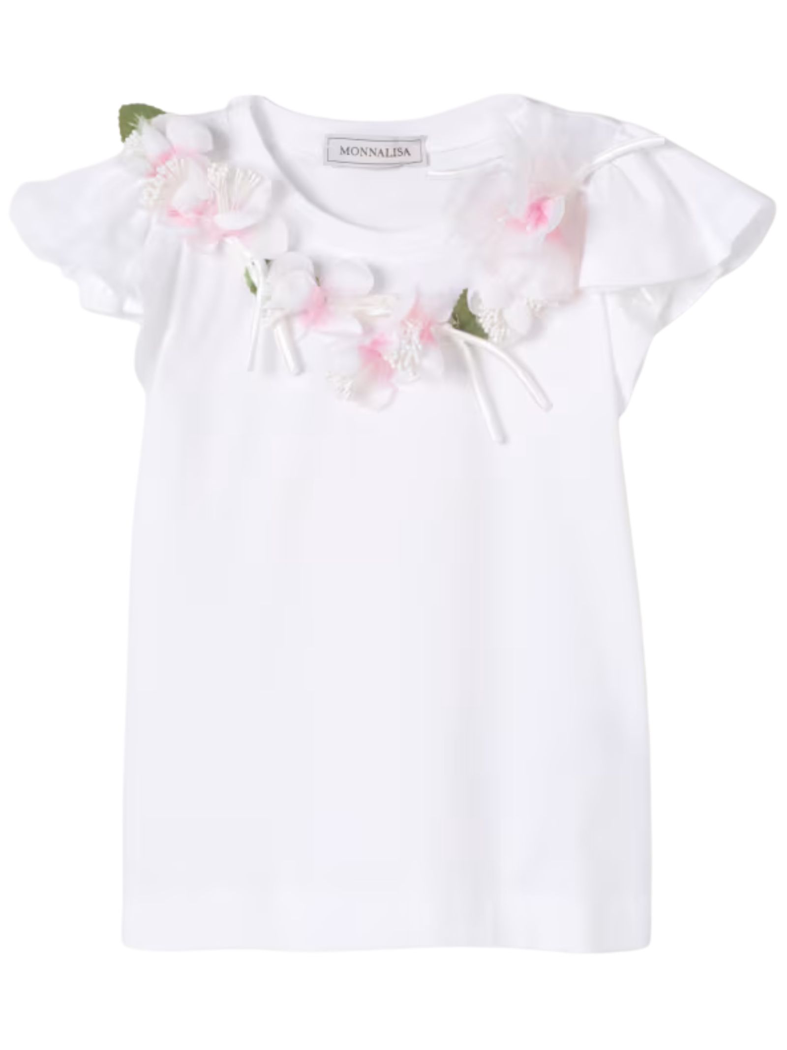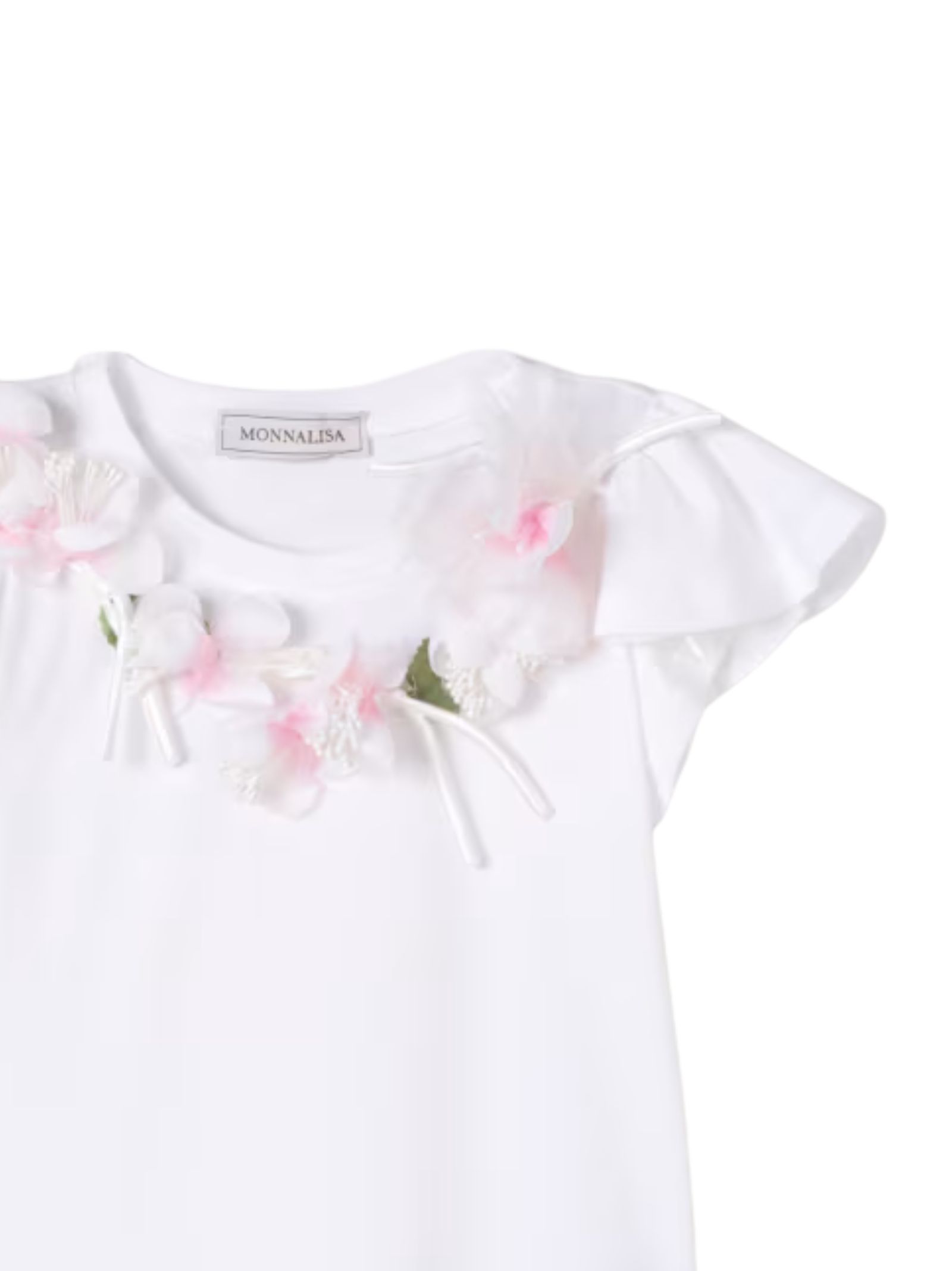 Monnalisa Kids t-shirt di colore bianco, realizzata in morbido cotone organico, modello regular con maniche ad aletta con rouche, applicazione collana di fiori di pesco removibile aggiunge un tocco di eleganza e romanticismo al look. Composizione: 95% cotone 5% elastan. Made in Italy