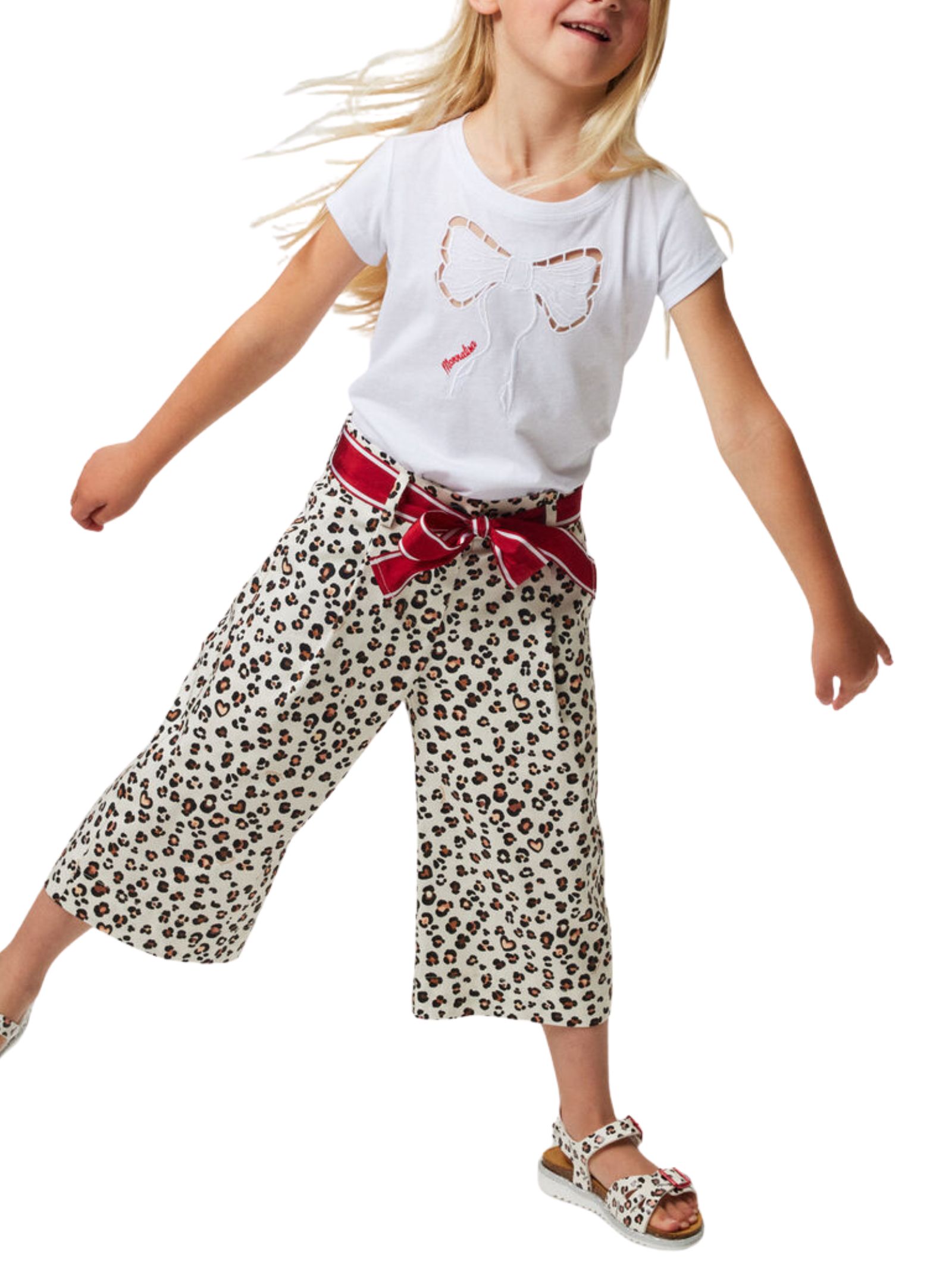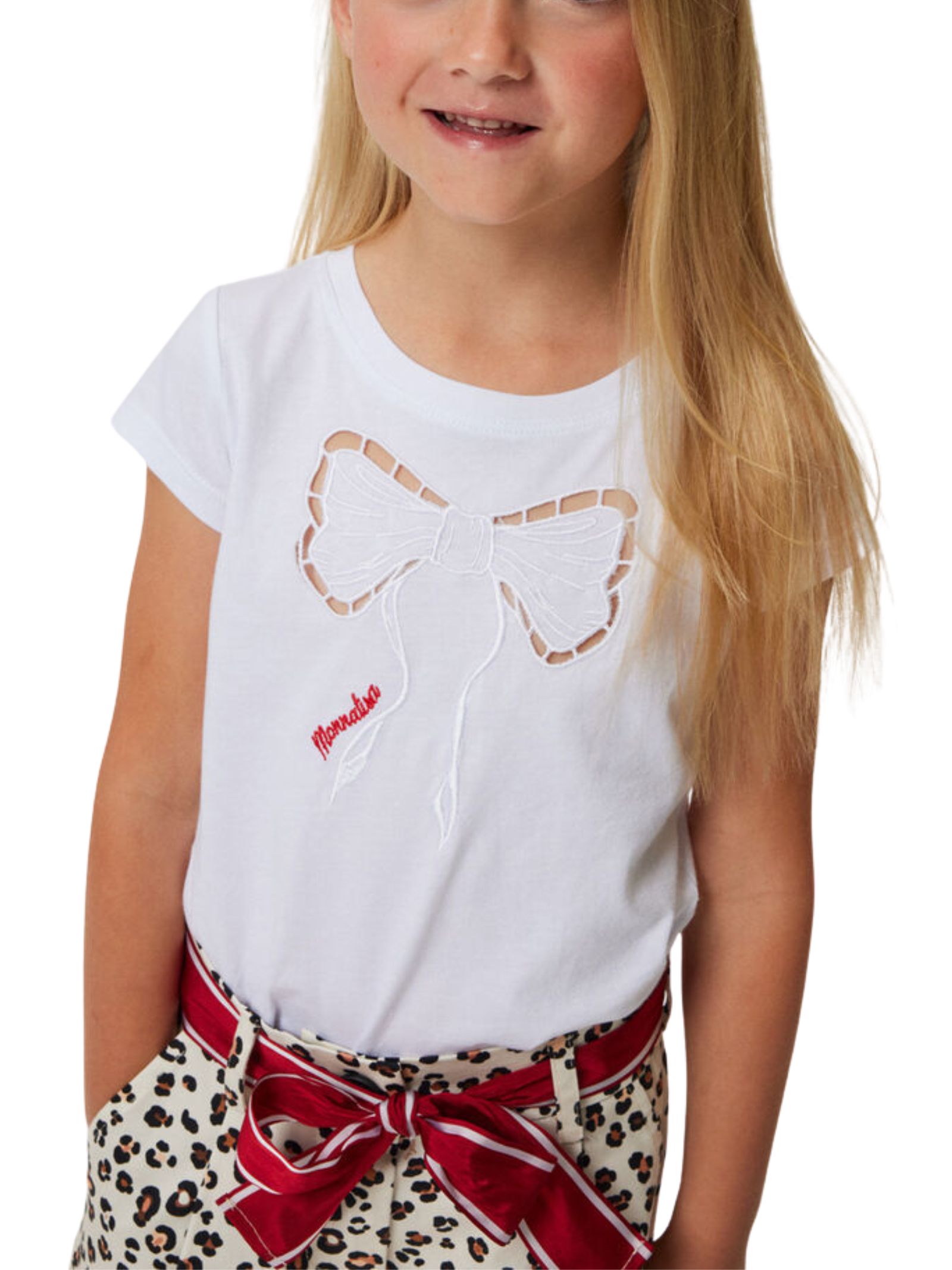 Monnalisa Kids t-shirt di colore bianco, modello girocollo, mezze maniche, fiocco centrale traforato con ricamo logo a contrasto rosso, vestibilità regolare. Composizione: 94% cotone 6% elastan