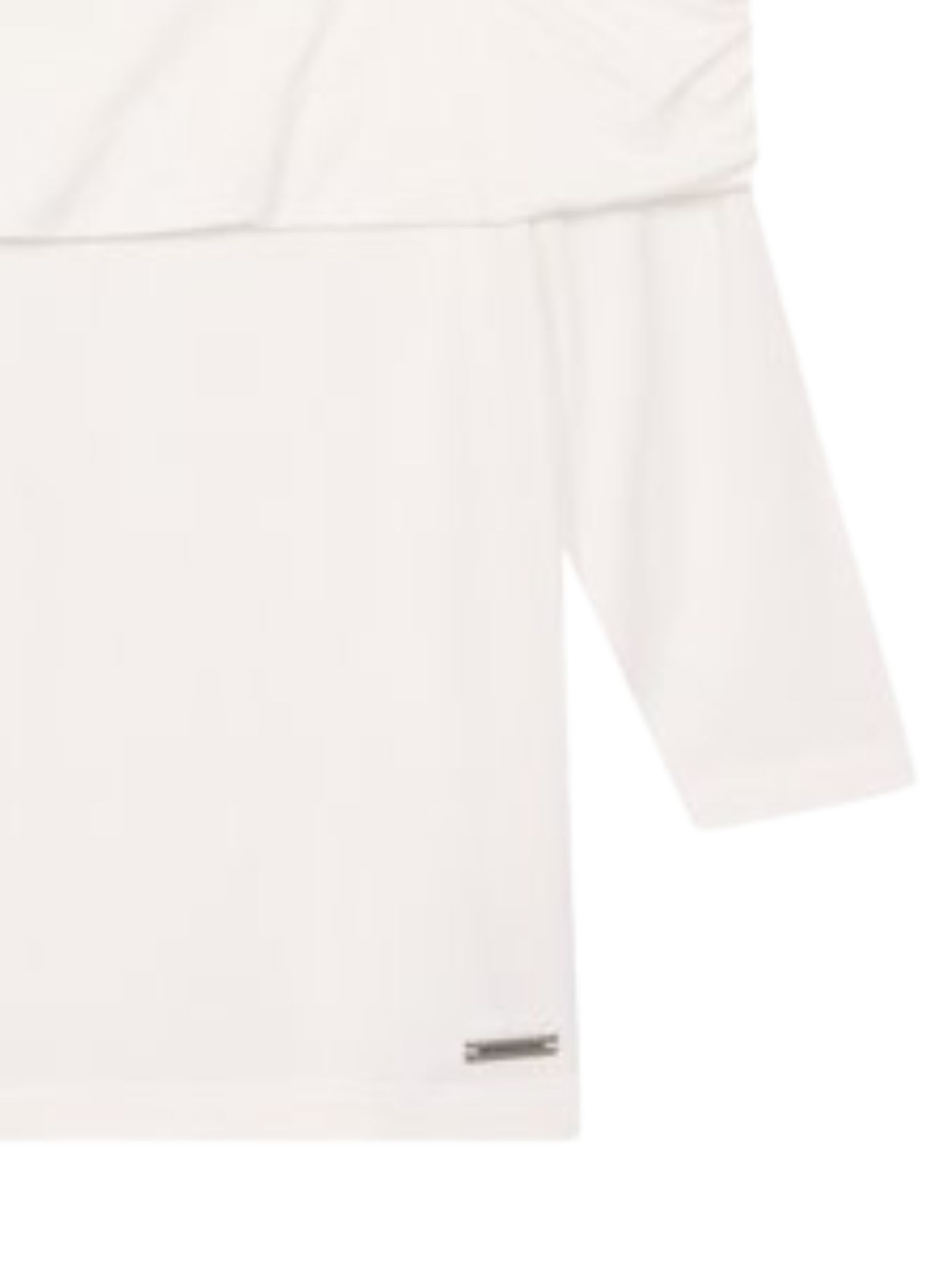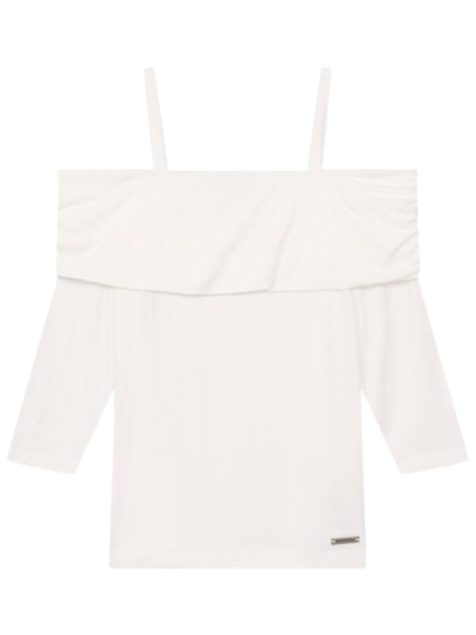 Monnalisa Kids t-shirt di colore bianco, design con scollatura ampia, maniche lunghe, bretelle, applicazione logo in metallo, vestibilità aderente. Composizione: 95% modal 5% elastan. Made in Italy
