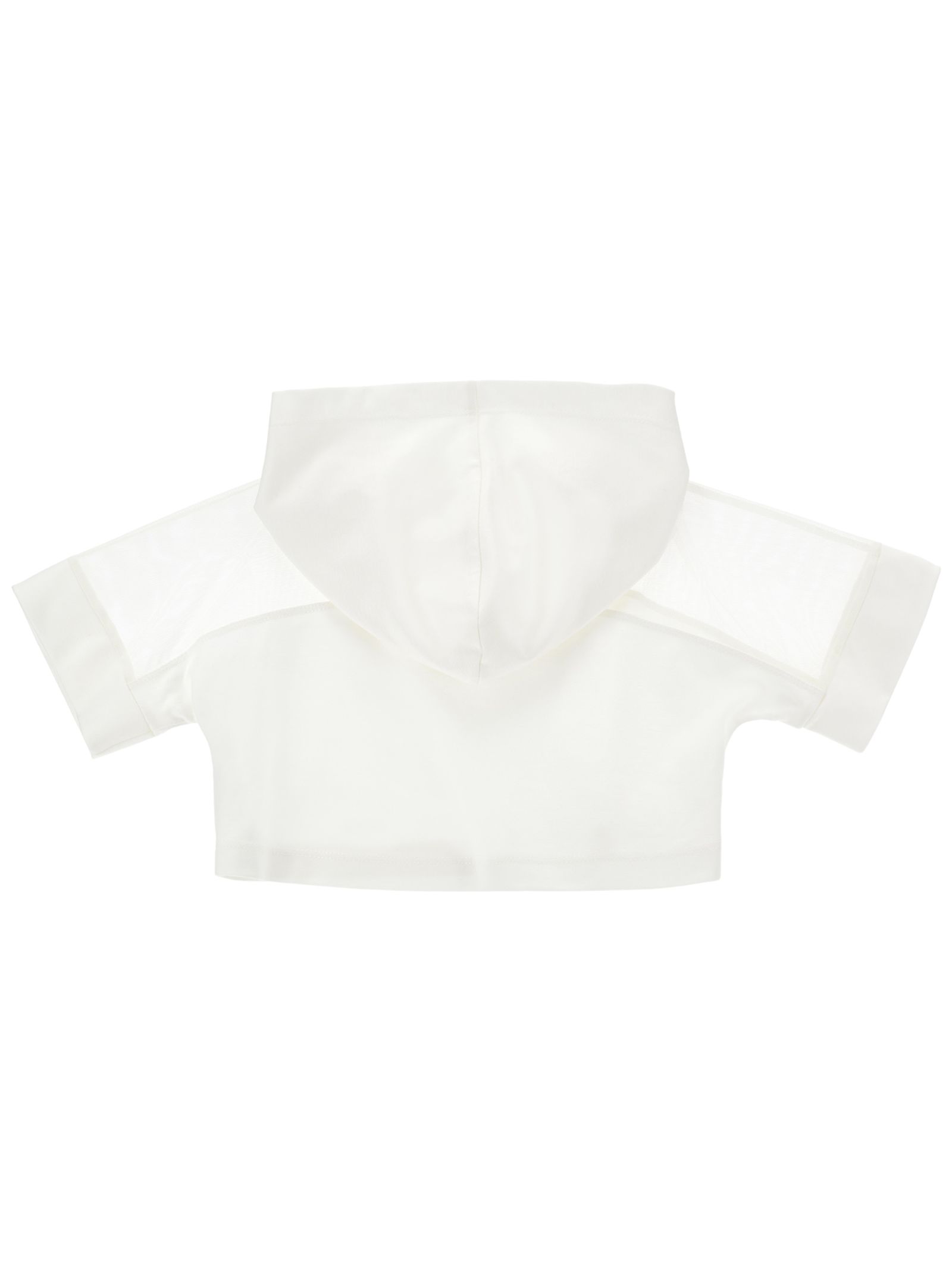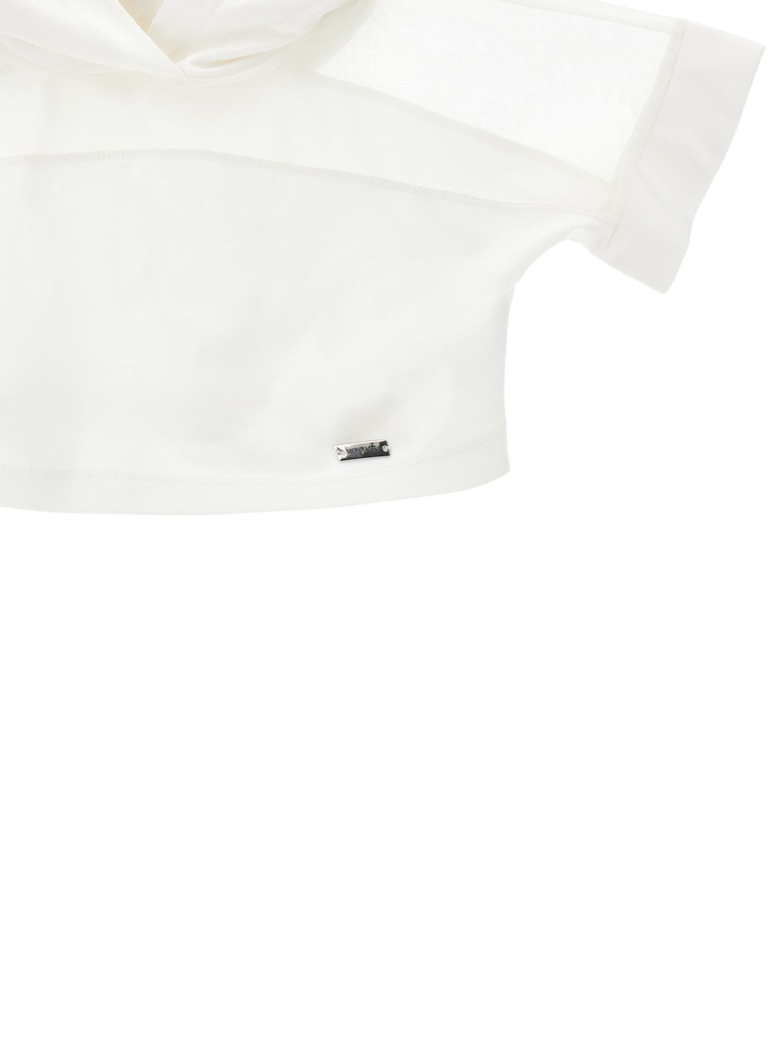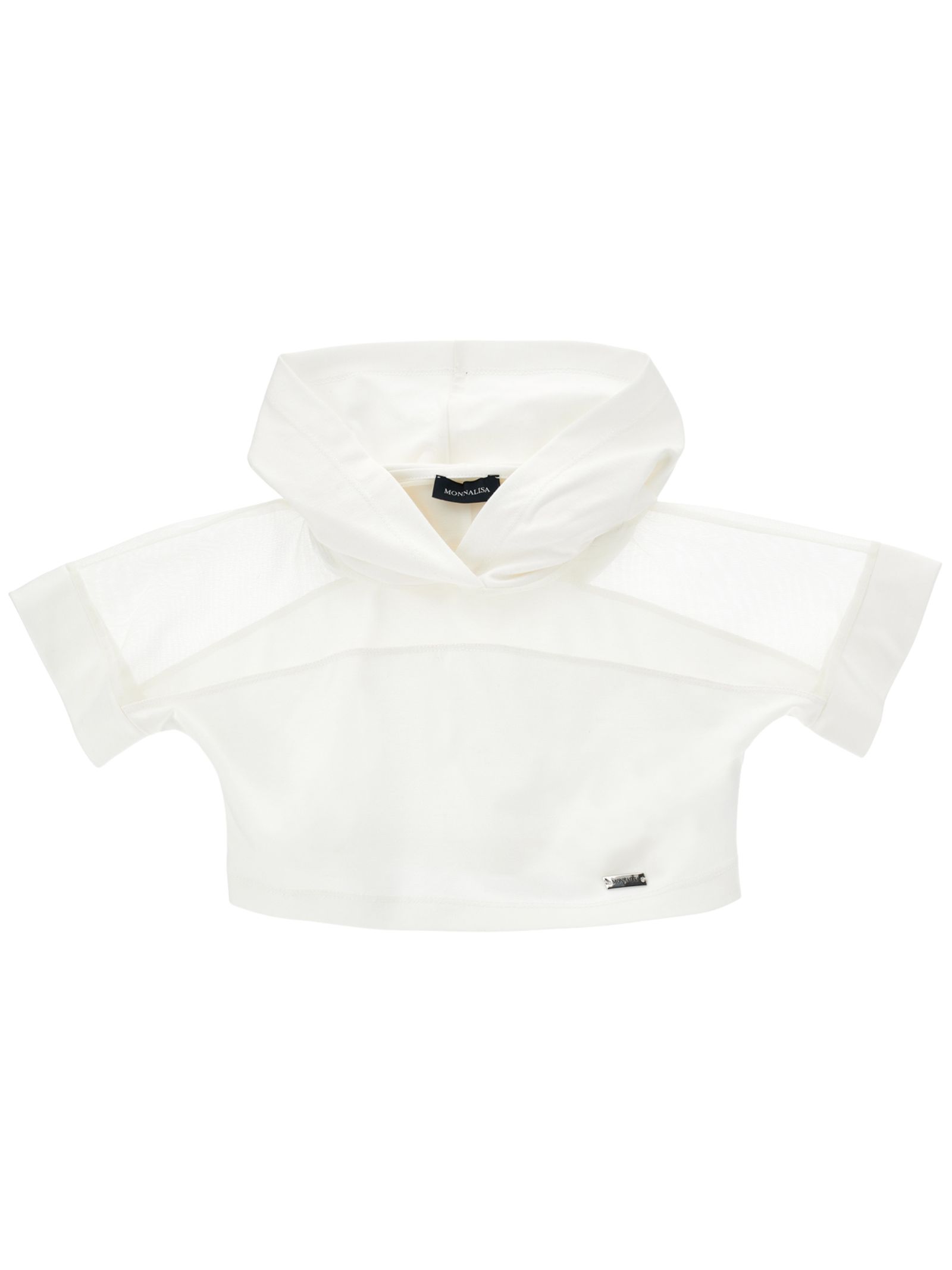 Monnalisa Kids t-shirt di colore bianco, modello corto, con cappuccio, mezza manica, inserto in velo, applicazione targhetta in metallo con logo, vestibilità regolare. Composizione: 65% viscosa 28% poliammide 7% elastan. Made in Italy