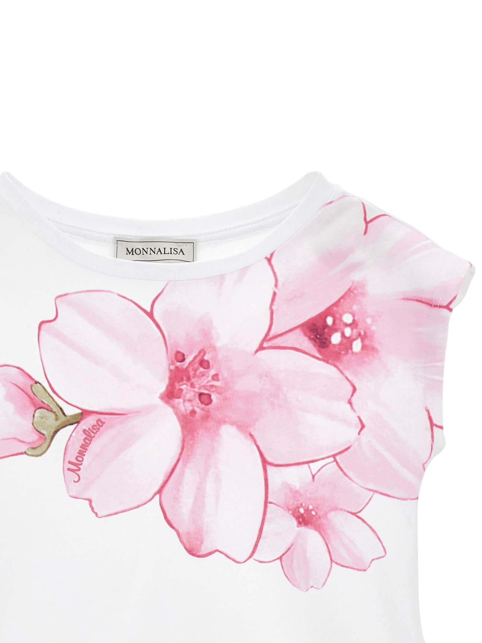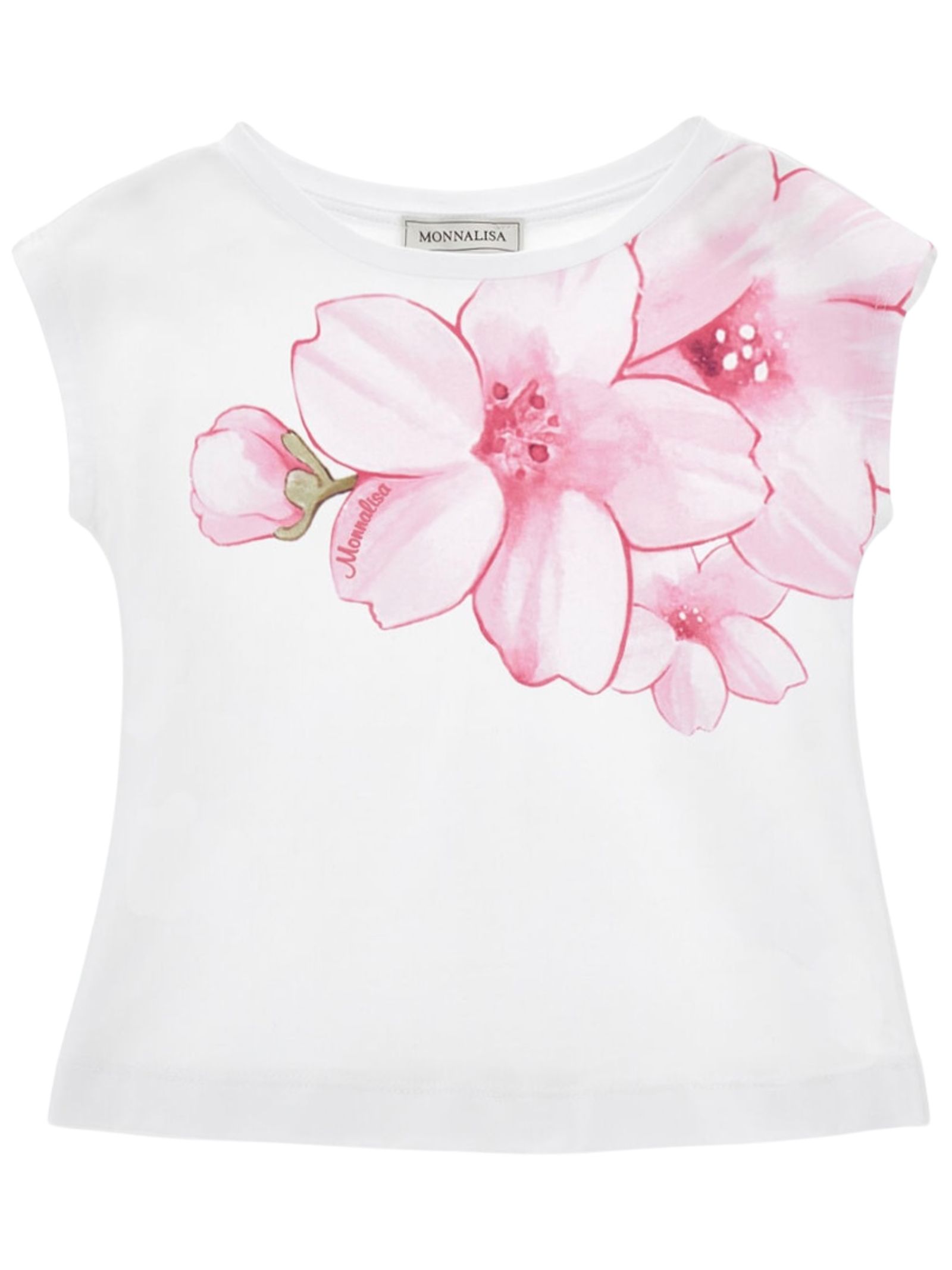 Monnalisa Kids t-shirt di colore bianco, realizzata in morbido cotone organico, modello girocollo, mezza manica accennata, stampa fiori a contrasto rosa. Composizione: 95% cotone 5% elastan