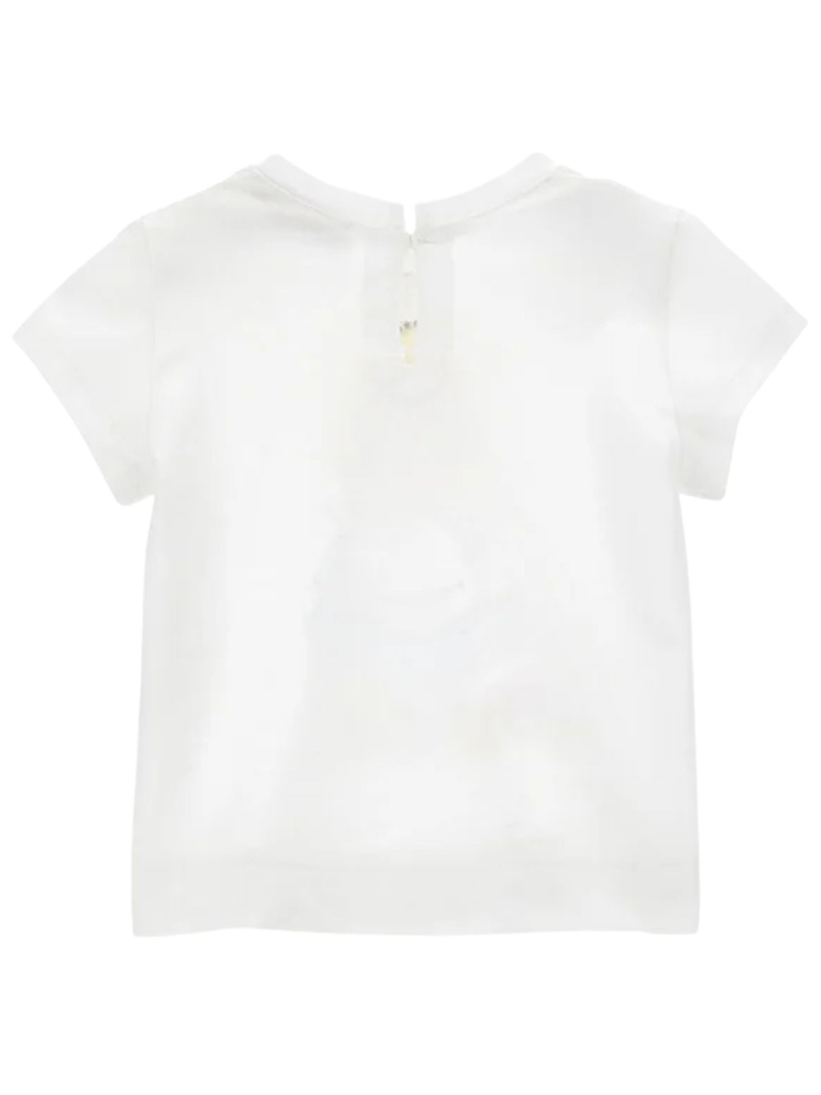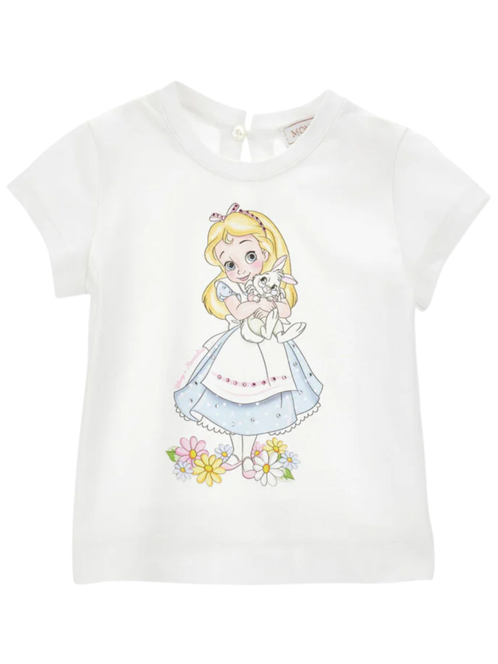 Monnalisa Kids t-shirt di colore bianco, modello girocollo, mezza manica, stampa Alice nel paese delle meraviglie con logo e applicazione strass, apertura con bottone sul retro, vestibilità regolare. Composizione: cotone 100%