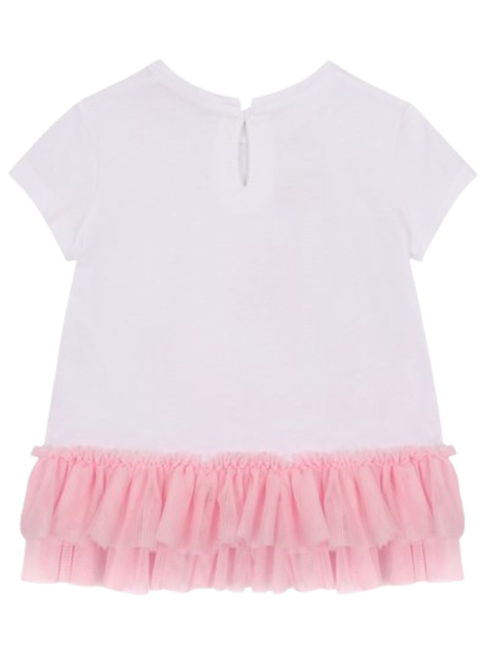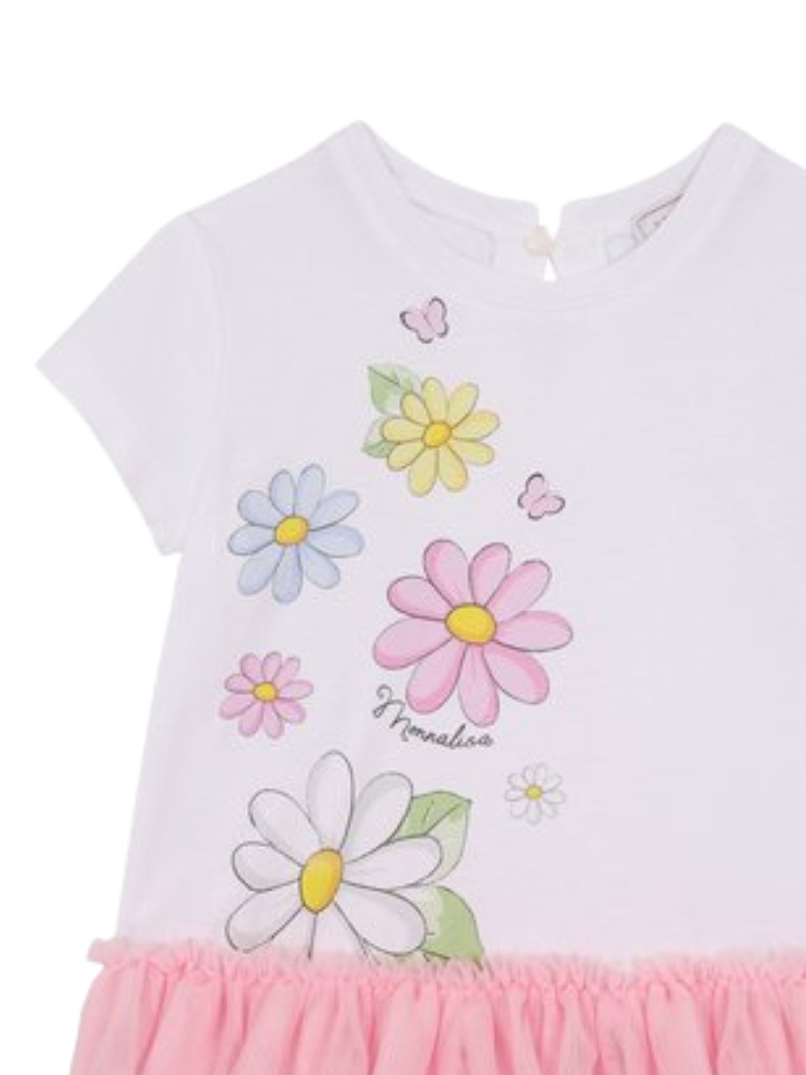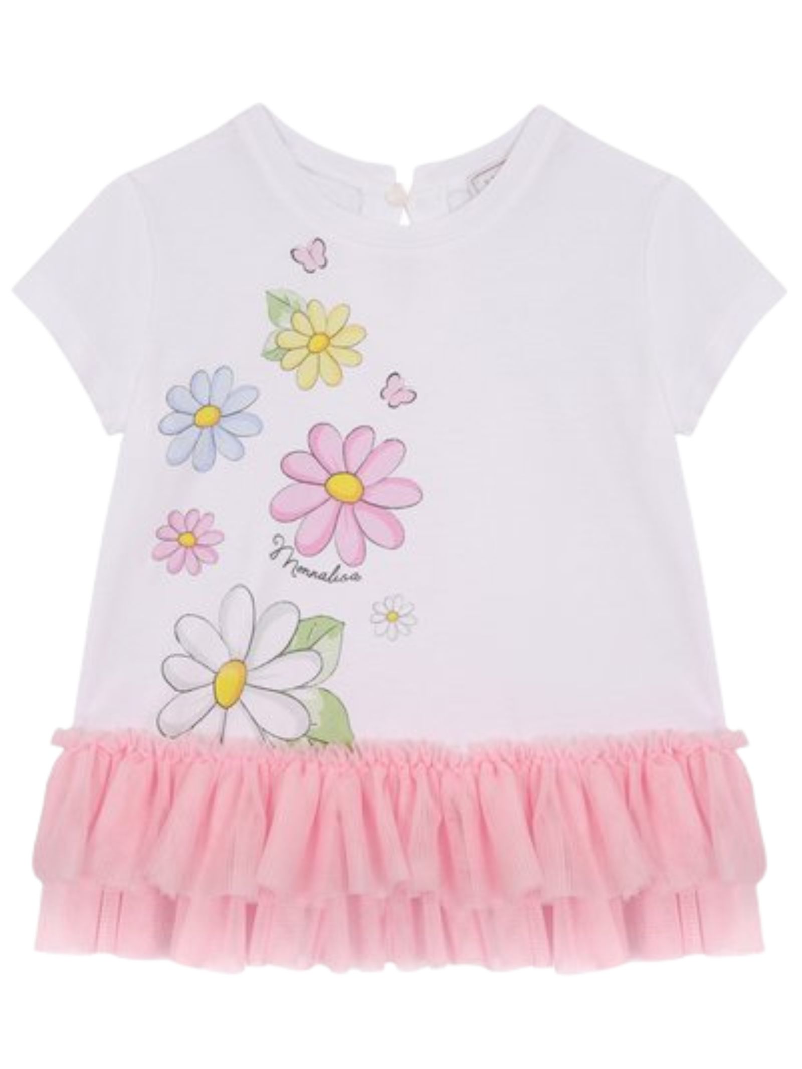 Monnalisa Kids maxi t-shirt di colore bianco, dettaglio rouches in velo a contrasto rosa, modello girocollo, mezza manica, stampa a contrasto con logo, apertura con bottoni a clip sul retro, vestibilità svasata. Composizione: 100% cotone