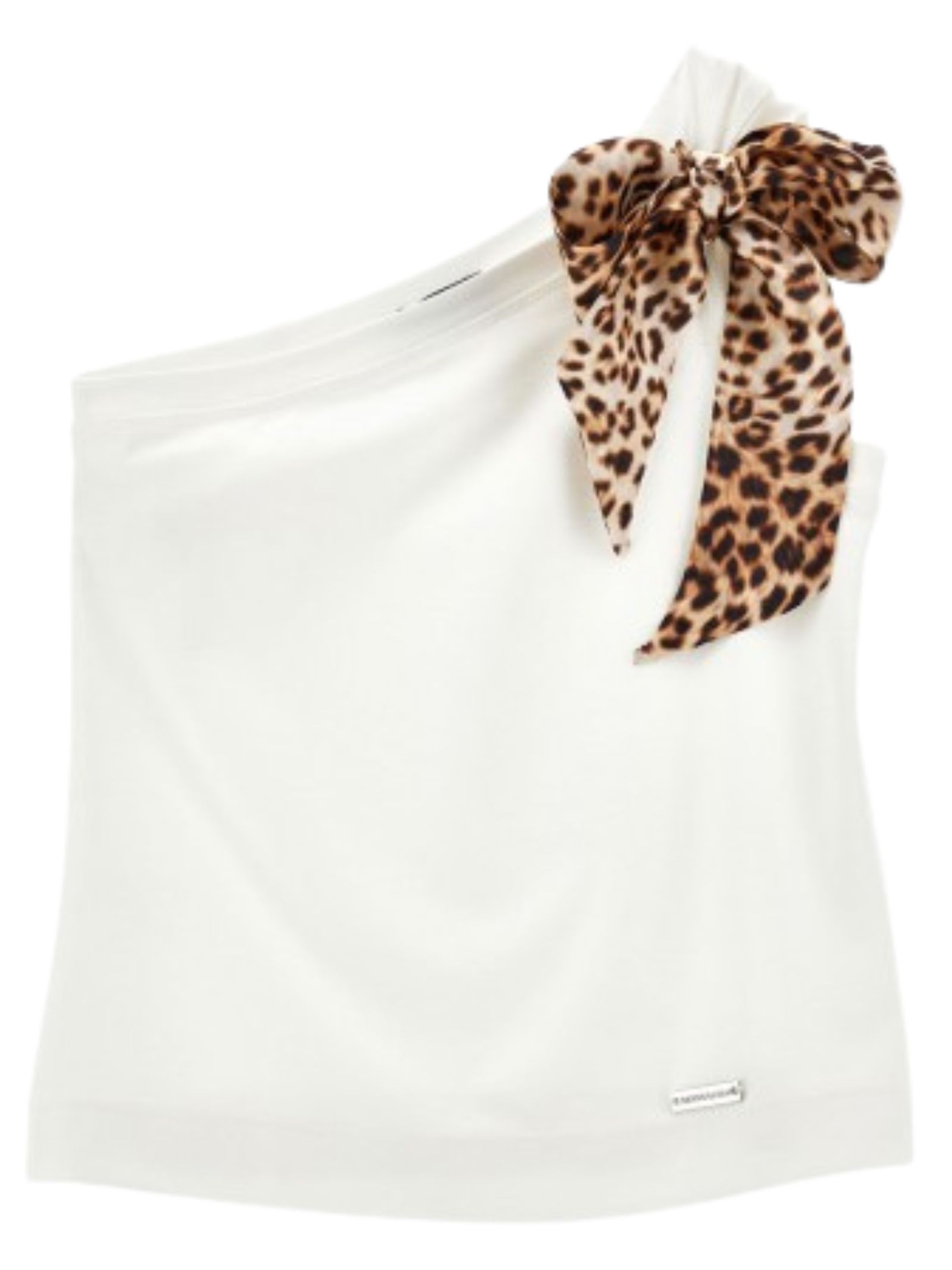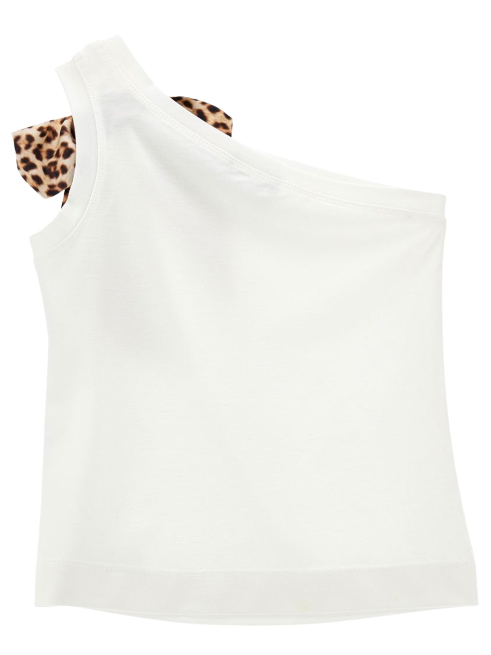 Monnalisa Kids top di colore bianco, modello senza maniche, monospalla con dettaglio fiocco in fantasia maculato, design aderente. Composizione: 65% viscosa 28% poliammide 7% elastan. Made in Italy