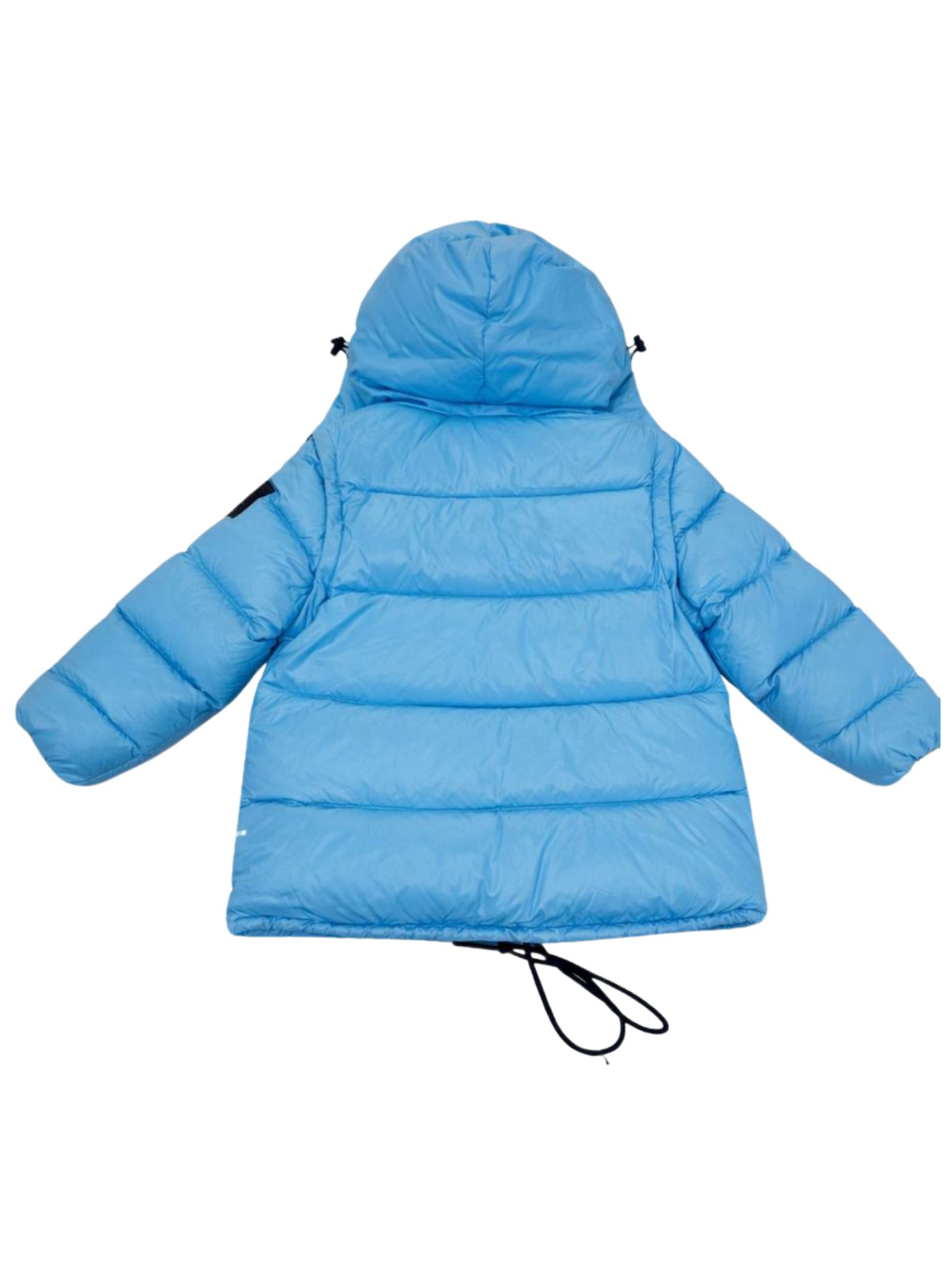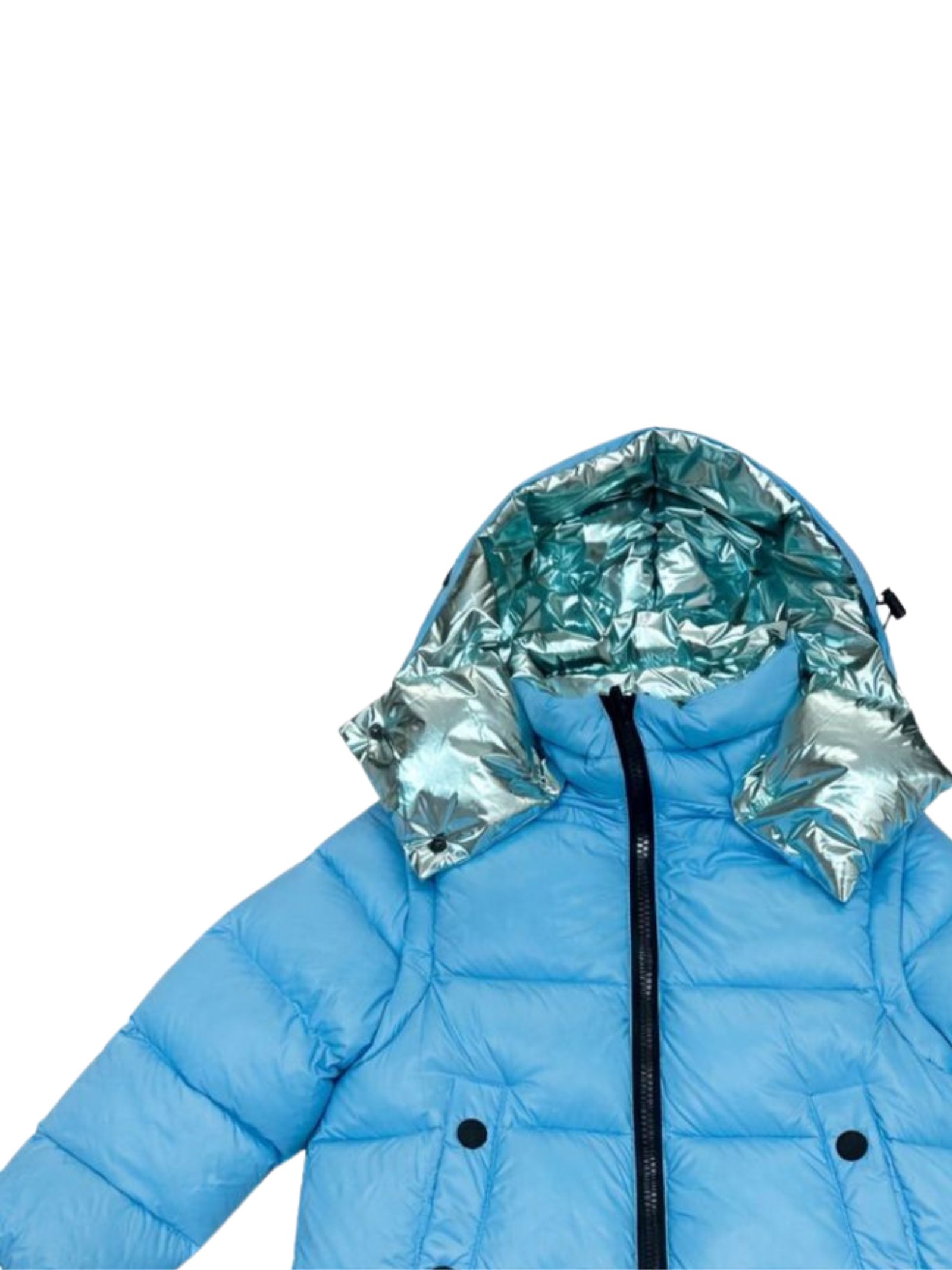 Montereggi Kids giubbino reversibile di colore azzurro/argento, cappuccio rimovibile con bottoni a pressione, maniche lunghe, chiusura frontale con zip, logo sulla manica, aperture laterali con bottoni a pressione, tasche con bottoni a pressione, tasche con zip. Composizione: 100% poliammide