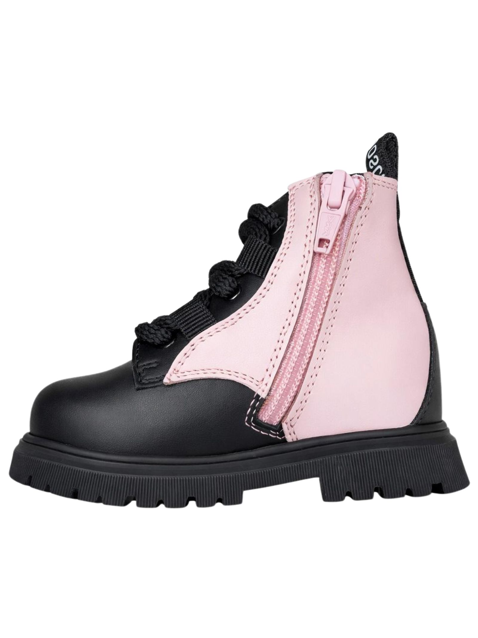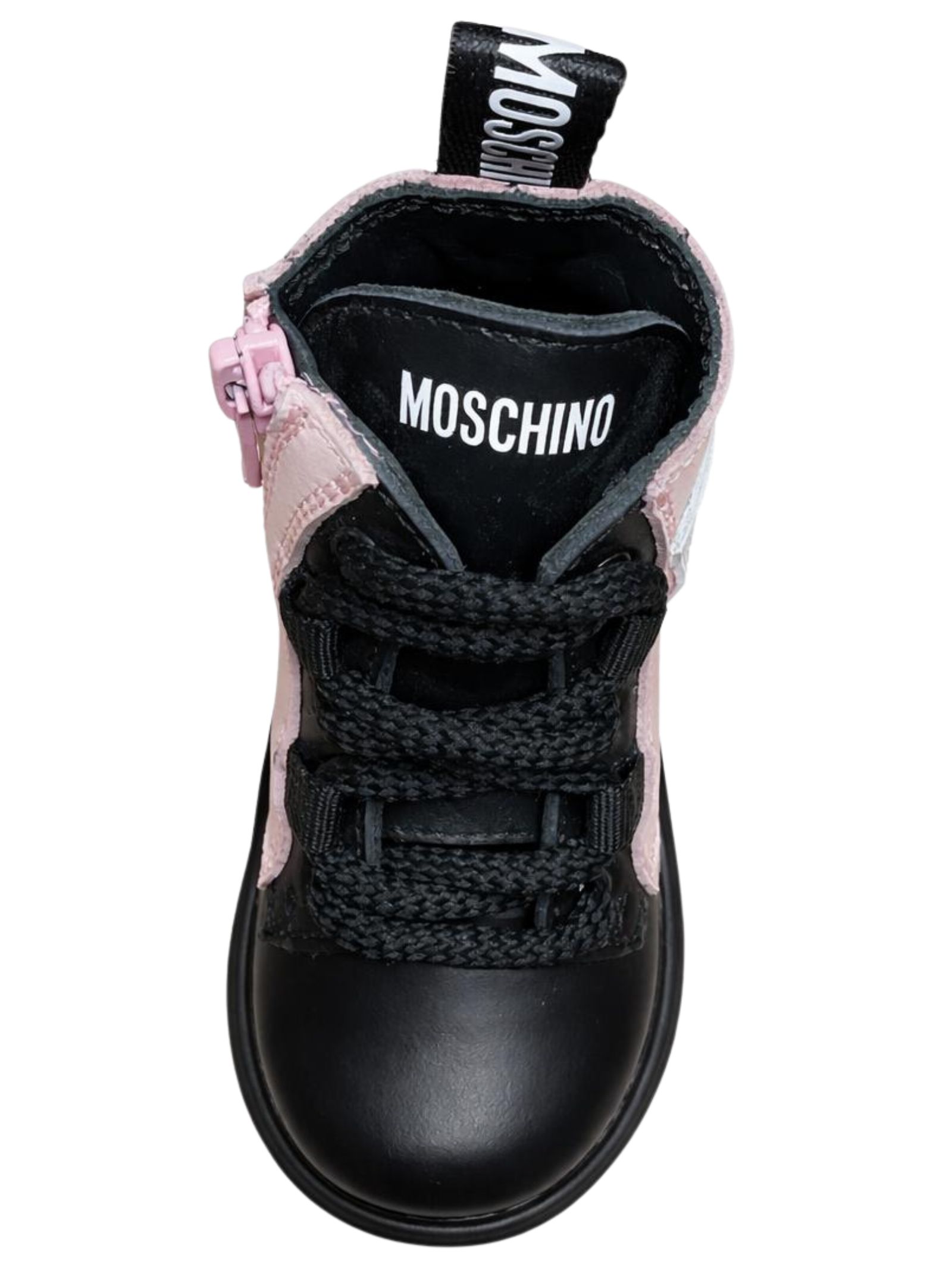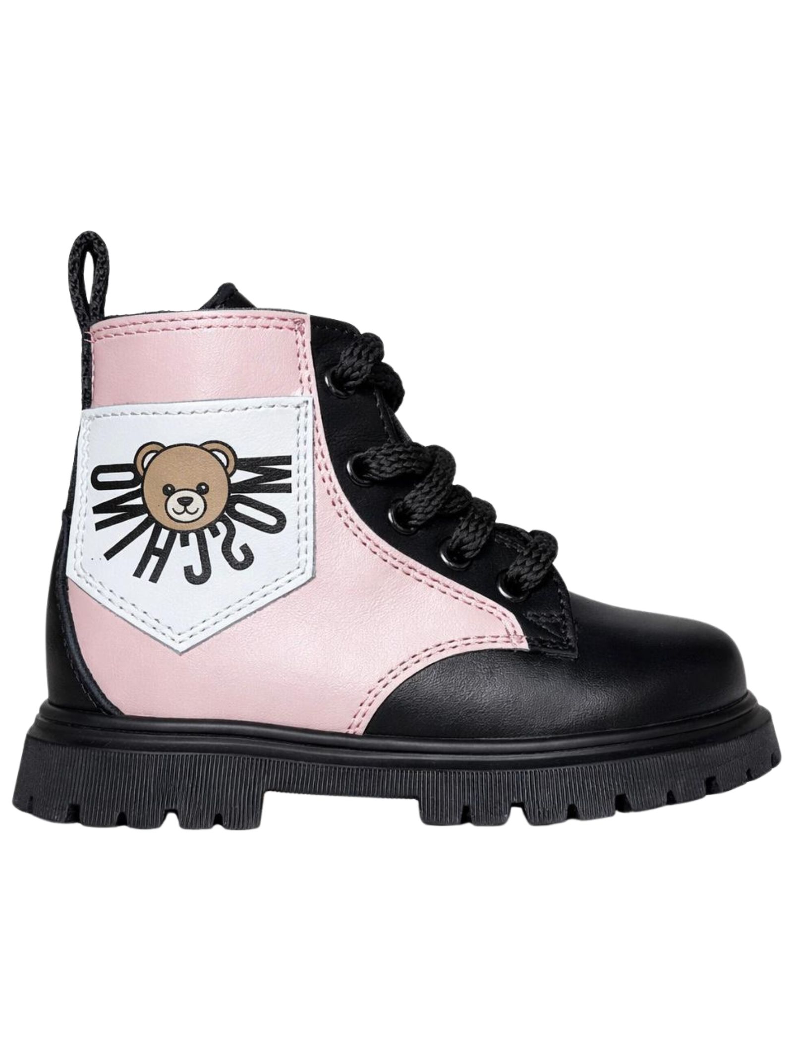 Moschino Kids anfibi in pelle di colore nero/rosa, patch teddy con logo laterale, modello con punta tonda, chiusura frontale con lacci, linguetta sul tallone logata, zip laterale, suola in gomma. Esterno: pelle di vitello 100%. Suola: gomma 100%. Made in Italy