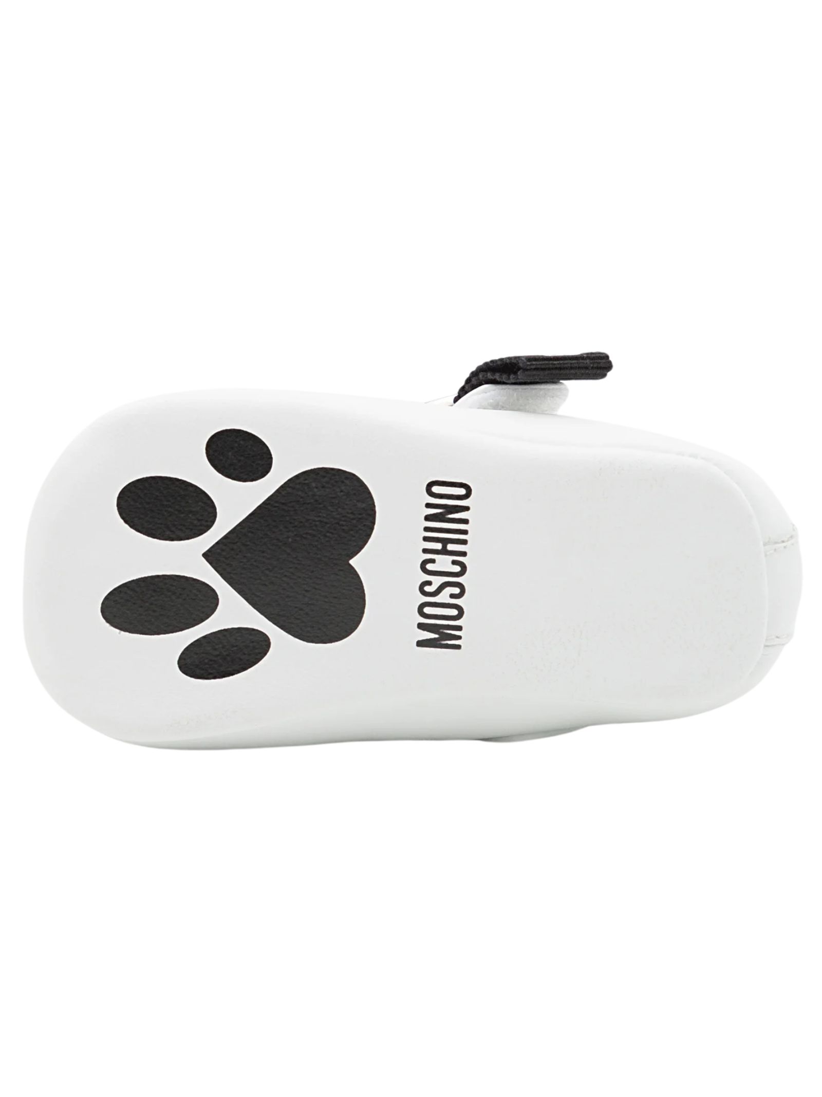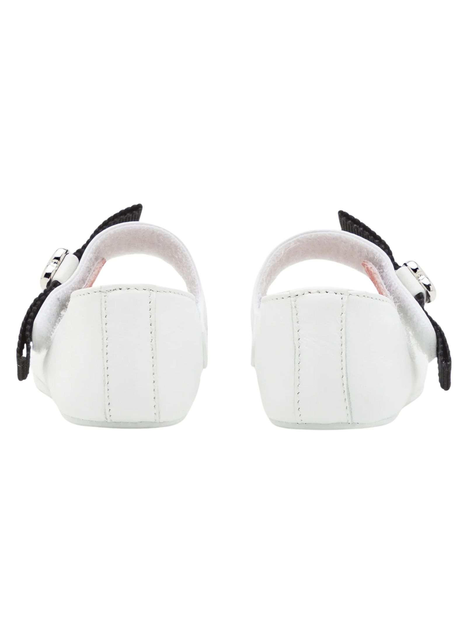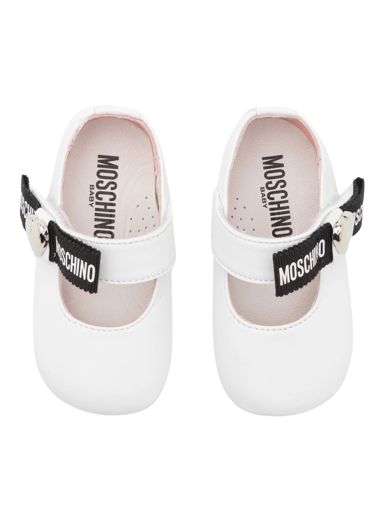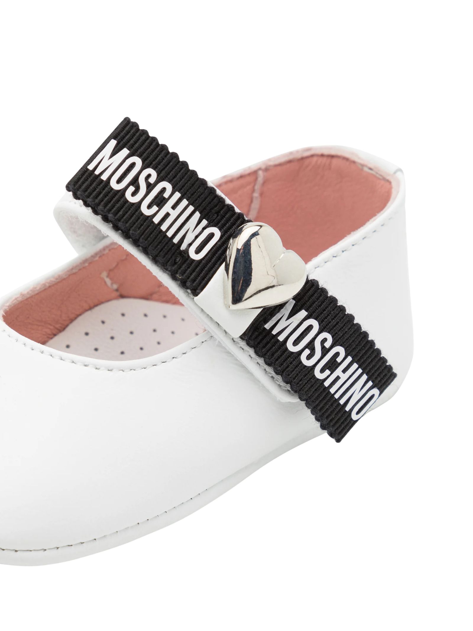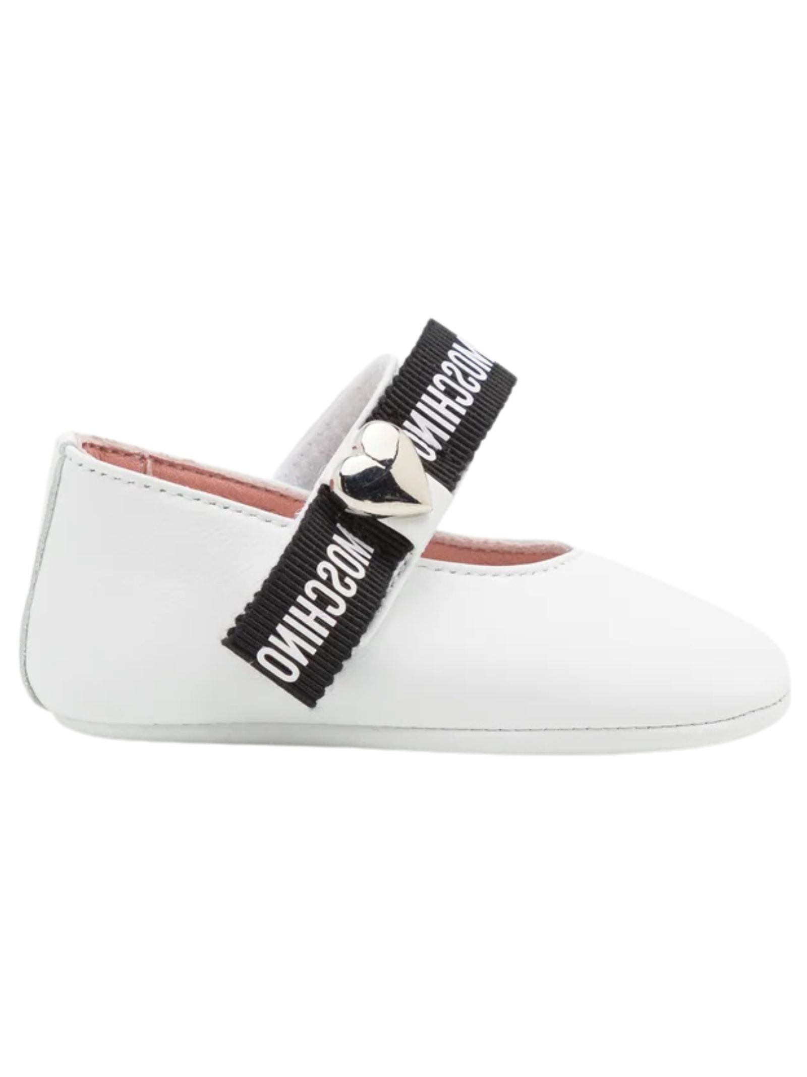 Moschino Kids ballerine di colore bianco realizzate in pelle, cinturino e chiusura a strappo, decorate con fiocco in gros grain, logo e cuore in metallo sul lato con impronta e logo sulla suola. Made in Italy