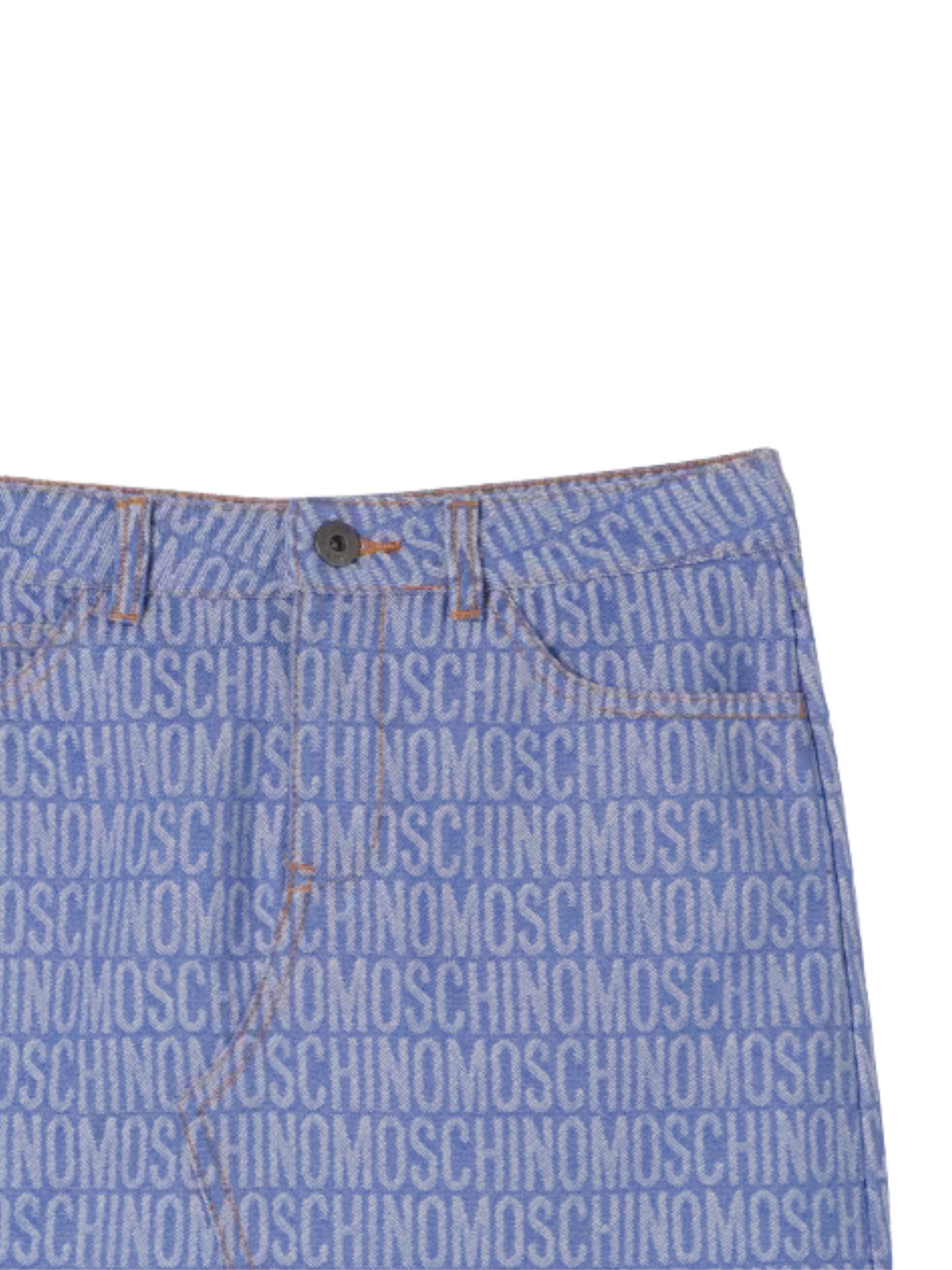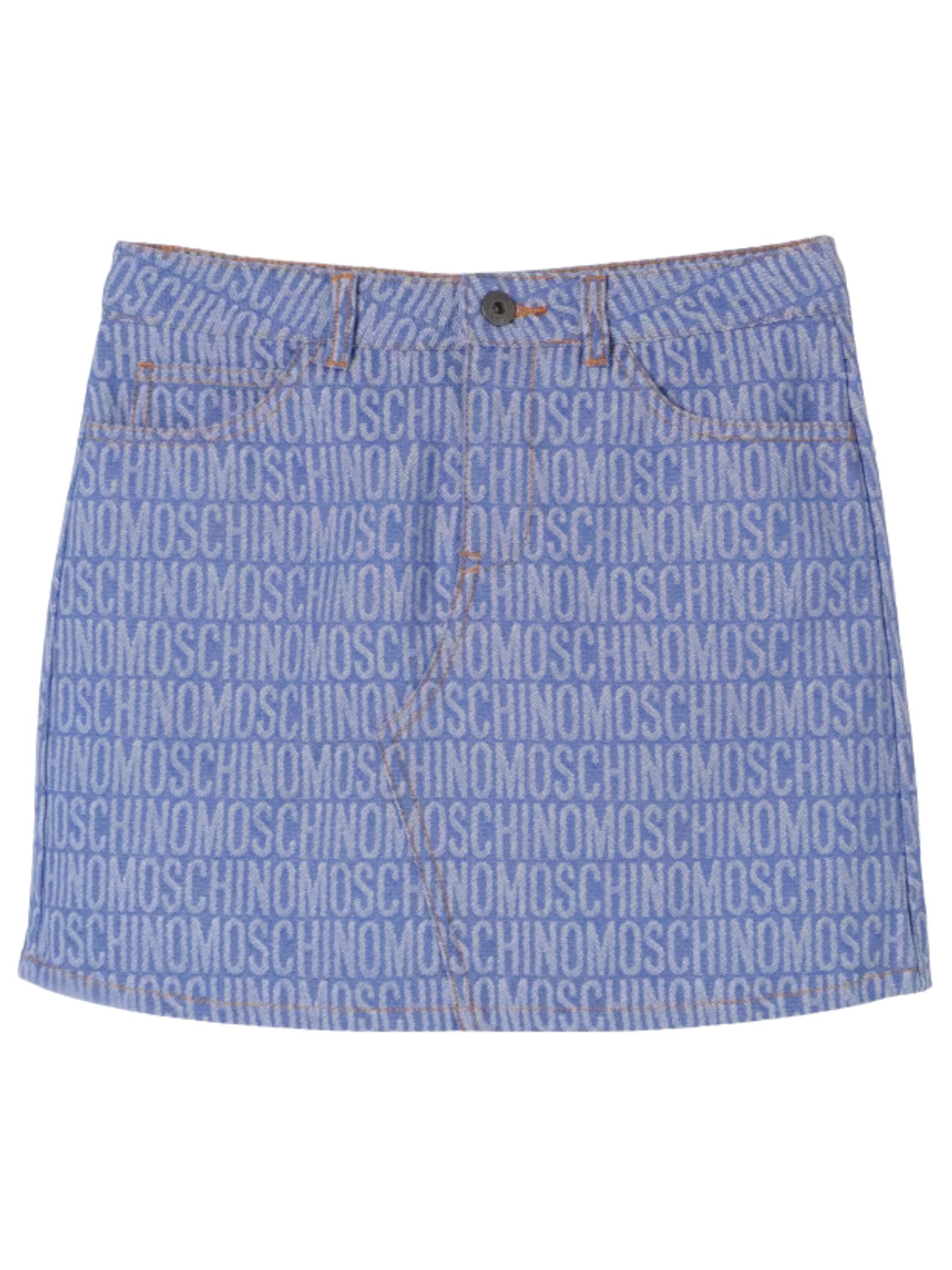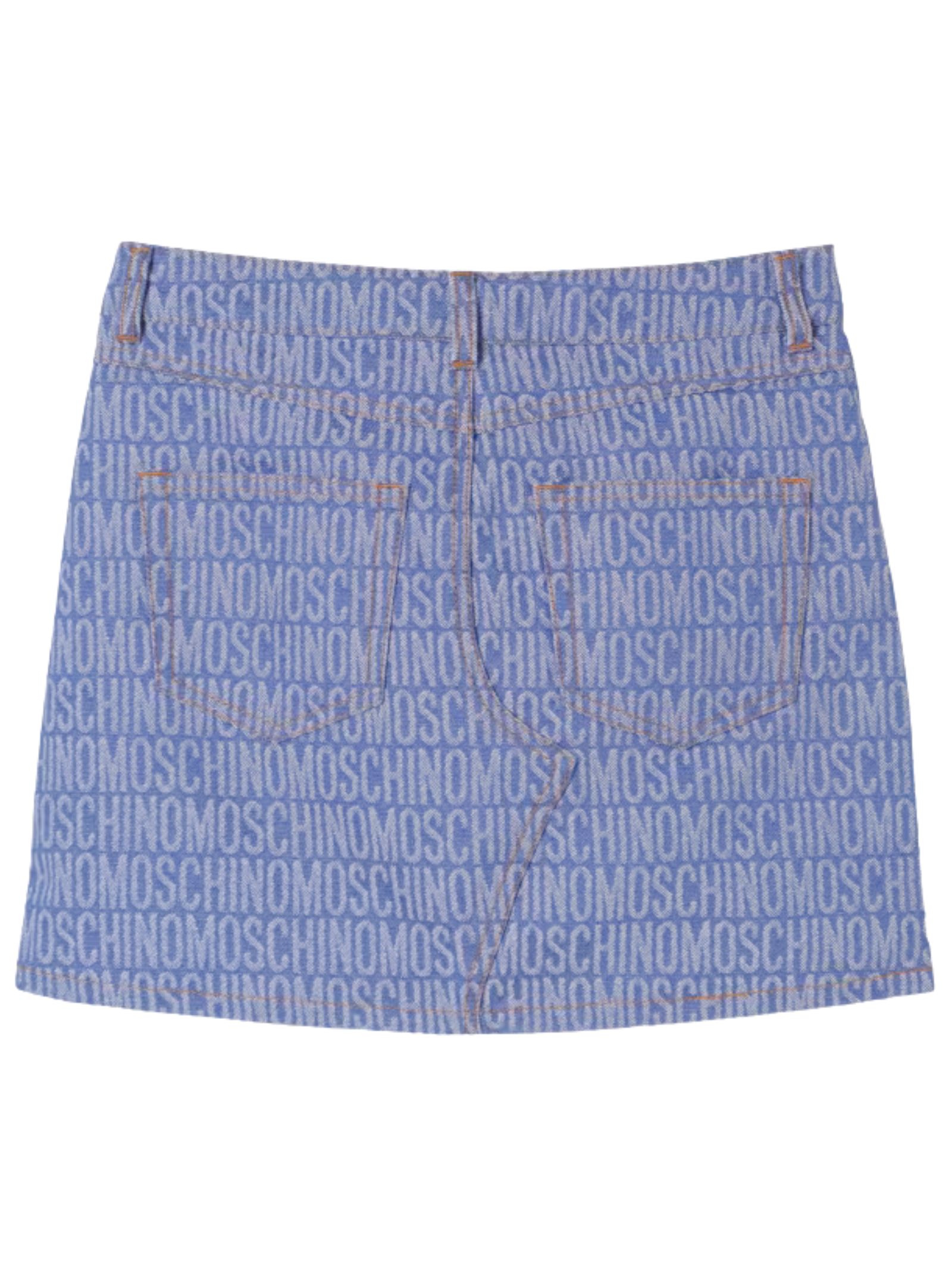 Moschino Kids gonna in denim azzurro, lavaggio medio, logo in lettering su tutta la superficie, vita con passanti, chiusura con zip e bottone, cinque tasche. Composizione: 53% cotone 47% poliestere