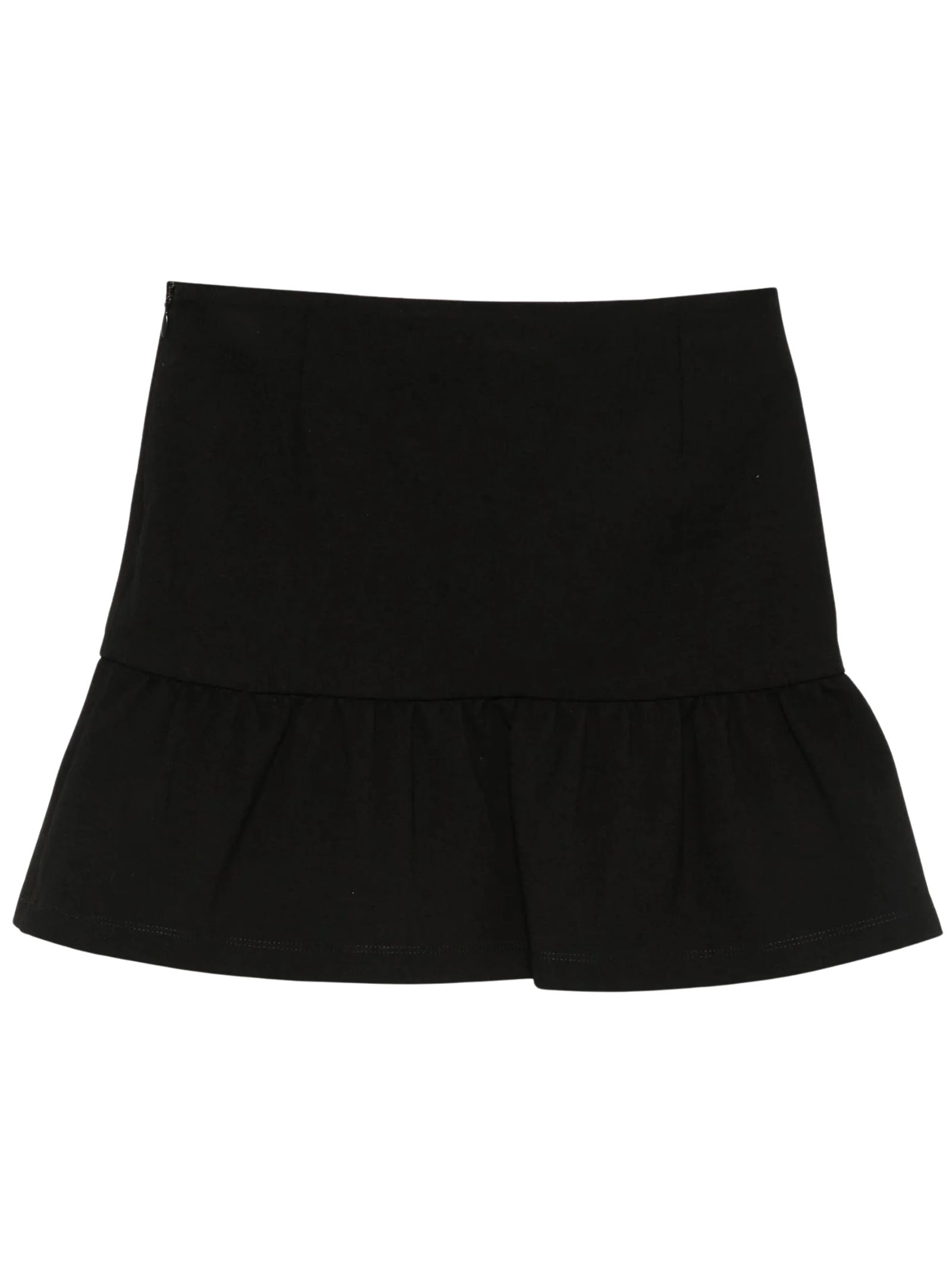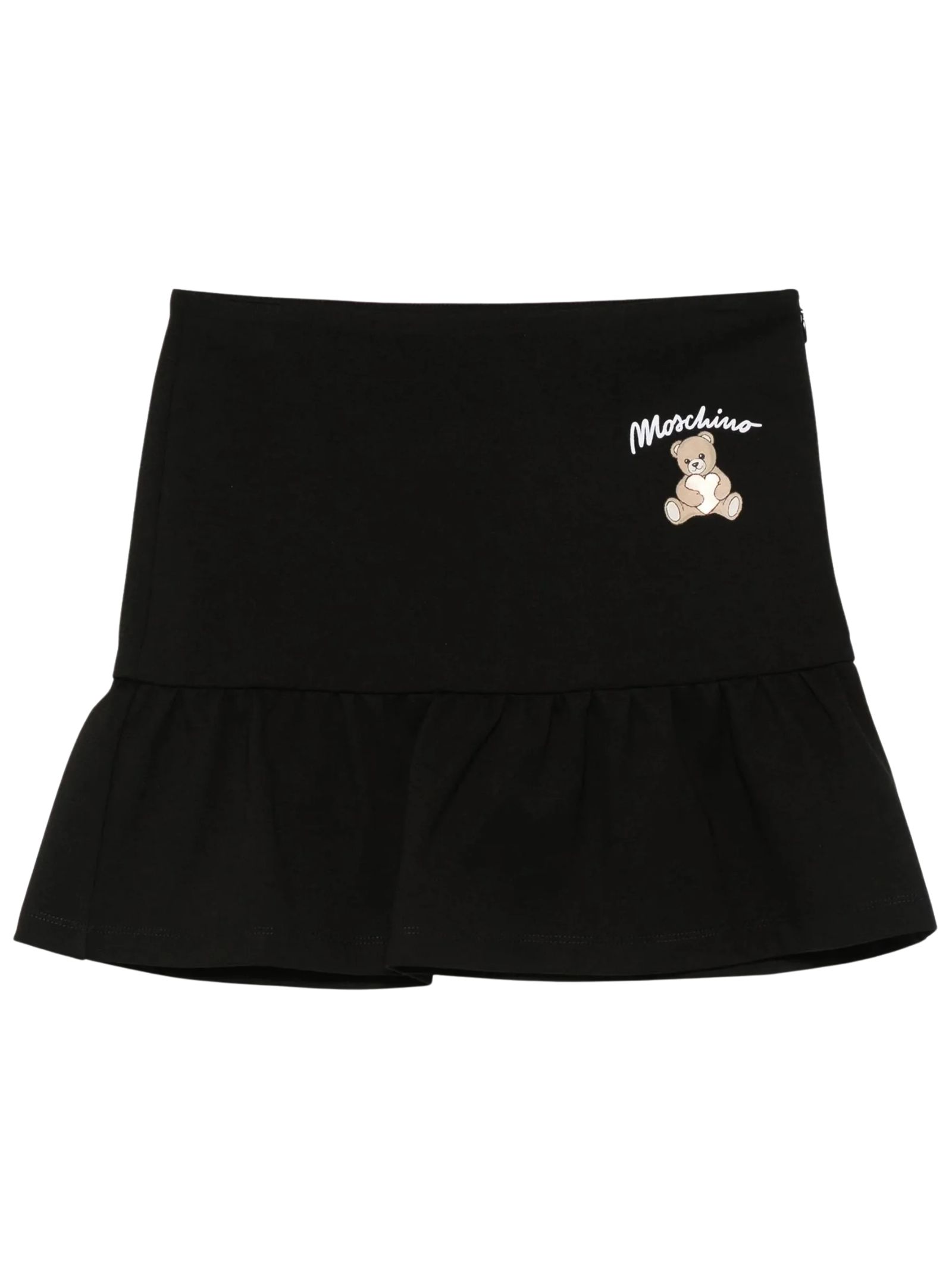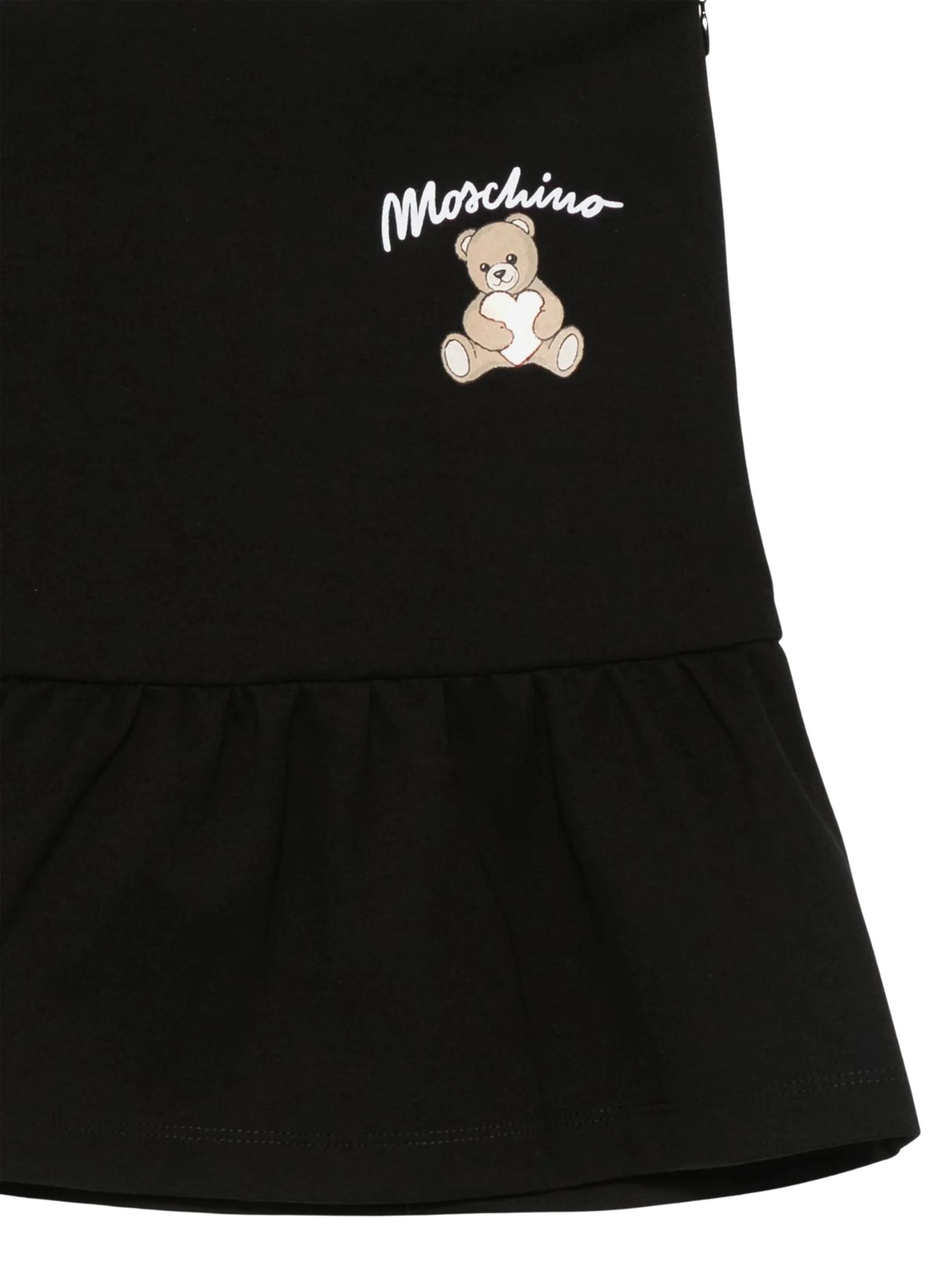 Moschino Kids gonna di colore nero, modello con vita regolabile grazie ad elastico interno con bottone, zip laterale e balza sul fondo, decorata con stampa Teddy Bear con cuore e logo sulla parte anteriore.