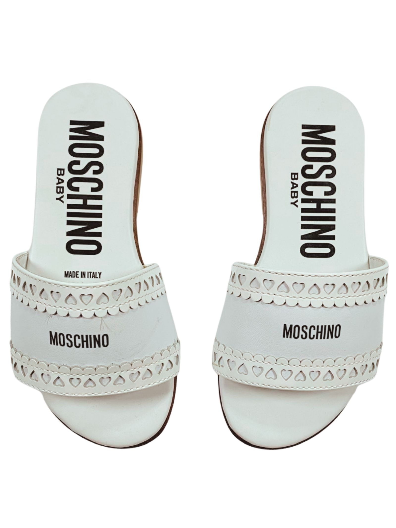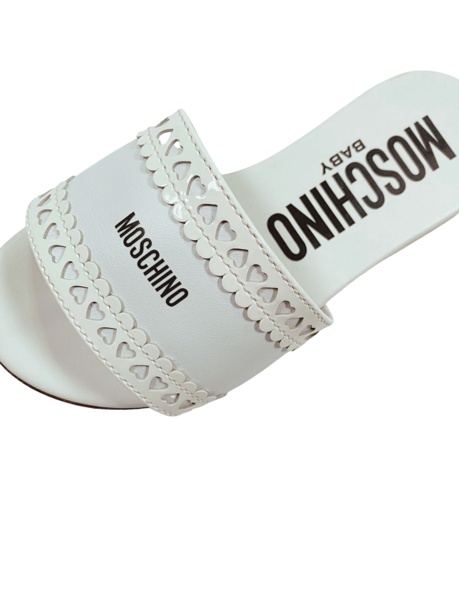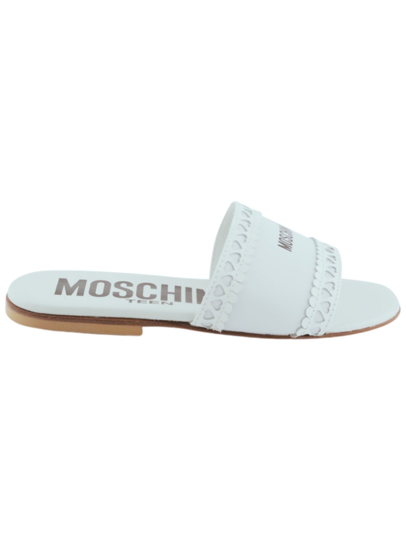 Moschino Kids sandali in pelle di colore bianco, dettaglio cuori traforati, logo a contrasto nero, design slip-on, punta tonda, suoletta con logo a contrasto e suola in vero cuoio. Made in Italy
