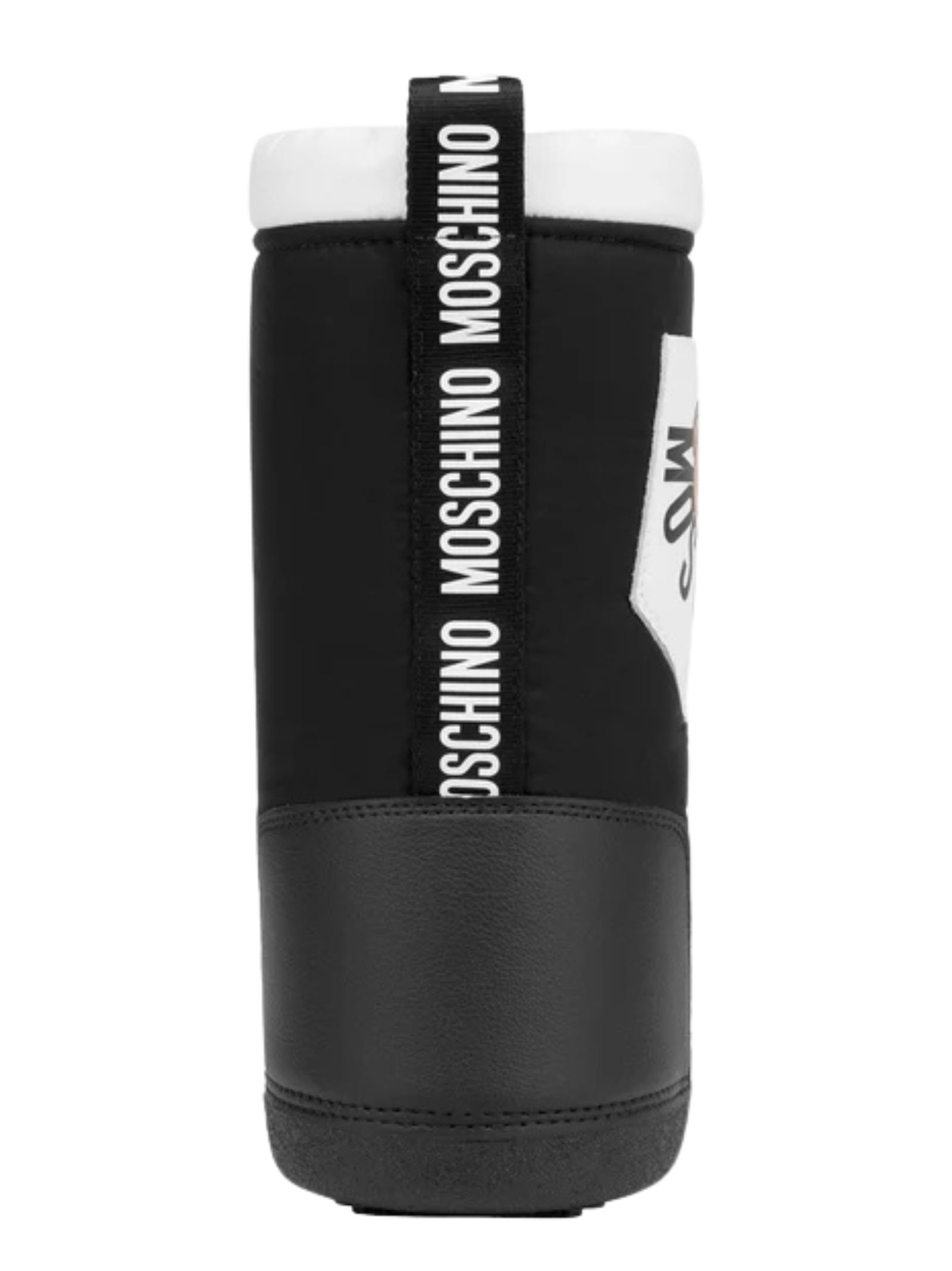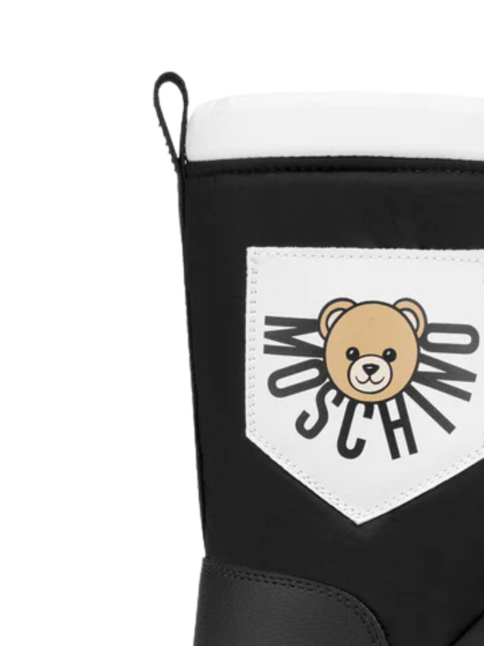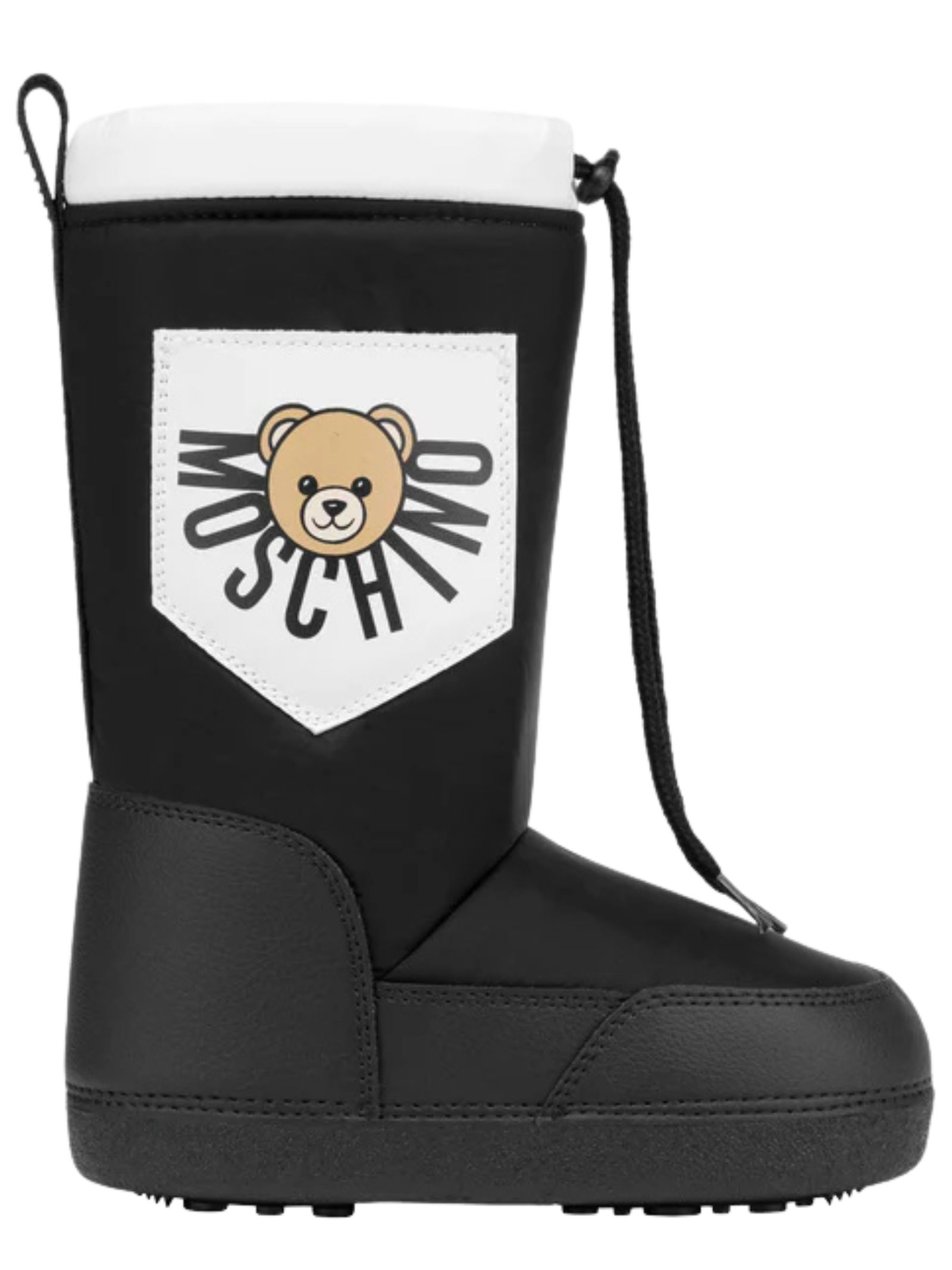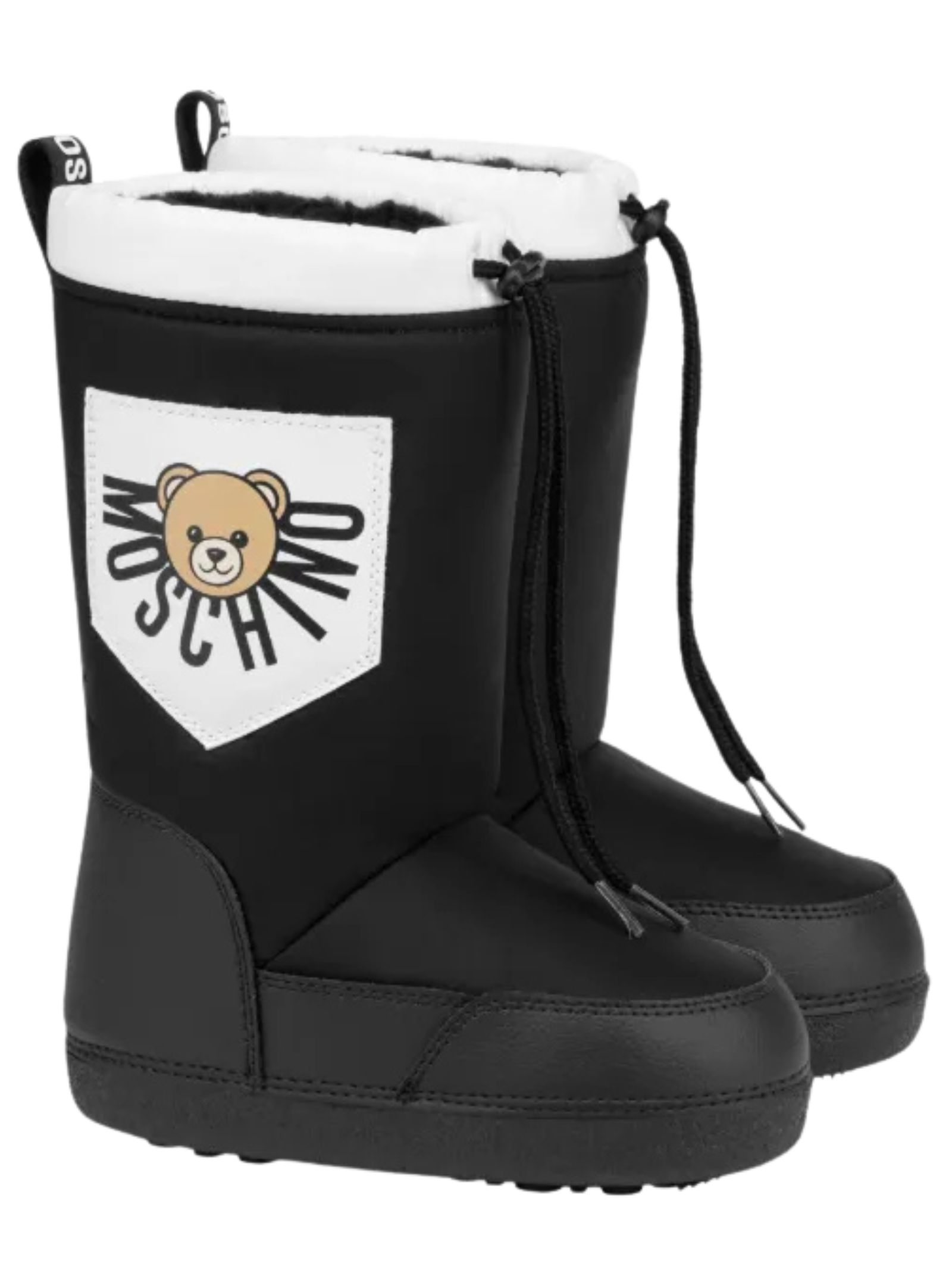 Moschino Kids scarpe da neve di colore nero, design stivale con punta tonda, patch in pelle con Orsacchiotto Moschino e logo all'esterno, chiusura con coulisse, logo loop sul retro per una facile vestibilità, interno effetto pelliccia, suola di gomma. Tomaia: 85% Poliestere, 15% Poliuretano. Made in Italy