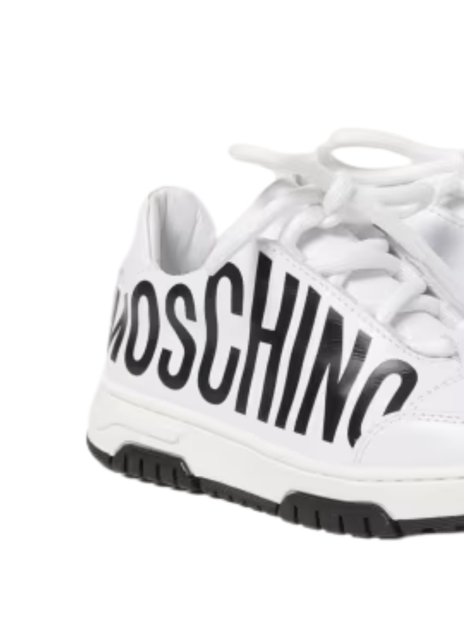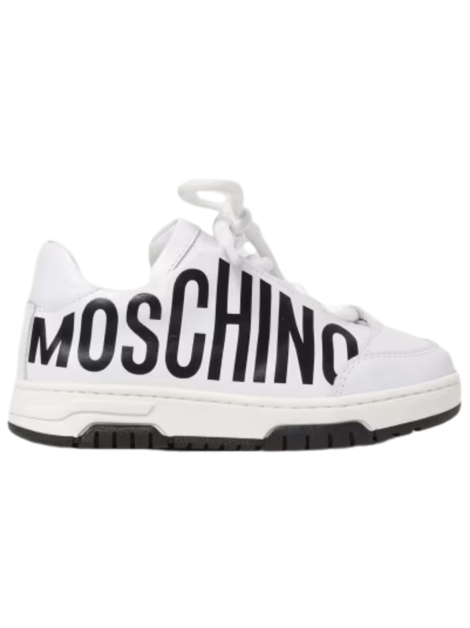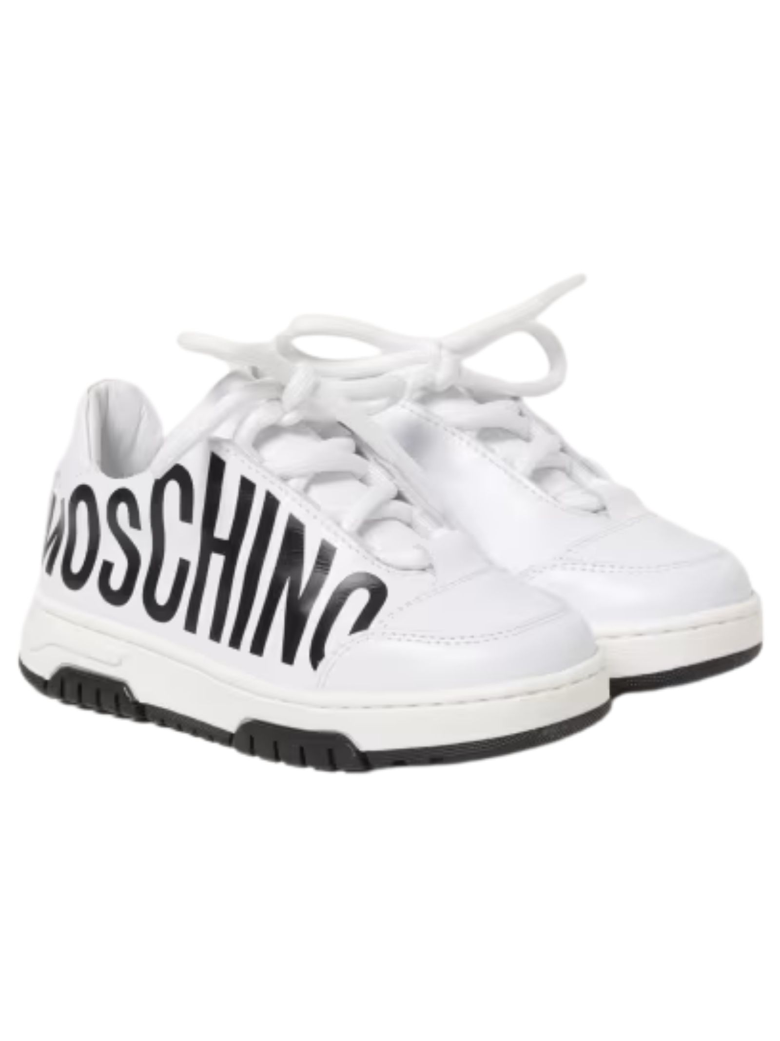 Moschino Kids scarpe di colore bianco, realizzate in pelle liscia con logo laterale a contrasto nero, modello slip-on con lacci, punta tonda, interno in pelle con stampa logo, suola in gomma. Made in Italy