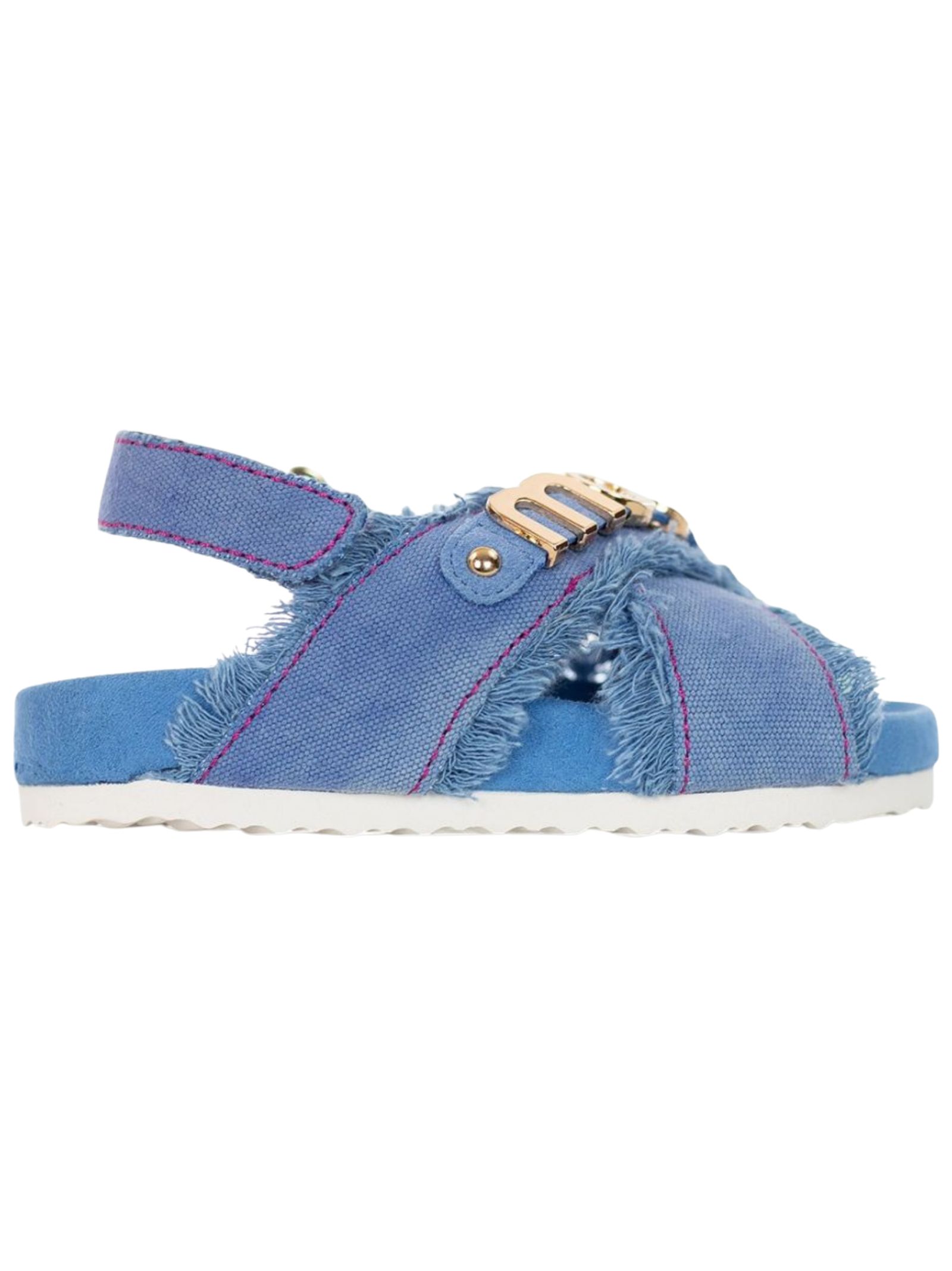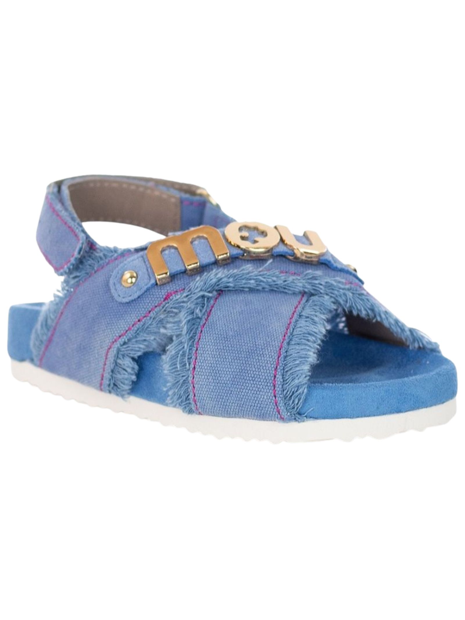 Mou Kids sandali realizzati a mano in tela riciclata azzurra effetto denim per uno stile eco-friendly, design arricchito dal logo lettering in metallo sulla tomaia e da un pratico cinturino posteriore, suola ultraleggera in EVA, abbinata al plantare imbottito in microsuede, assicura massimo comfort e libertà di movimento.