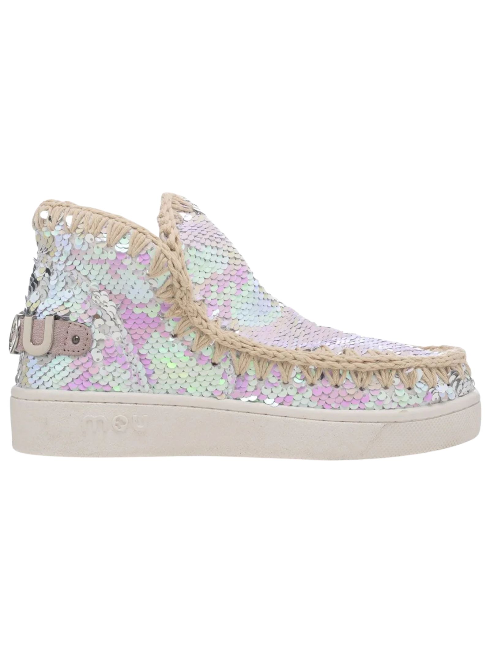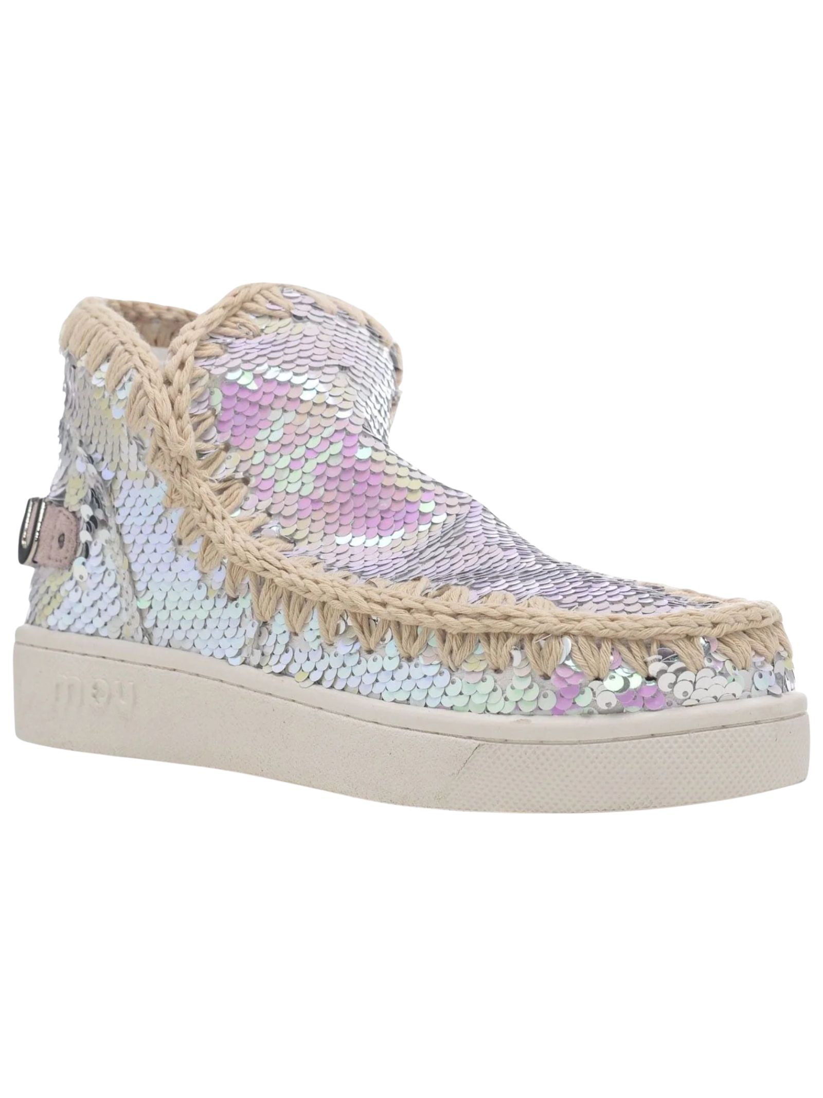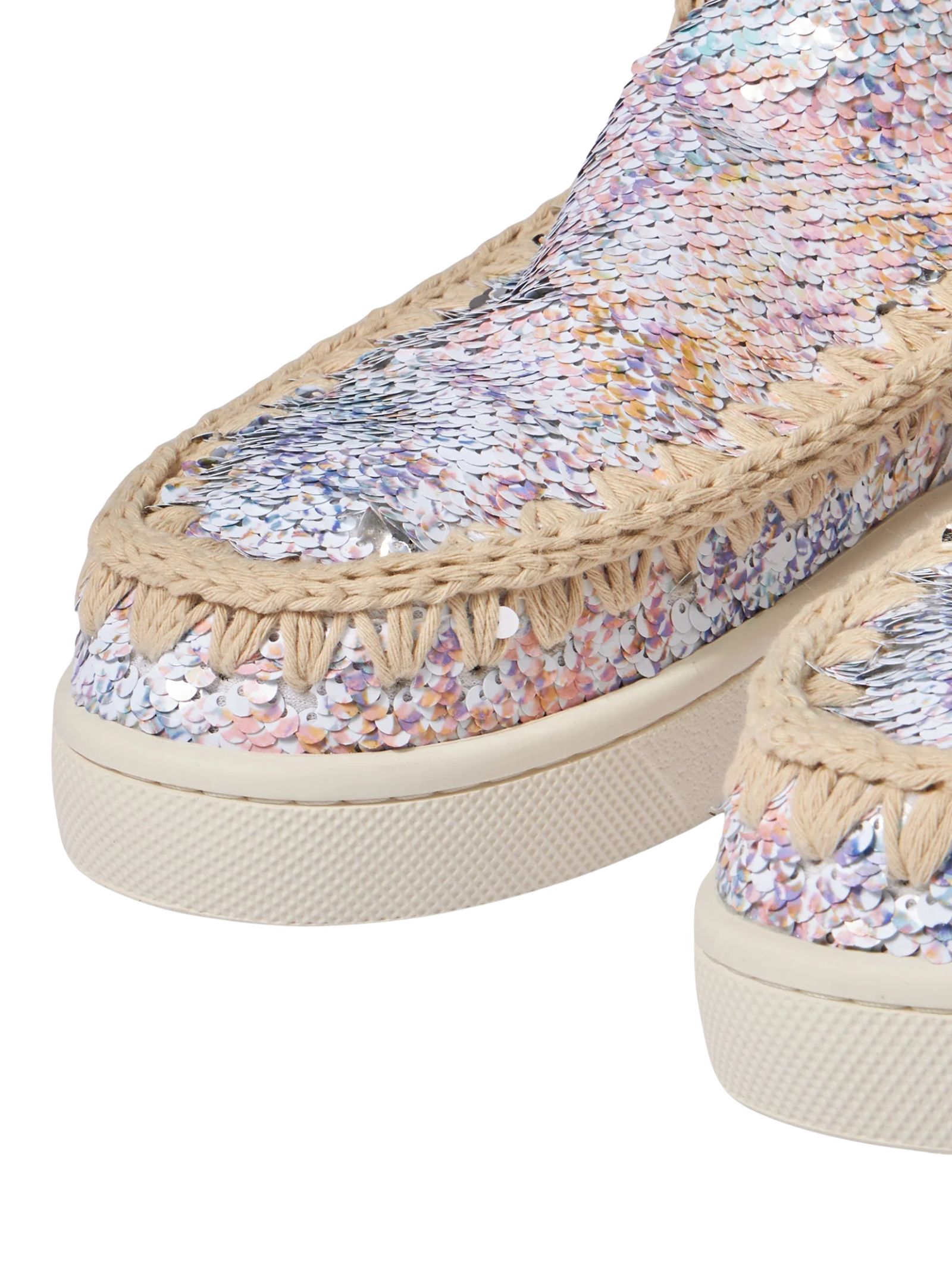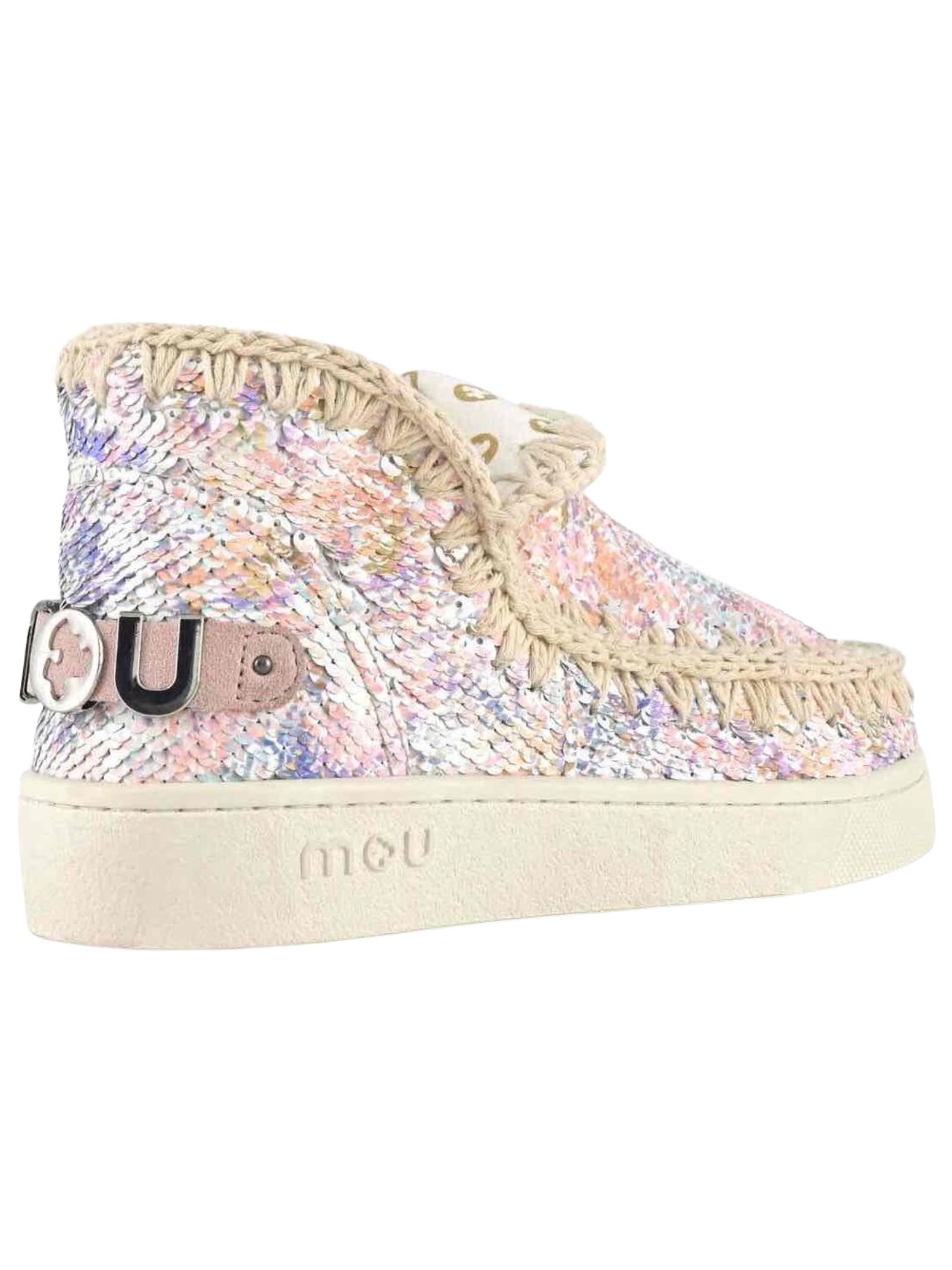 Eskimo sneakers Mou in paillettes in multicolor, slip on, pelle di montone, punta tonda, cuciture in lavorazione hand made all'uncinetto, tallone rinforzato, logo Mou applicato, interni in cotone e suola in gomma EVA