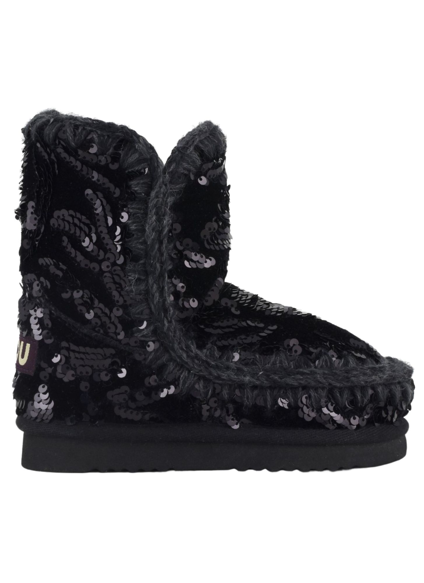 Eskimo sneakers Mou in paillettes di colore nero, slip on, pelle di montone, punta tonda, cuciture in lana, lavorazione hand made all'uncinetto, tallone rinforzato, logo Mou applicato, interni in pelliccia di montone e suola in gomma EVA