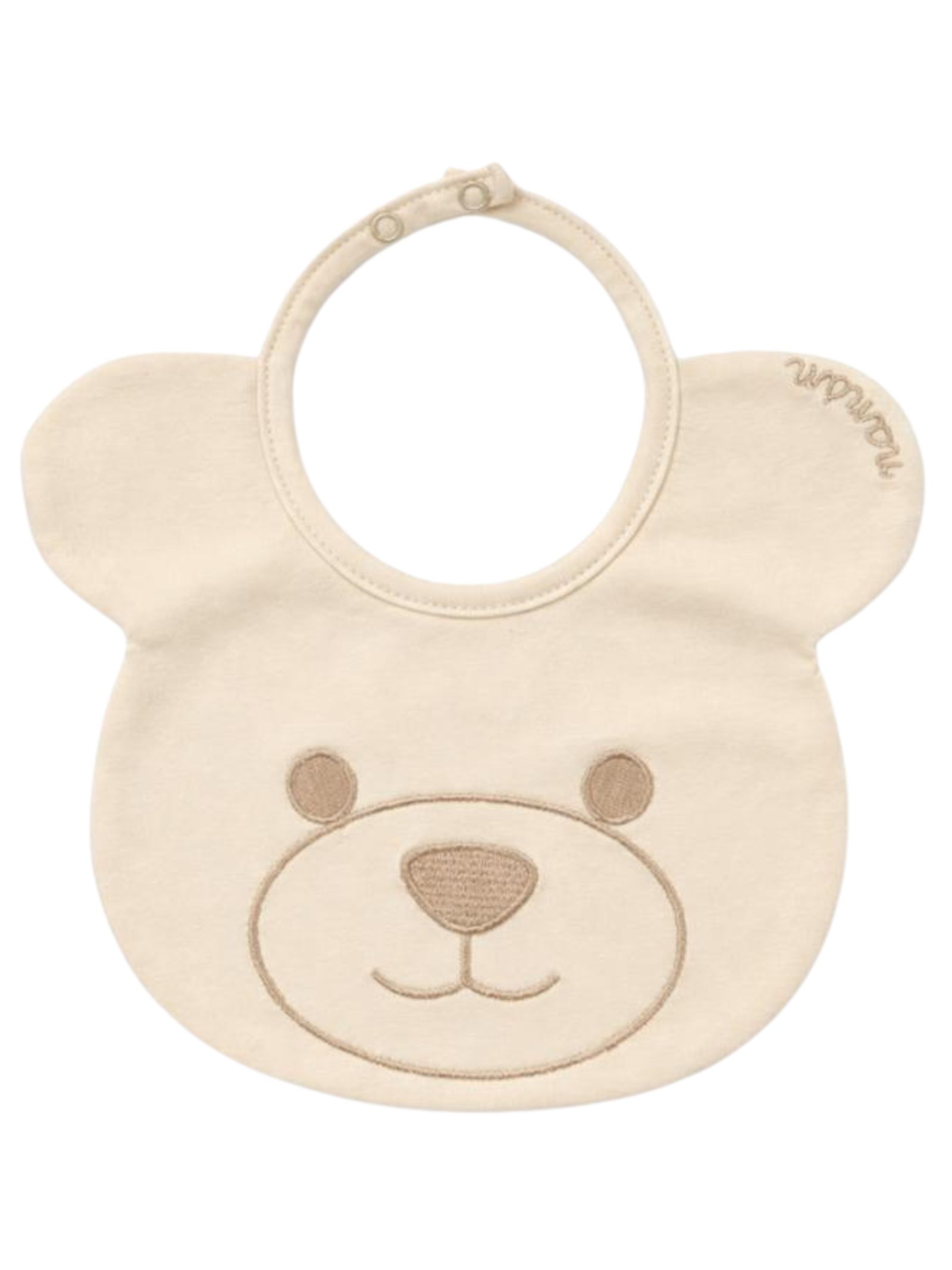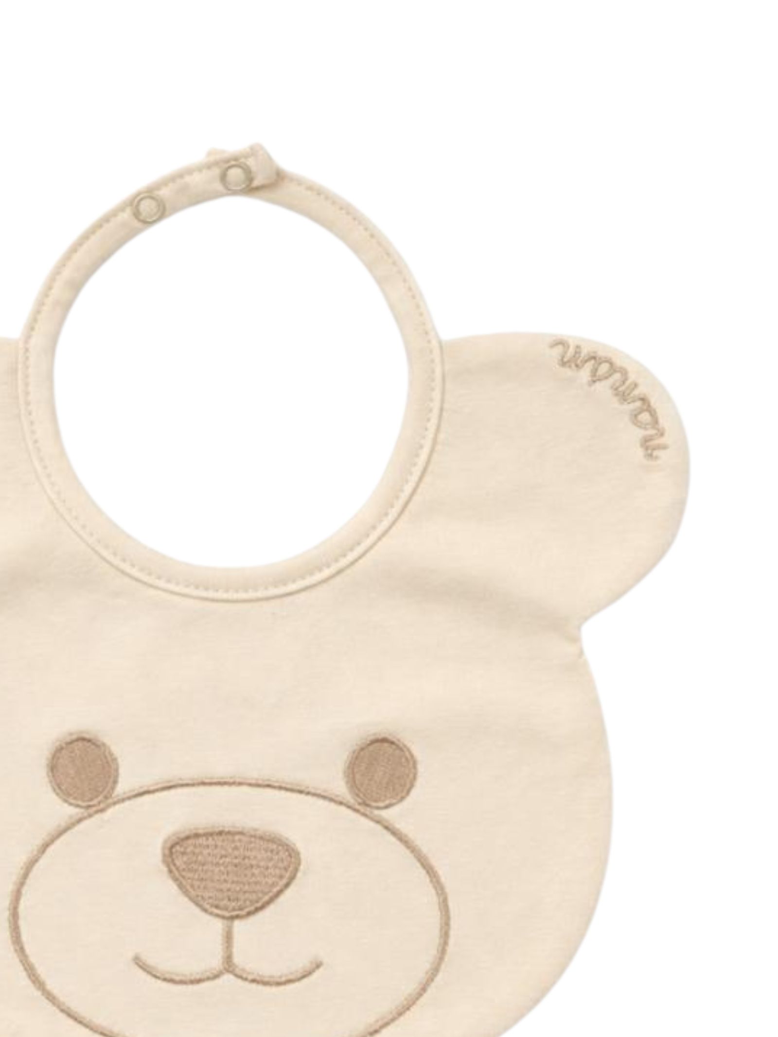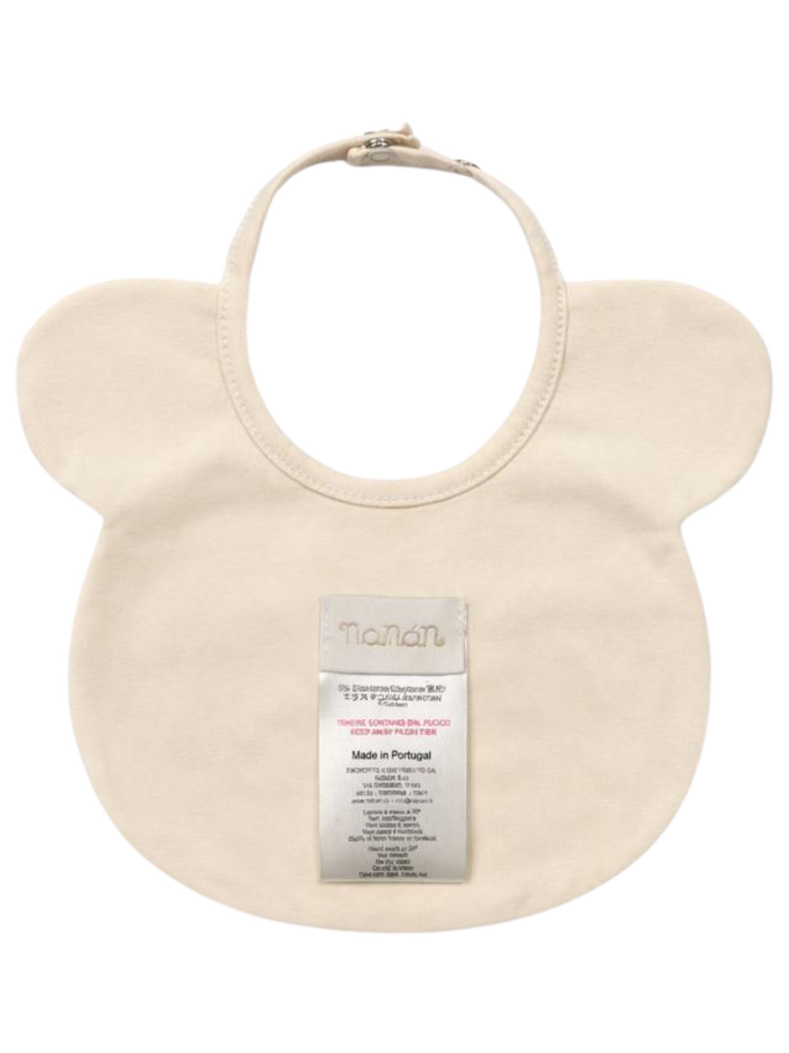 Bavaglino Nanan Kids color sabbia con orsetto ricamato a contrasto, realizzato in morbido cotone, motivo a forma di orsetto, chiusura a scatto. Composizione: 95% cotone, 5% elastan.