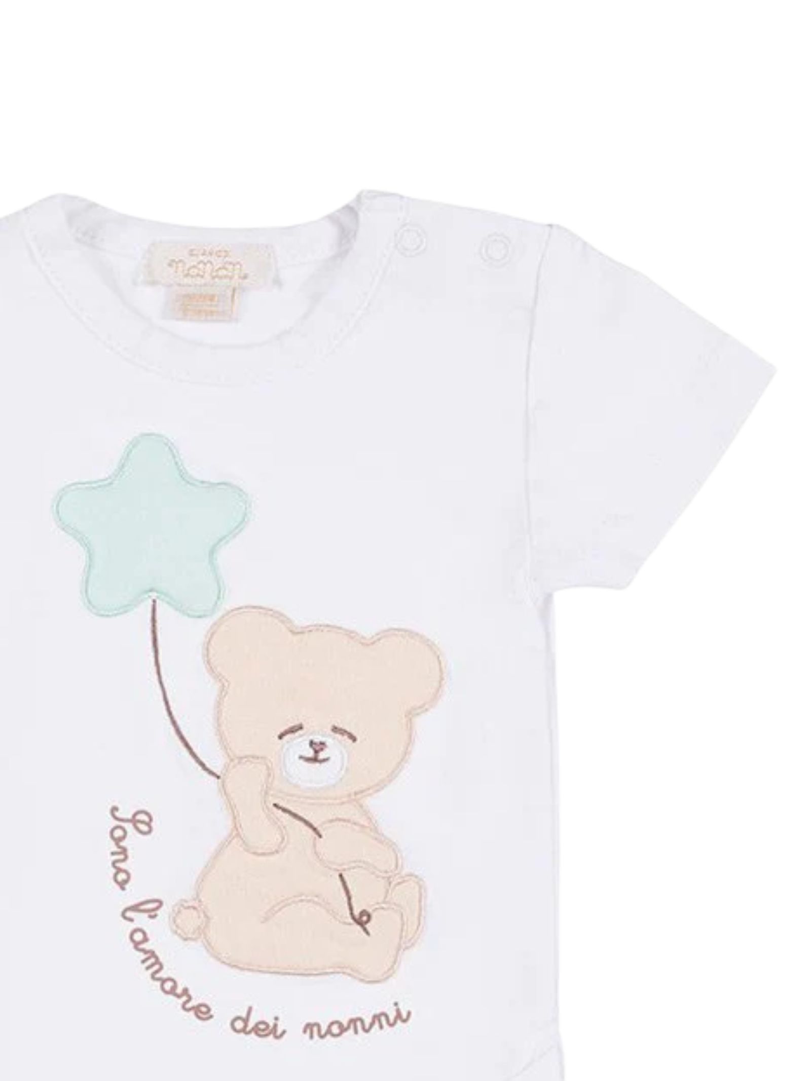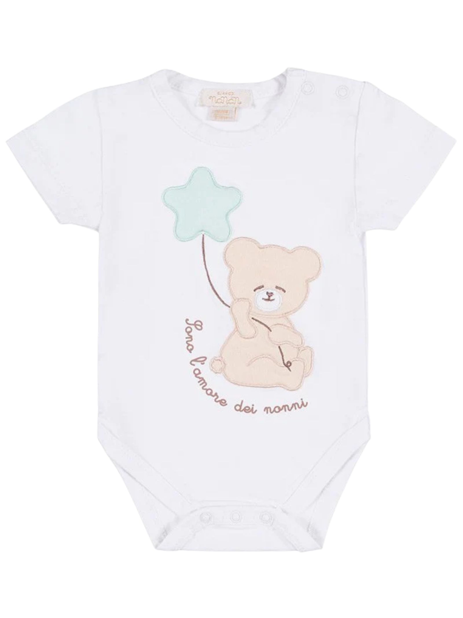 Nanan Kids body di colore bianco realizzato in cotone, design girocollo, dettaglio simpatica stampa centrale a contrasto, mezza manica, apertura con bottoni sulla spalla e sul cavallo. Composizione: 95% cotone 5% elastan