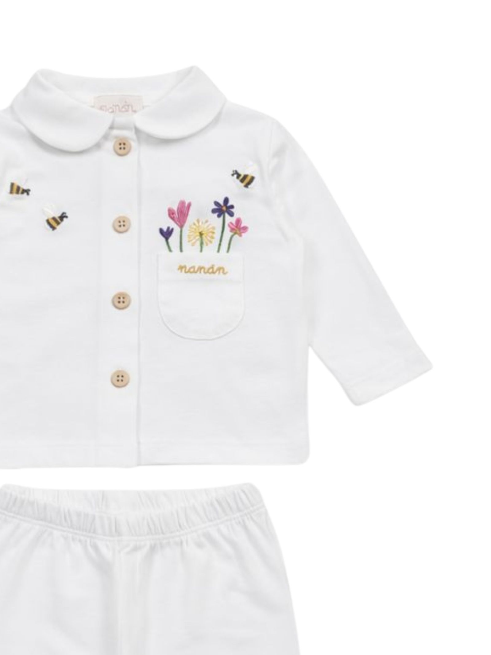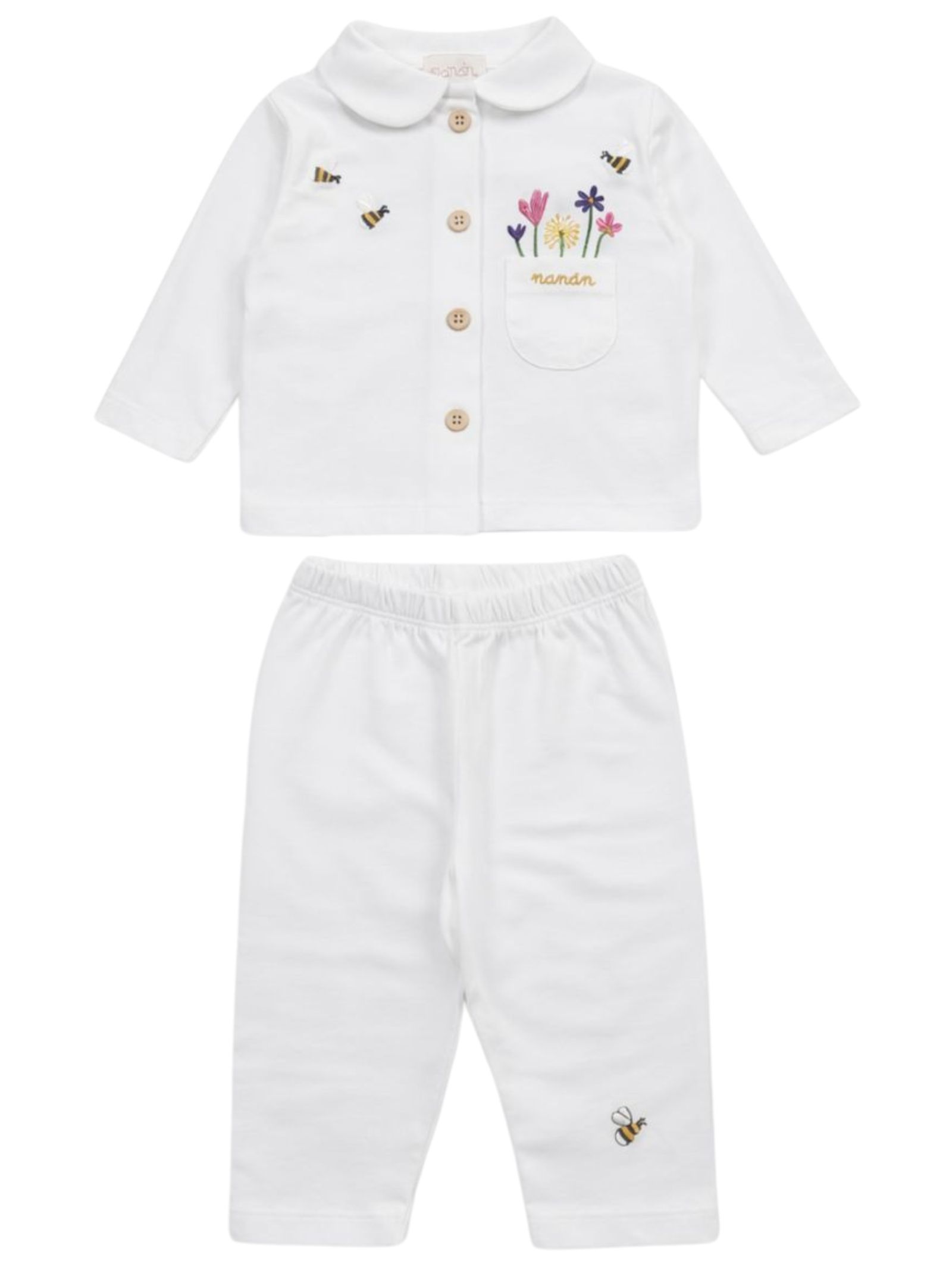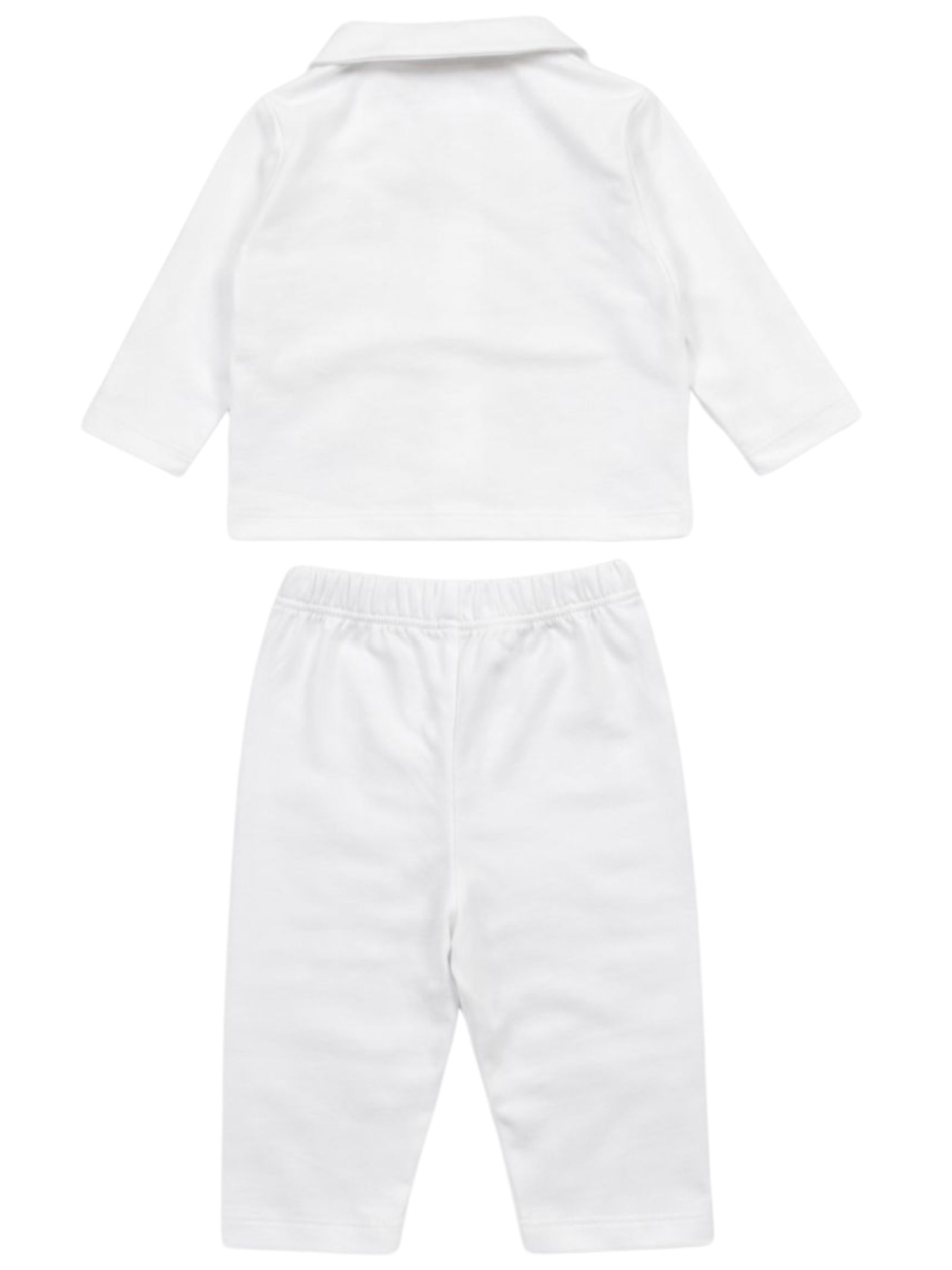 Nanan Kids completo di colore bianco, parte superiore camicia con colletto, dettaglio ricamo fiori a contrasto, maniche lunghe, chiusura con bottoni; pantaloni abbinati con elastico in vita, vestibilità regolare. Composizione: cotone 100%