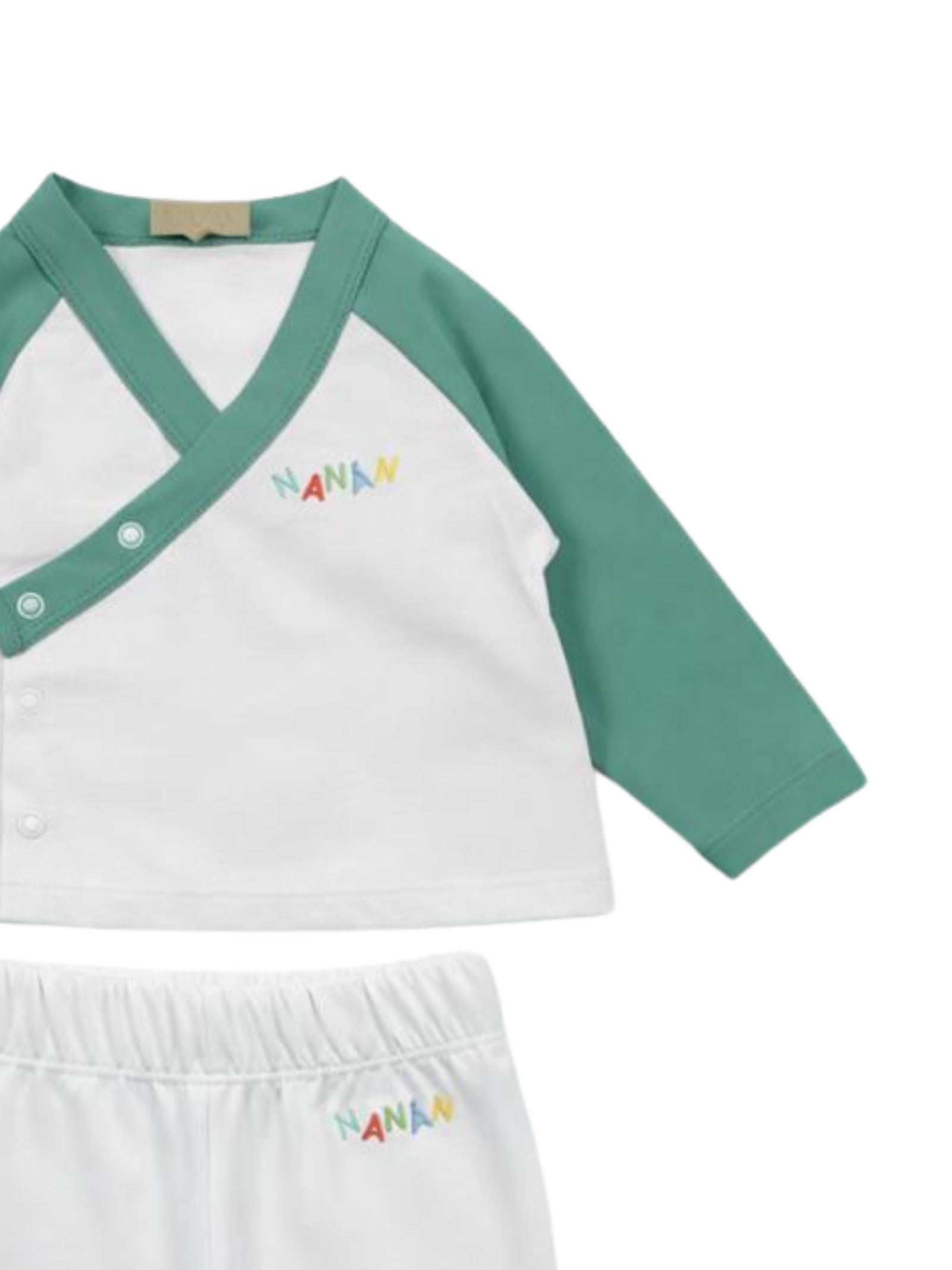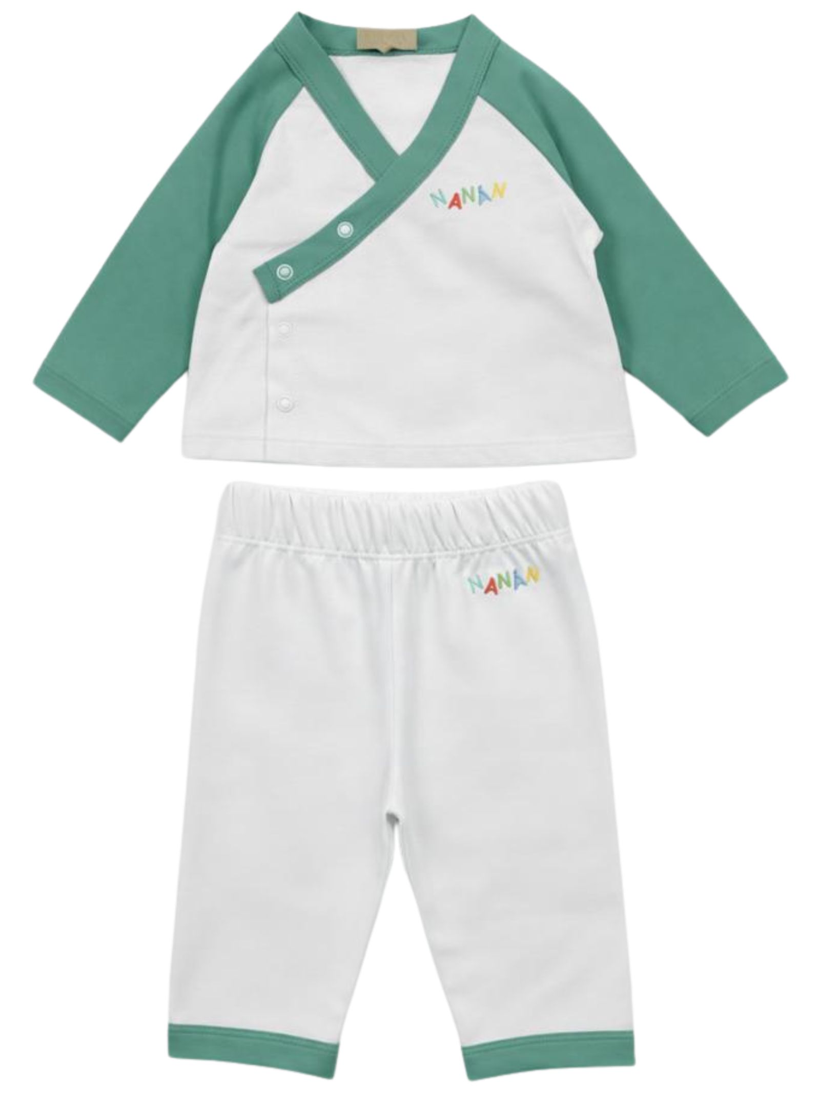 Nanan Kids completo di colore verde/bianco realizzato in cotone, parte superiore con scollo a V, dettaglio logo a contrasto, manica lunga, apertura trasversale sul davanti, pantaloni abbinati con elastico in vita, vestibilità regolare. Composizione: cotone 100%
