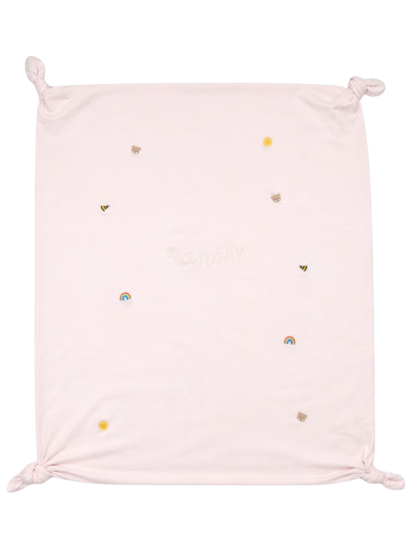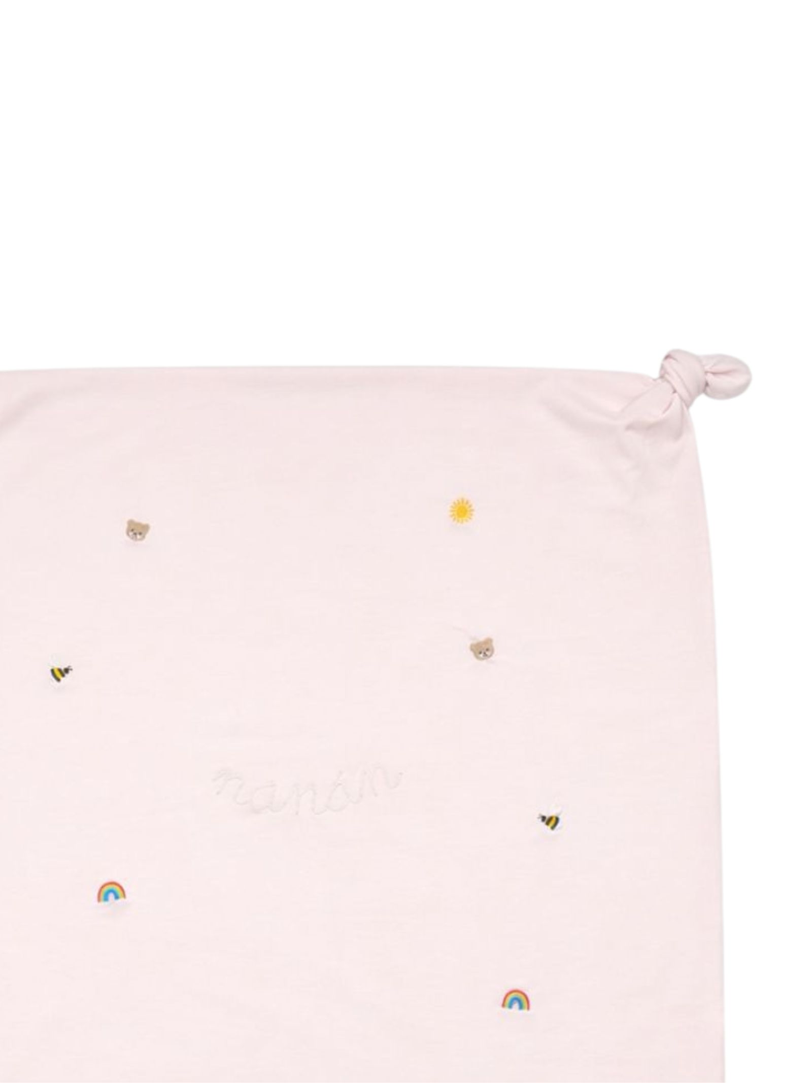 Nanan Kids coperta di colore rosa, dettaglio ricami a contrasto, realizzata in morbido cotone, design a forma quadrata, dettaglio nodi, ricamo logo centrale. Composizione: 95% cotone 5% elastan