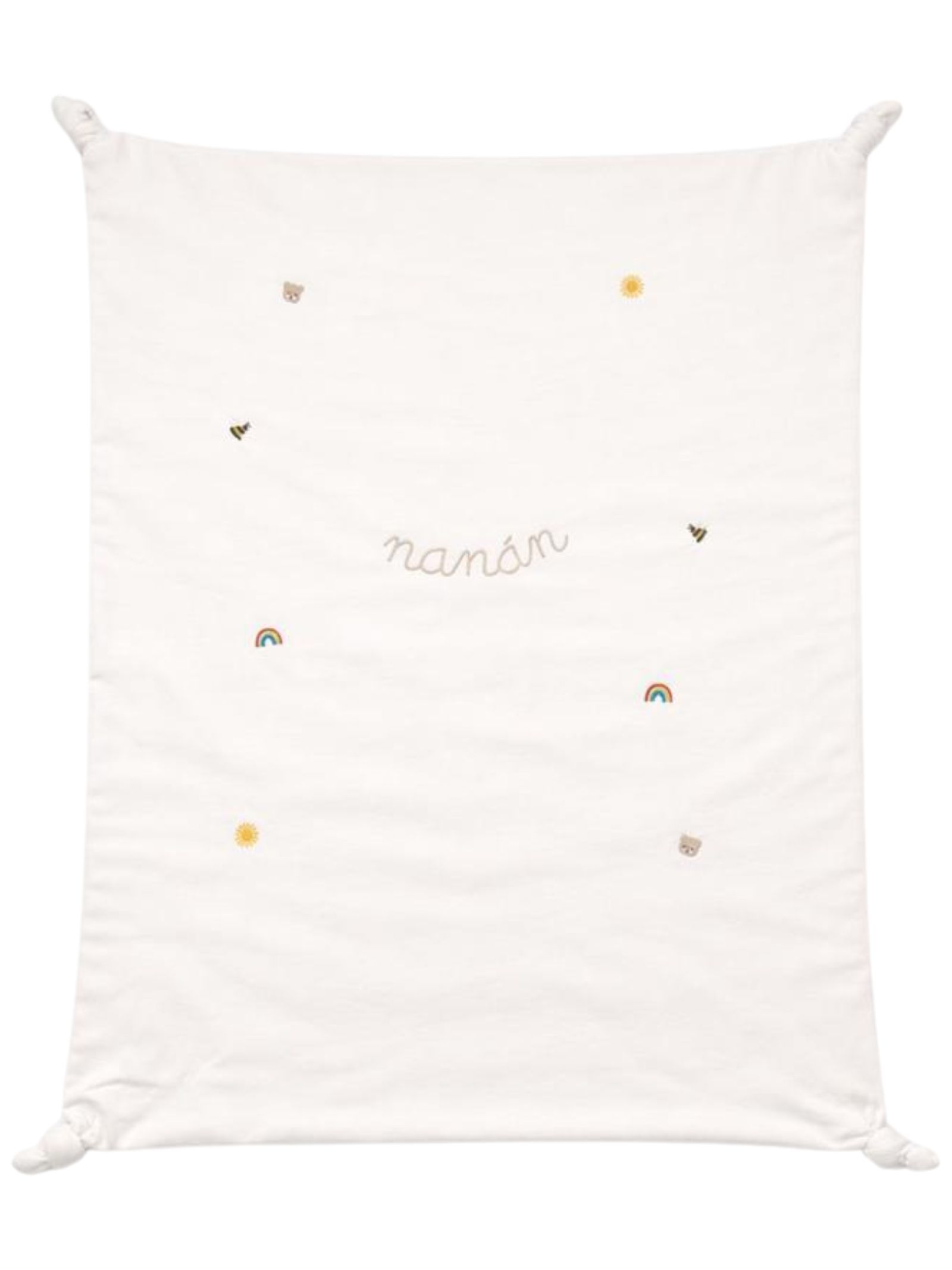 Nanan Kids coperta di colore bianco, dettaglio ricami a contrasto, realizzata in morbido cotone, design a forma quadrata, dettaglio nodi, ricamo logo centrale. Composizione: 95% cotone 5% elastan