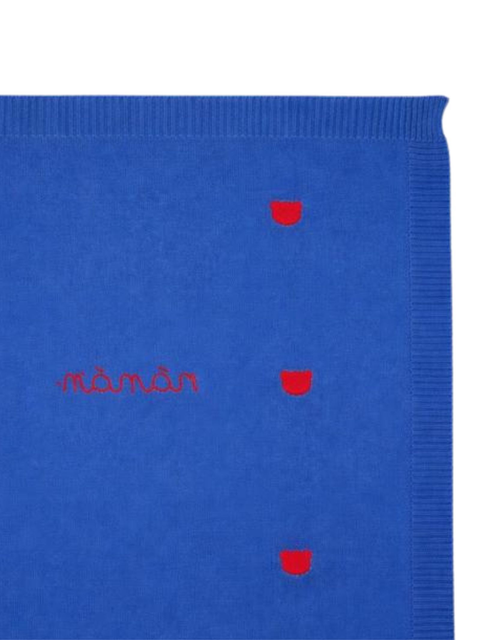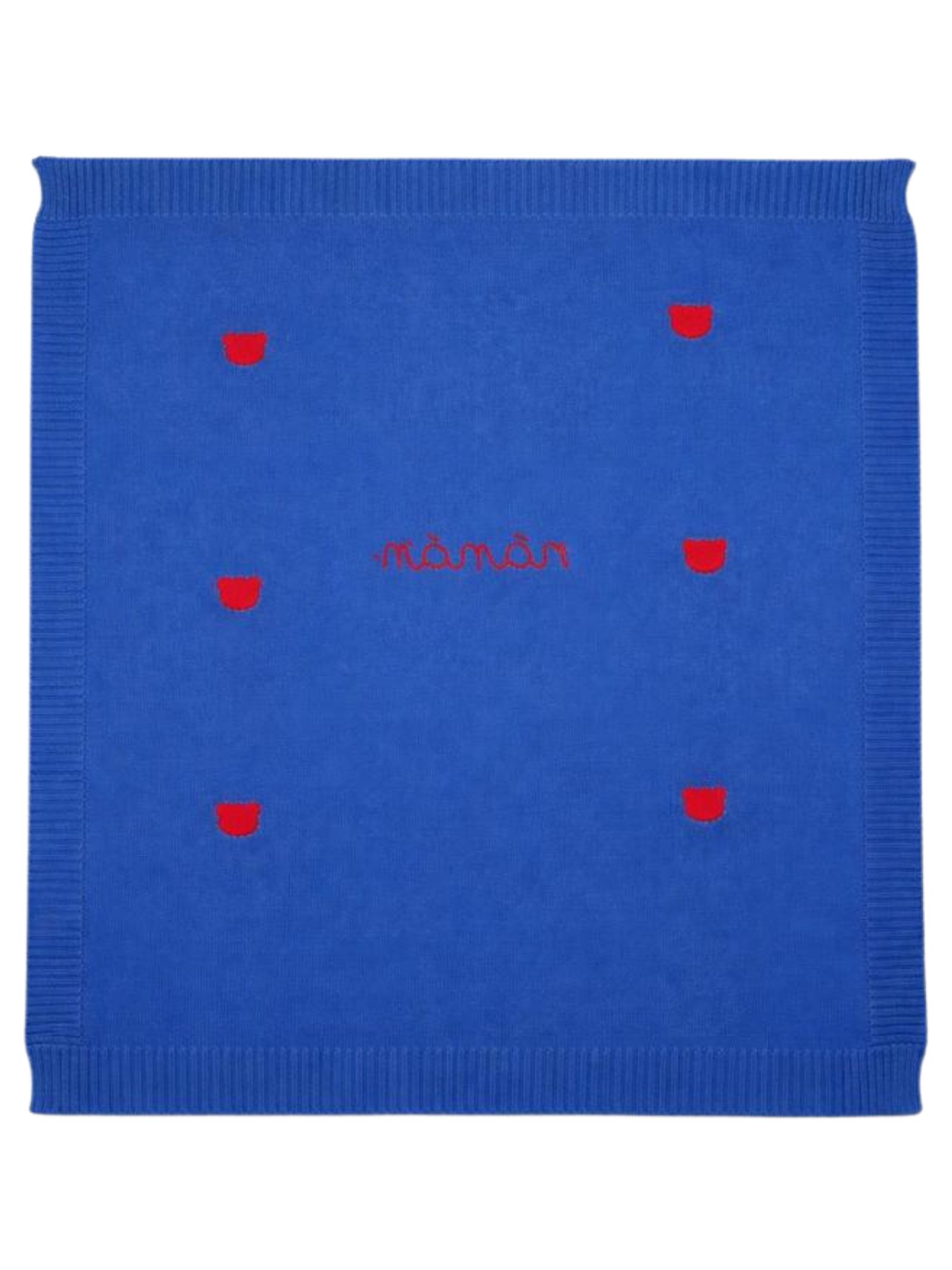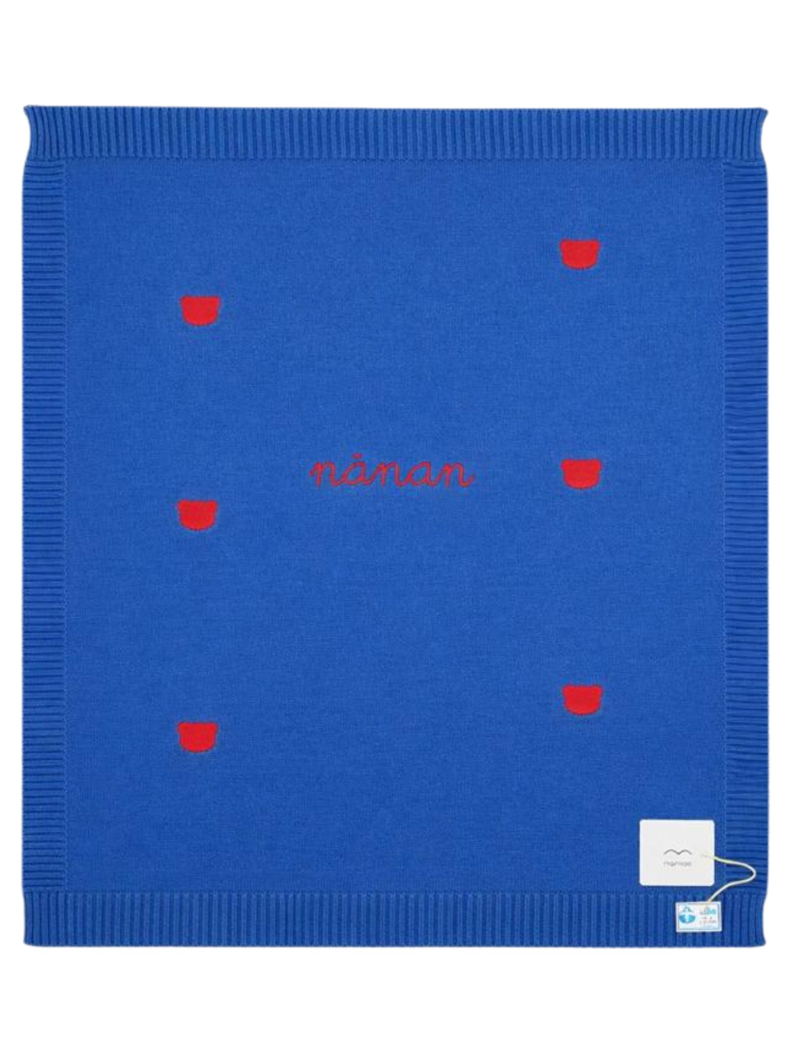 Nanan Kids coperta di colore blu, realizzata in morbido filo di cotone, design a forma quadrata, ricamo centrale iniziale logo con cuori, orli a costine. Composizione: 100% cotone