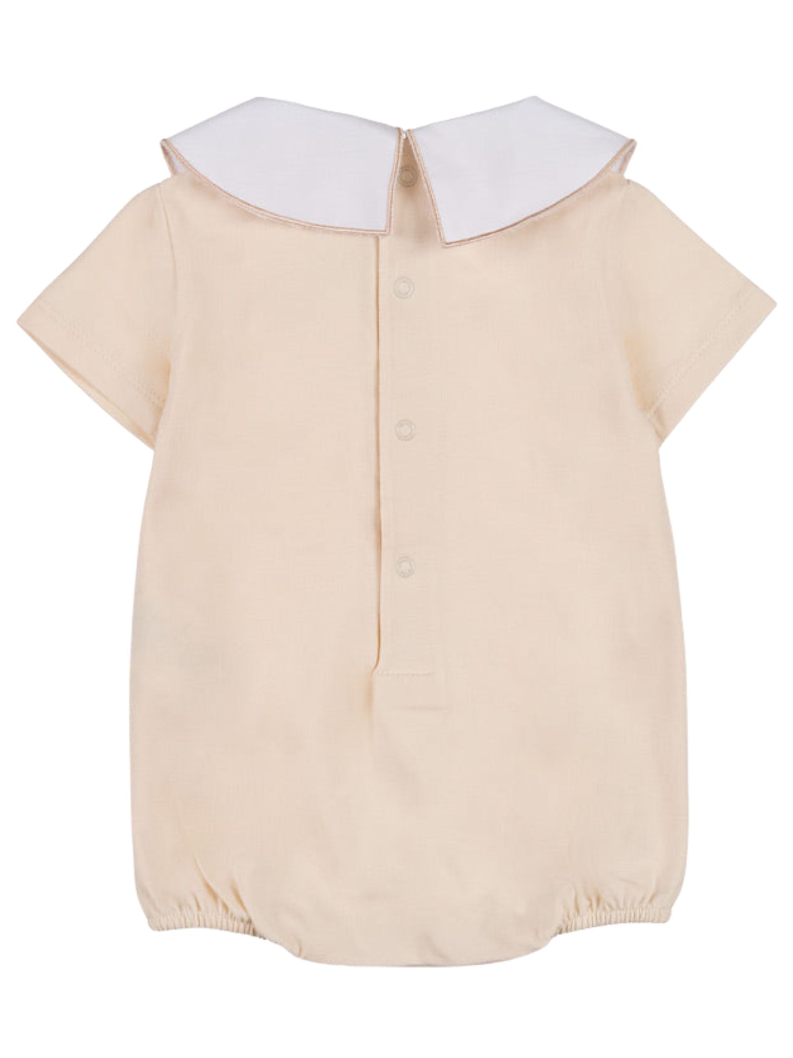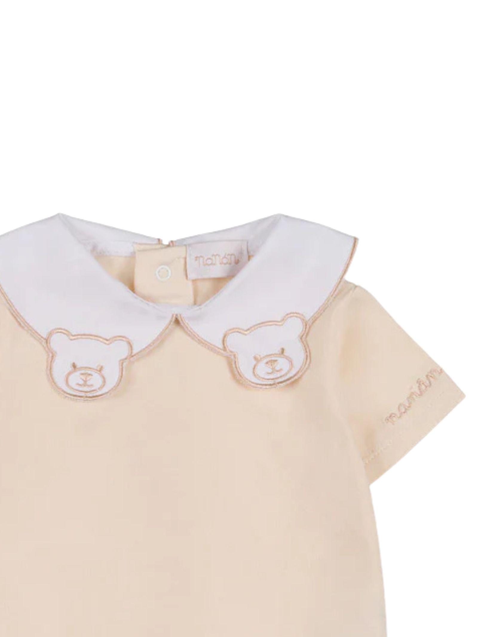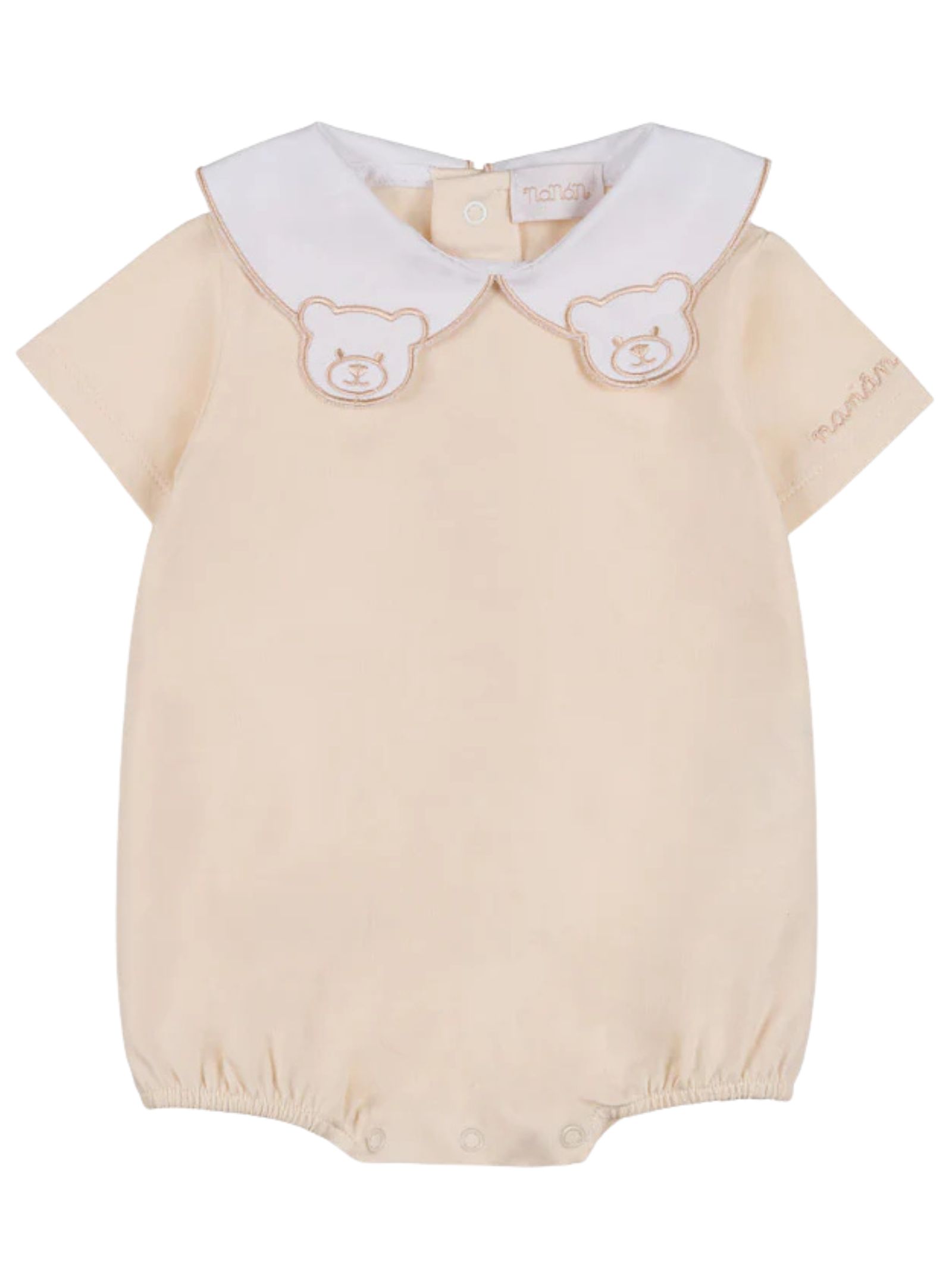 Nanan Kids pagliaccetto di colore sabbia, colletto a contrasto bianco con ricamo orsi, mezza manica, bordo gambe con elastico, apertura con bottoni a pressione sul retro e sul cavallo. Composizione: 95% cotone 5% elastan