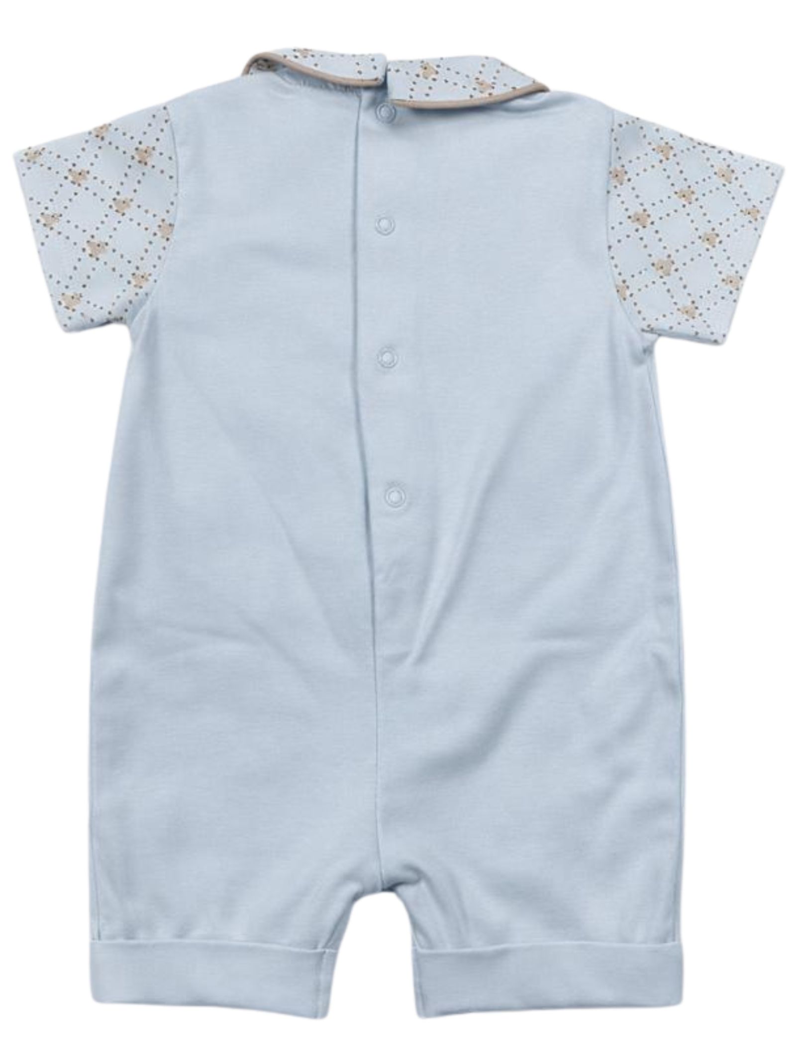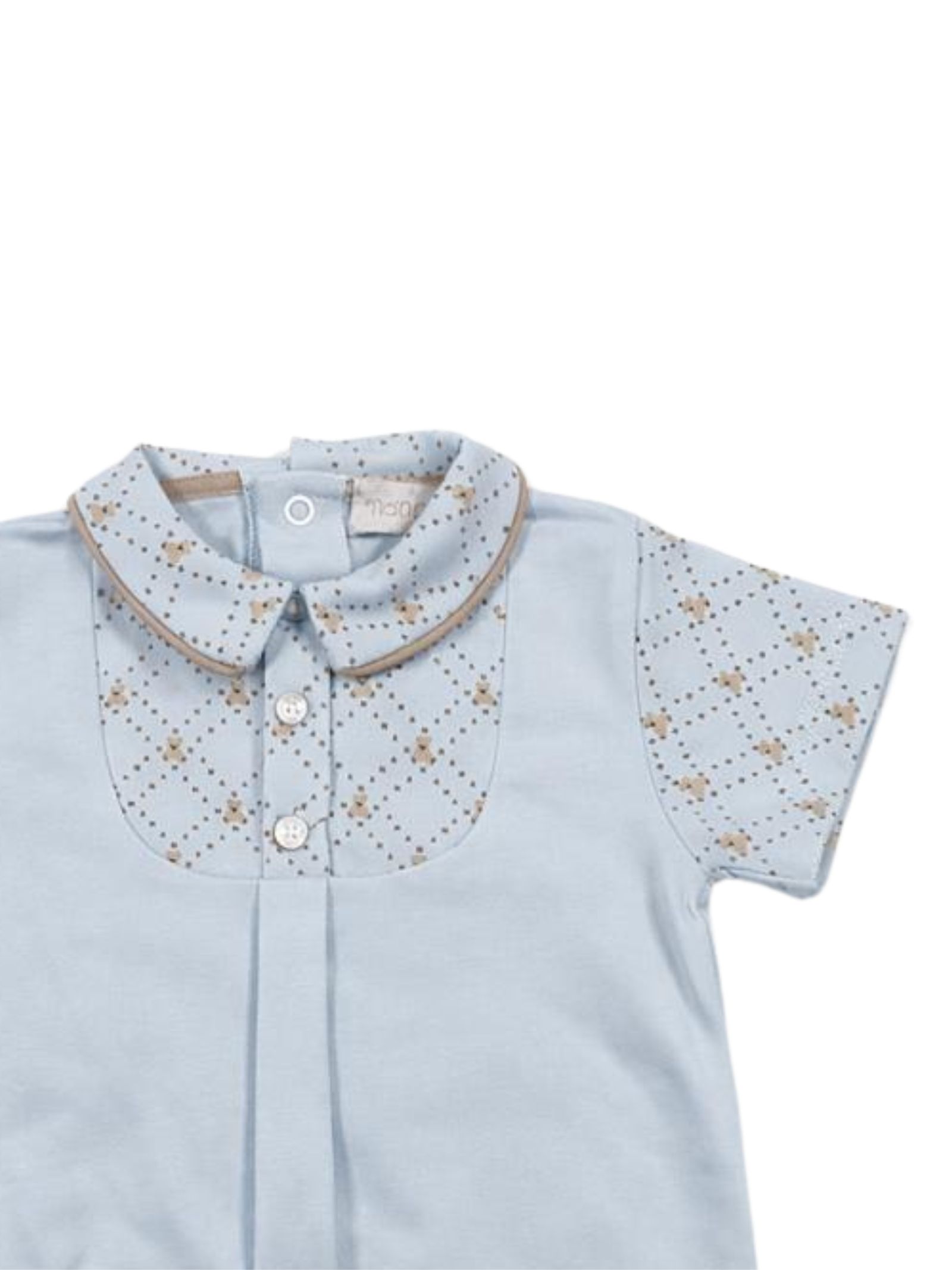 Nanan Kids pagliaccetto di colore azzurro, fantasia Teddy a contrasto, design a salopette, mezza manica, apertura con bottoni a pressione sul retro e sul cavallo. Composizione: 95% cotone 5% elastan
