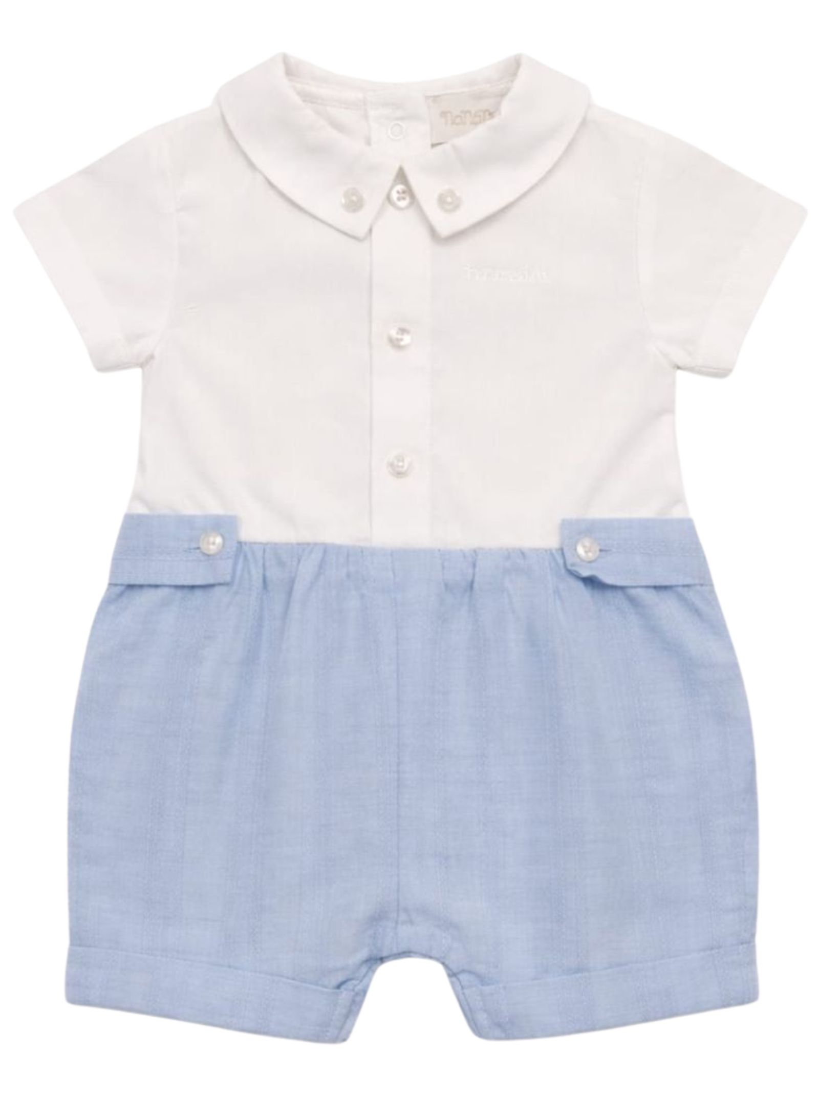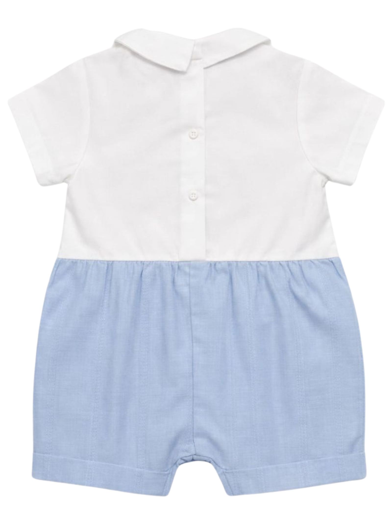 Nanan Kids pagliaccetto elegante di colore azzurro con camicia a contrasto bianco, mezza manica, apertura con bottoni a pressione sul retro e sul cavallo. Composizione: 100% cotone