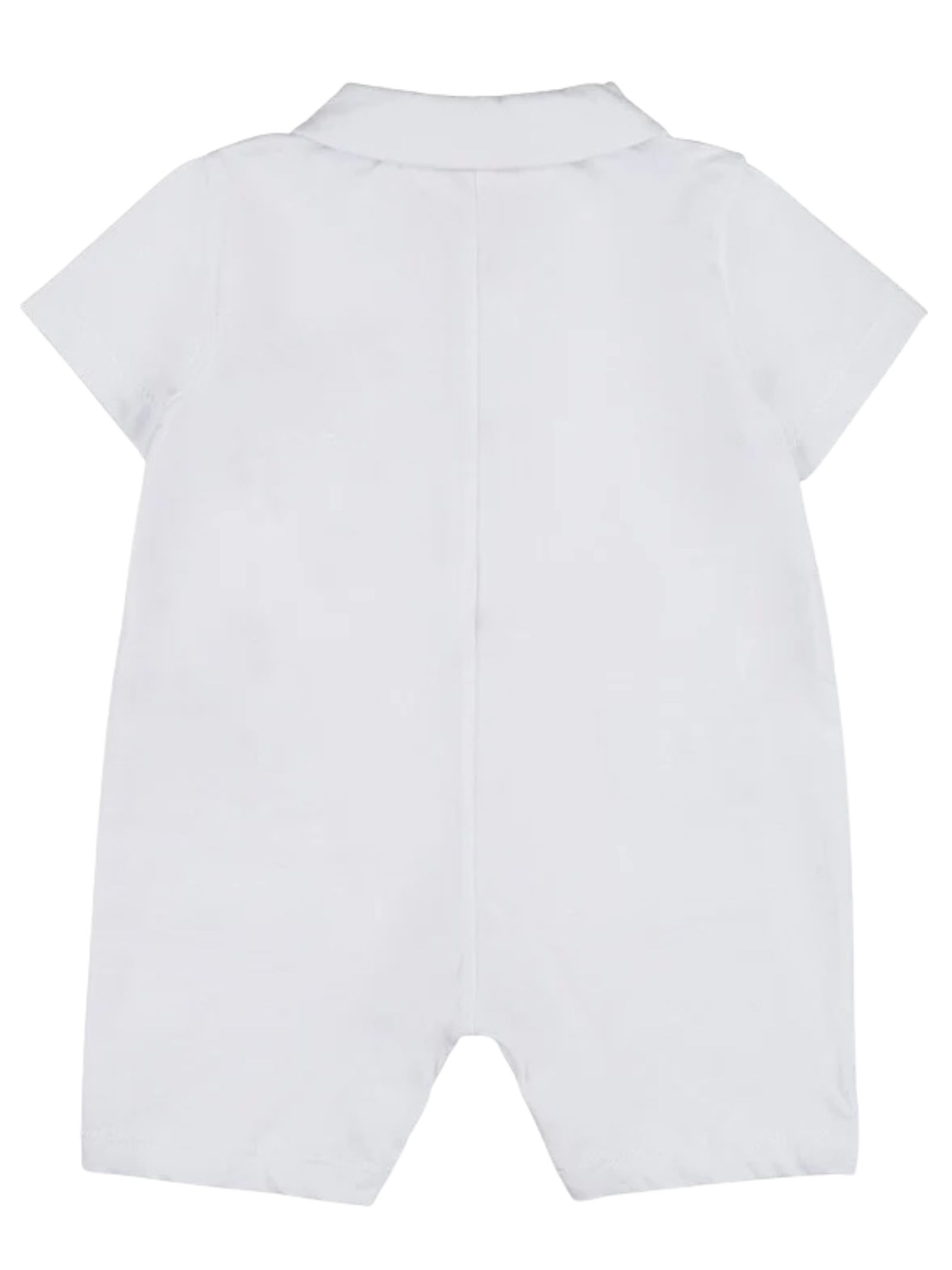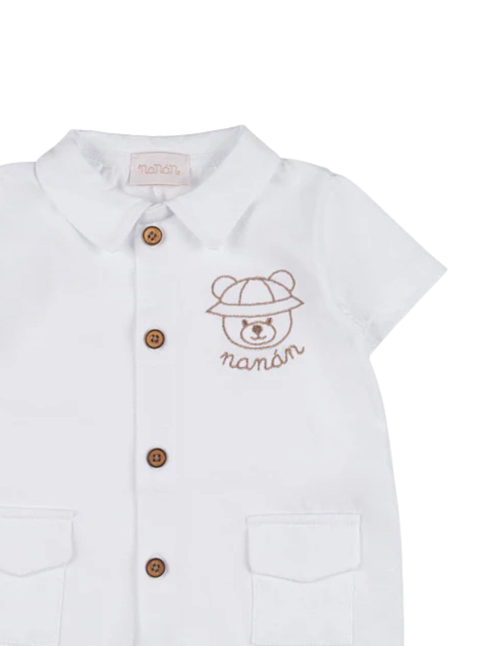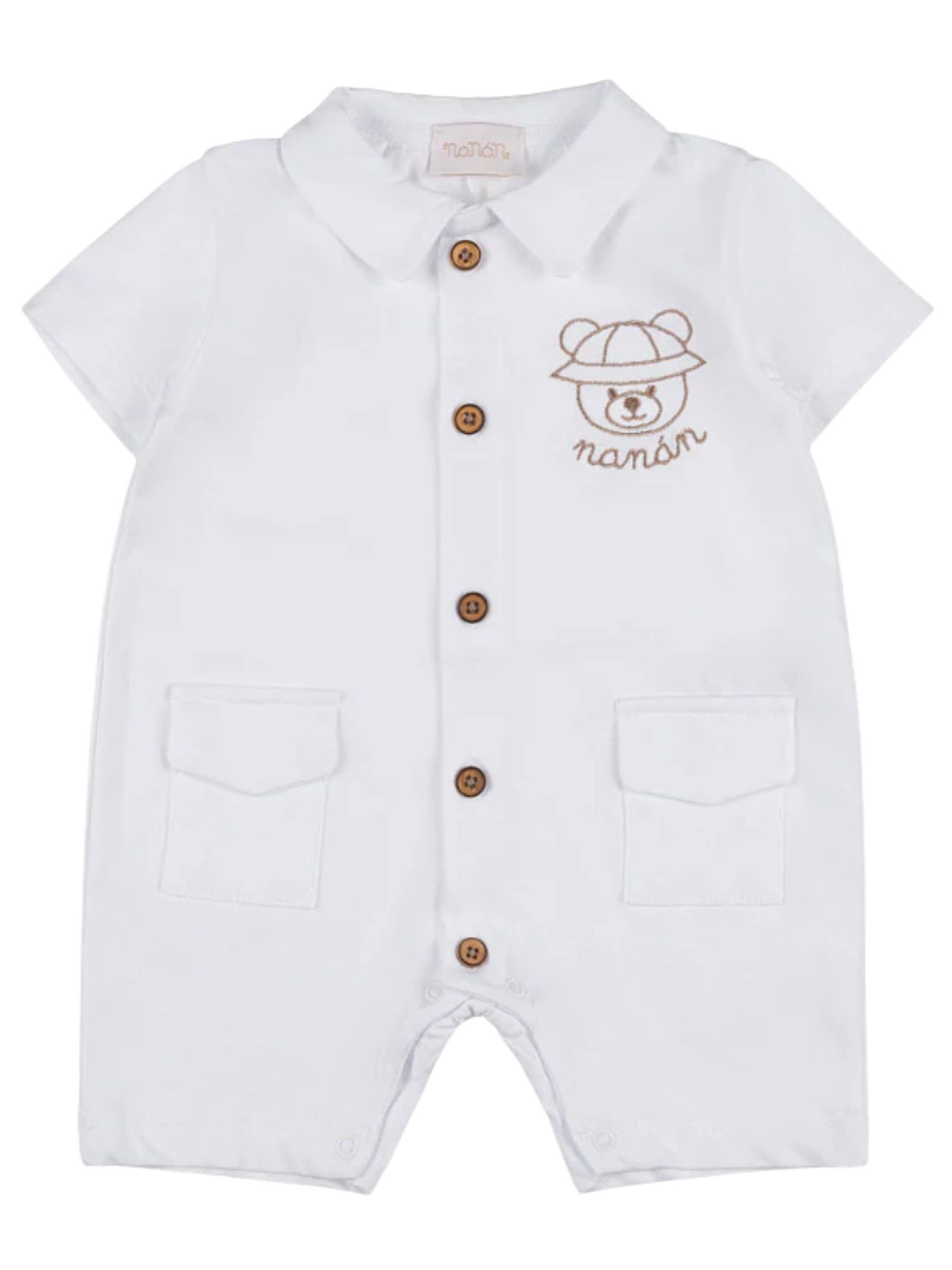 Nanan Kids pagliaccetto di colore panna realizzato in cotone, design con colletto, dettaglio ricamo Teddy con logo sul petto a contrasto, mezza manica, taschini, apertura con bottoni sul davanti e sul cavallo. Composizione: 100% cotone