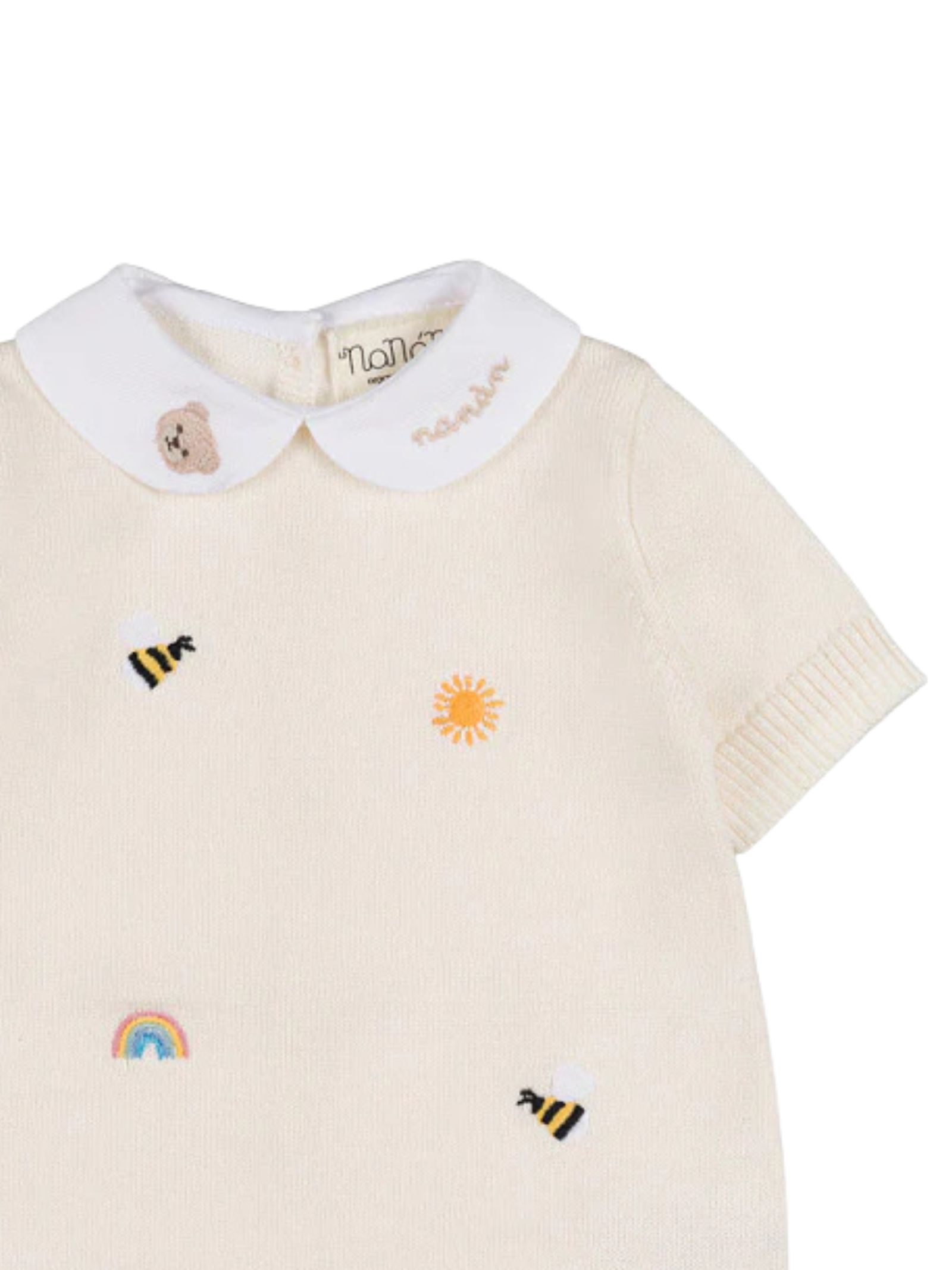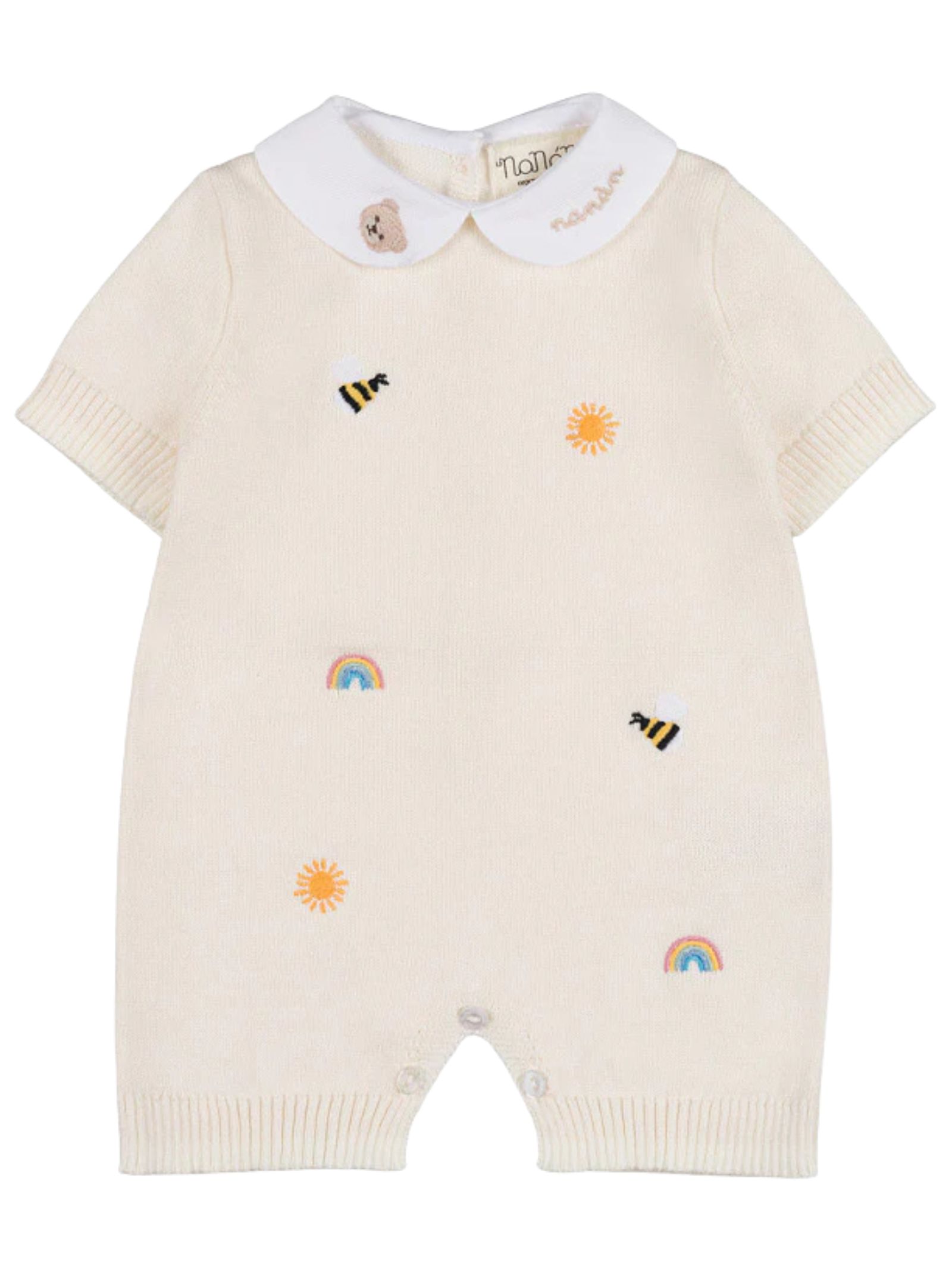 Nanan Kids pagliaccetto di colore sabbia realizzato in filo di cotone, design con colletto, dettaglio ricami a contrasto, mezza manica, apertura con bottoni sul retro e sul cavallo, orli a costine. Composizione: 100% cotone