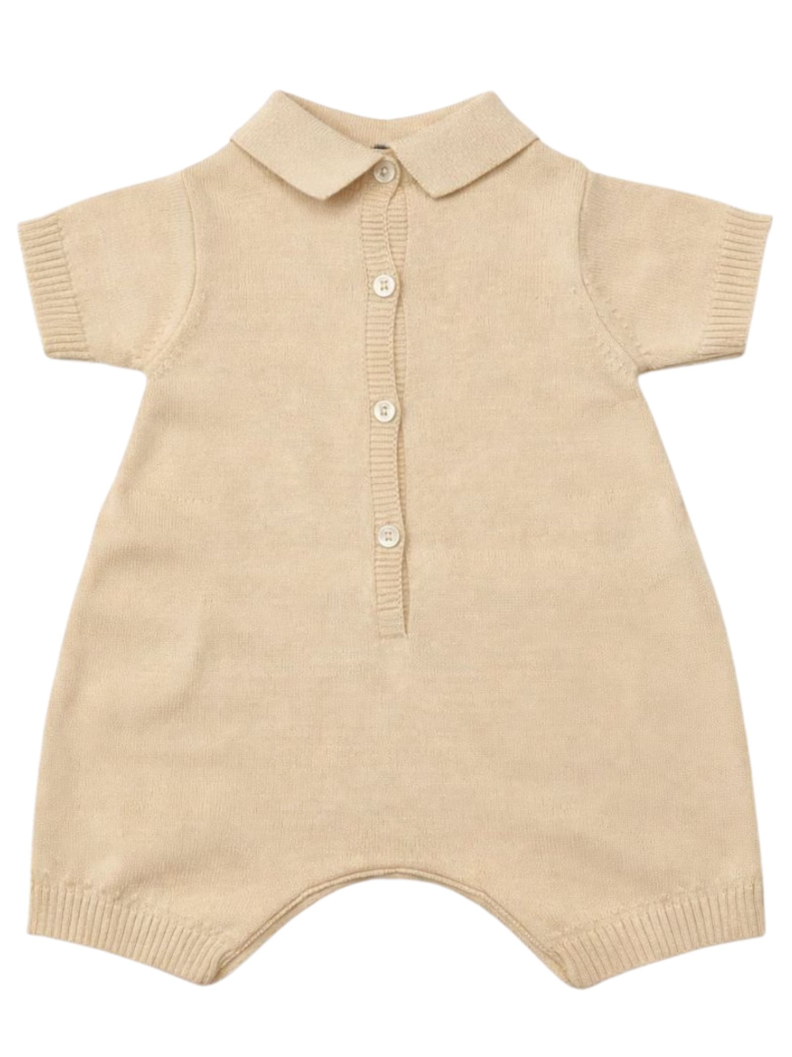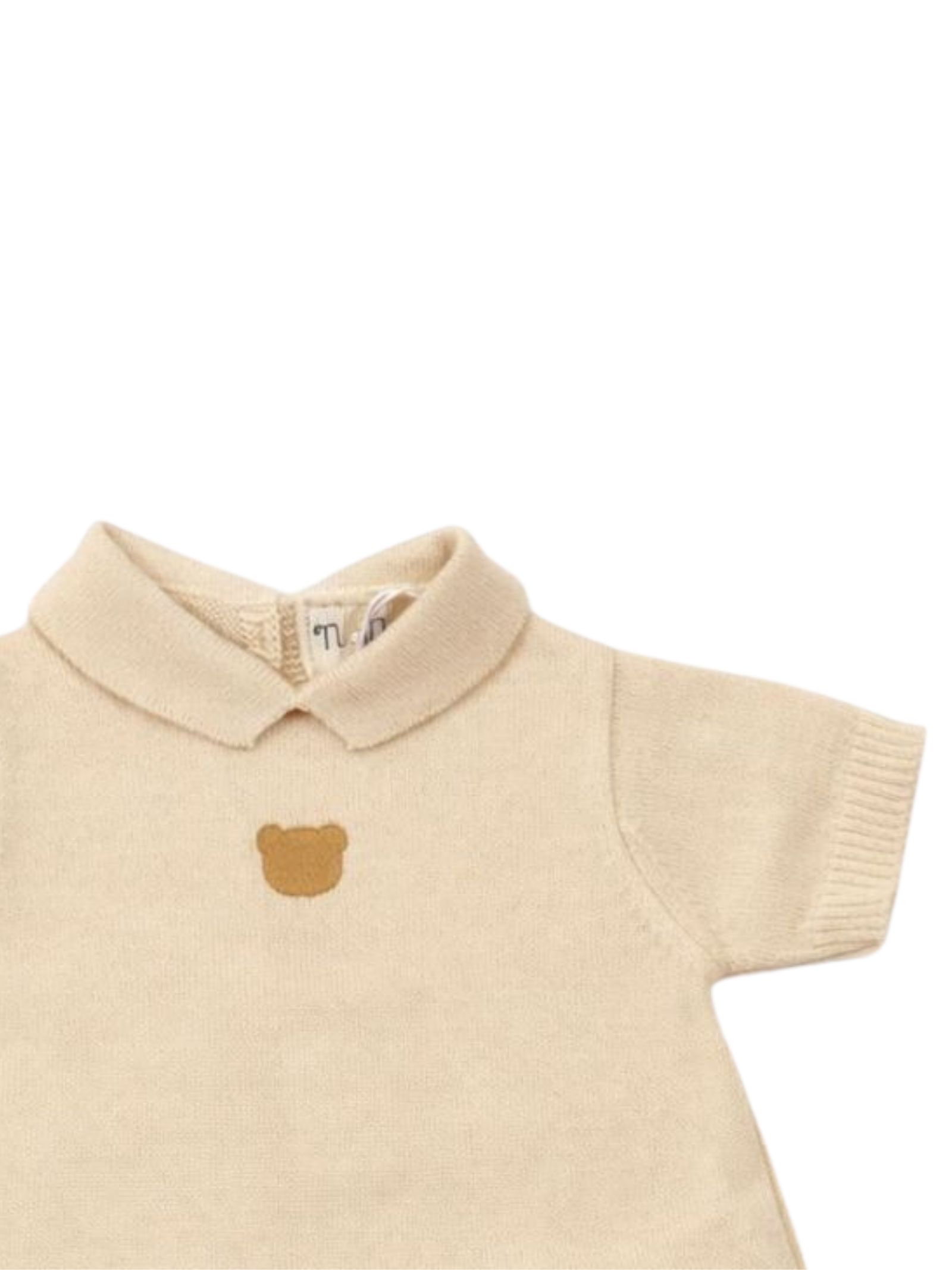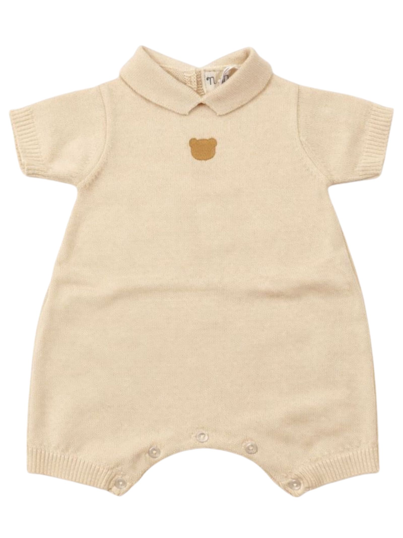 Nanan Kids pagliaccetto di colore sabbia realizzato in filo di cotone, design con colletto, dettaglio ricamo teddy a contrasto, mezza manica, apertura con bottoni sul retro e sul cavallo, orli a costine. Composizione: 100% cotone