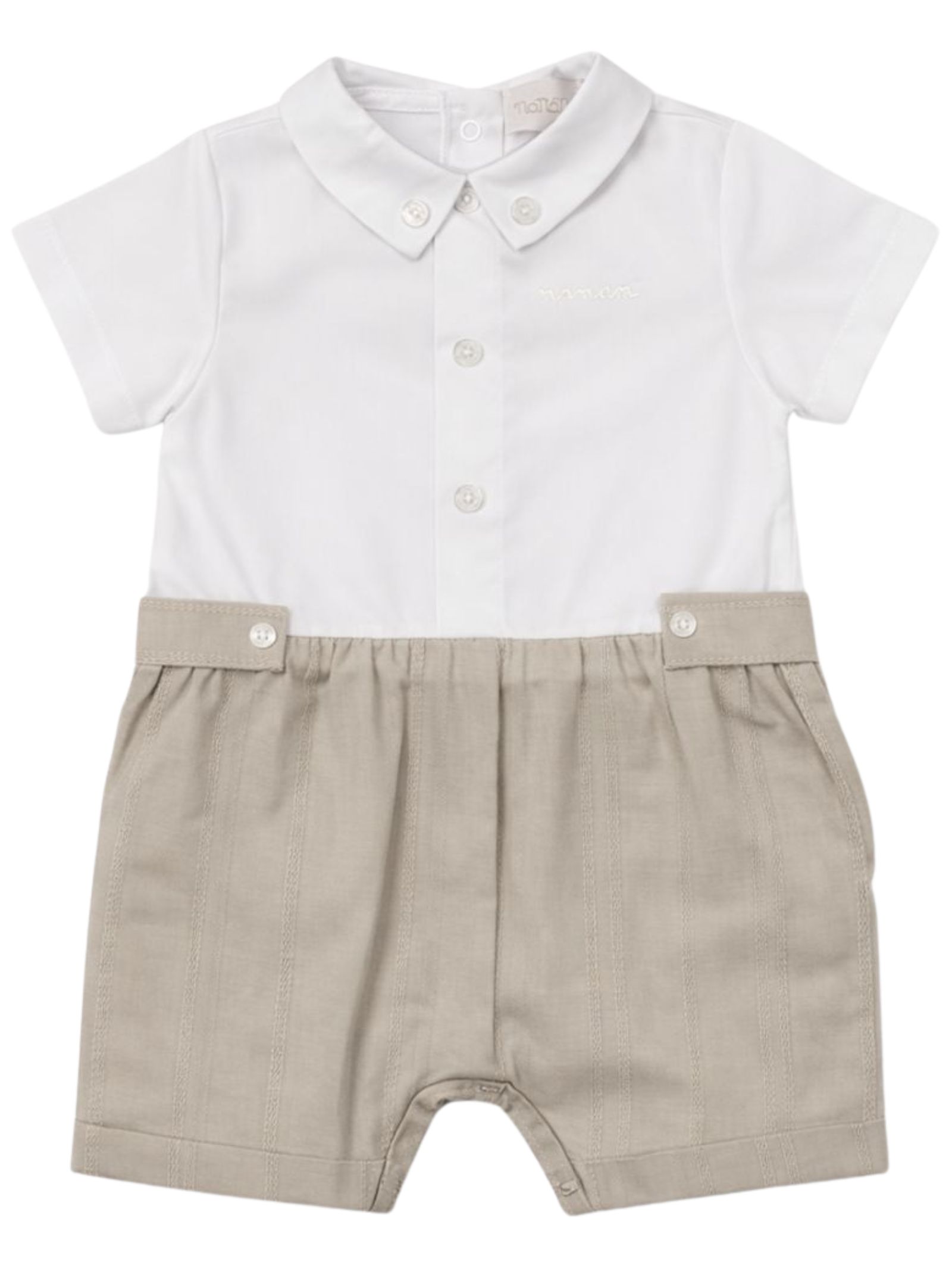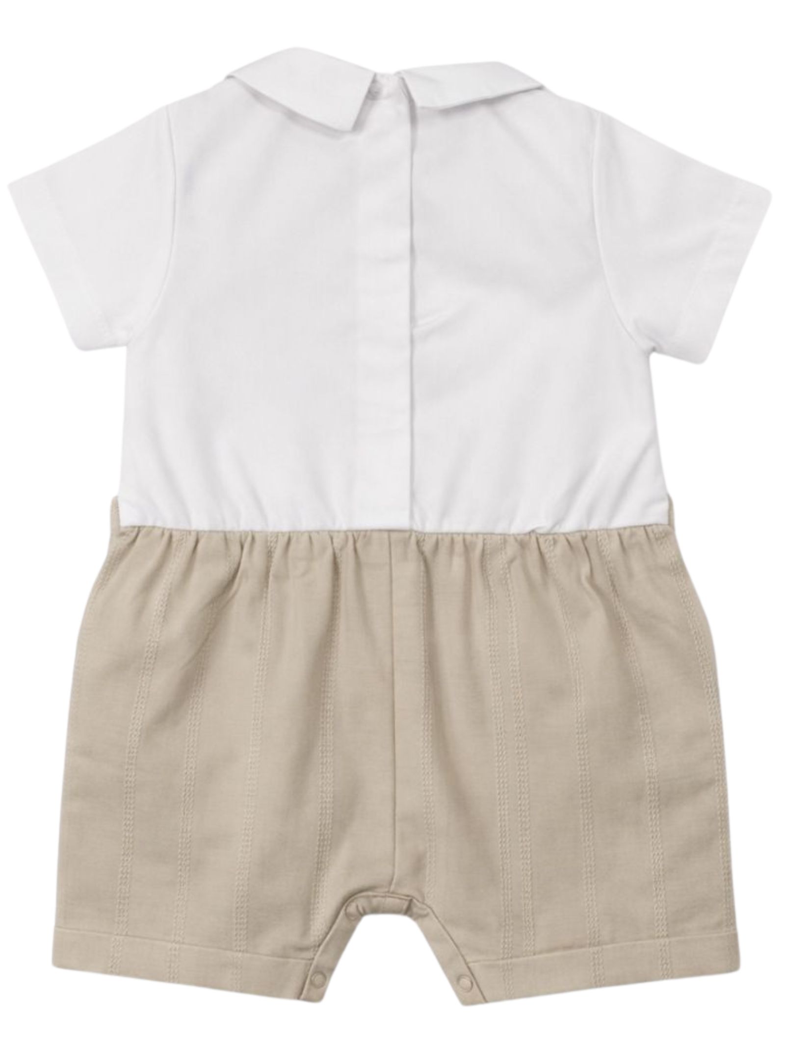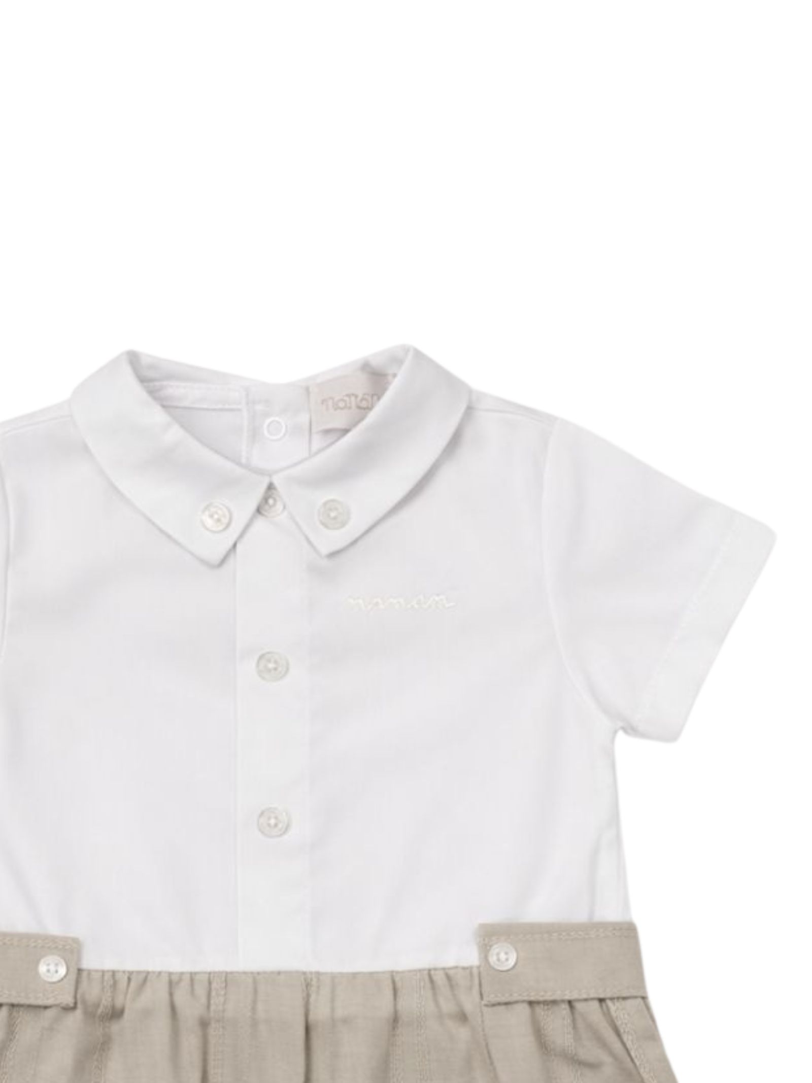 Nanan Kids pagliaccetto elegante di colore sabbia con camicia a contrasto bianco, mezza manica, apertura con bottoni a pressione sul retro e sul cavallo. Composizione: 100% cotone