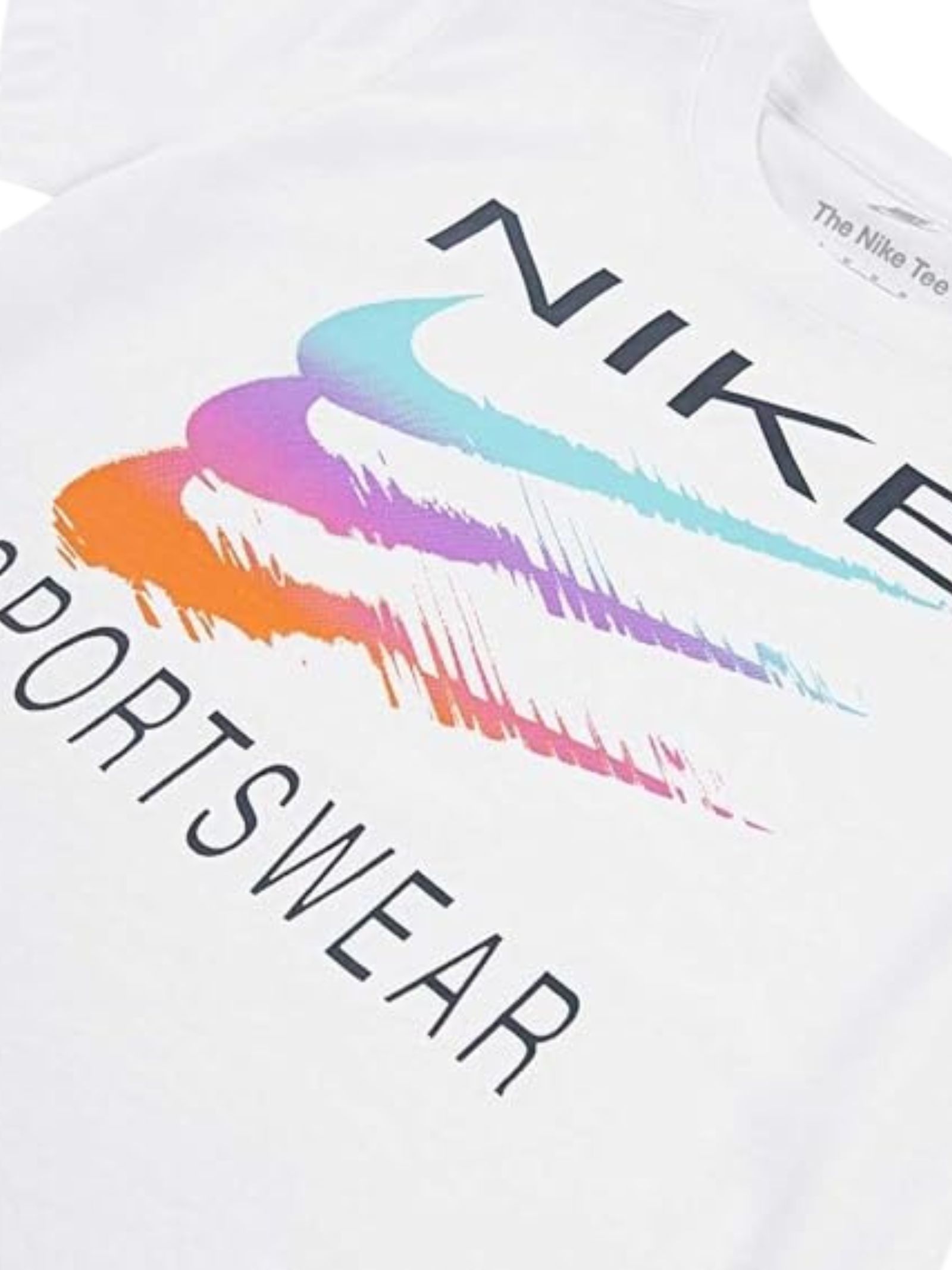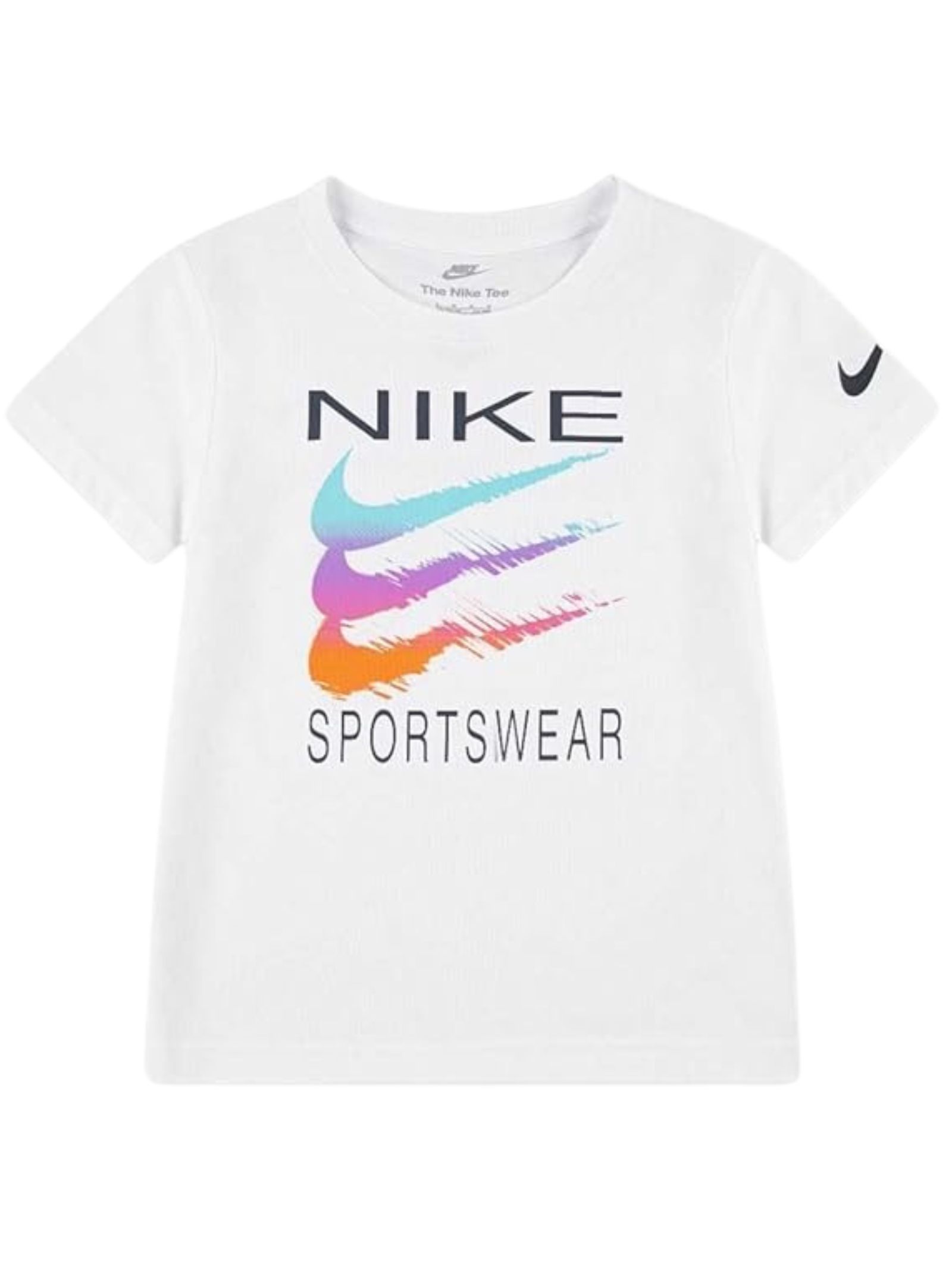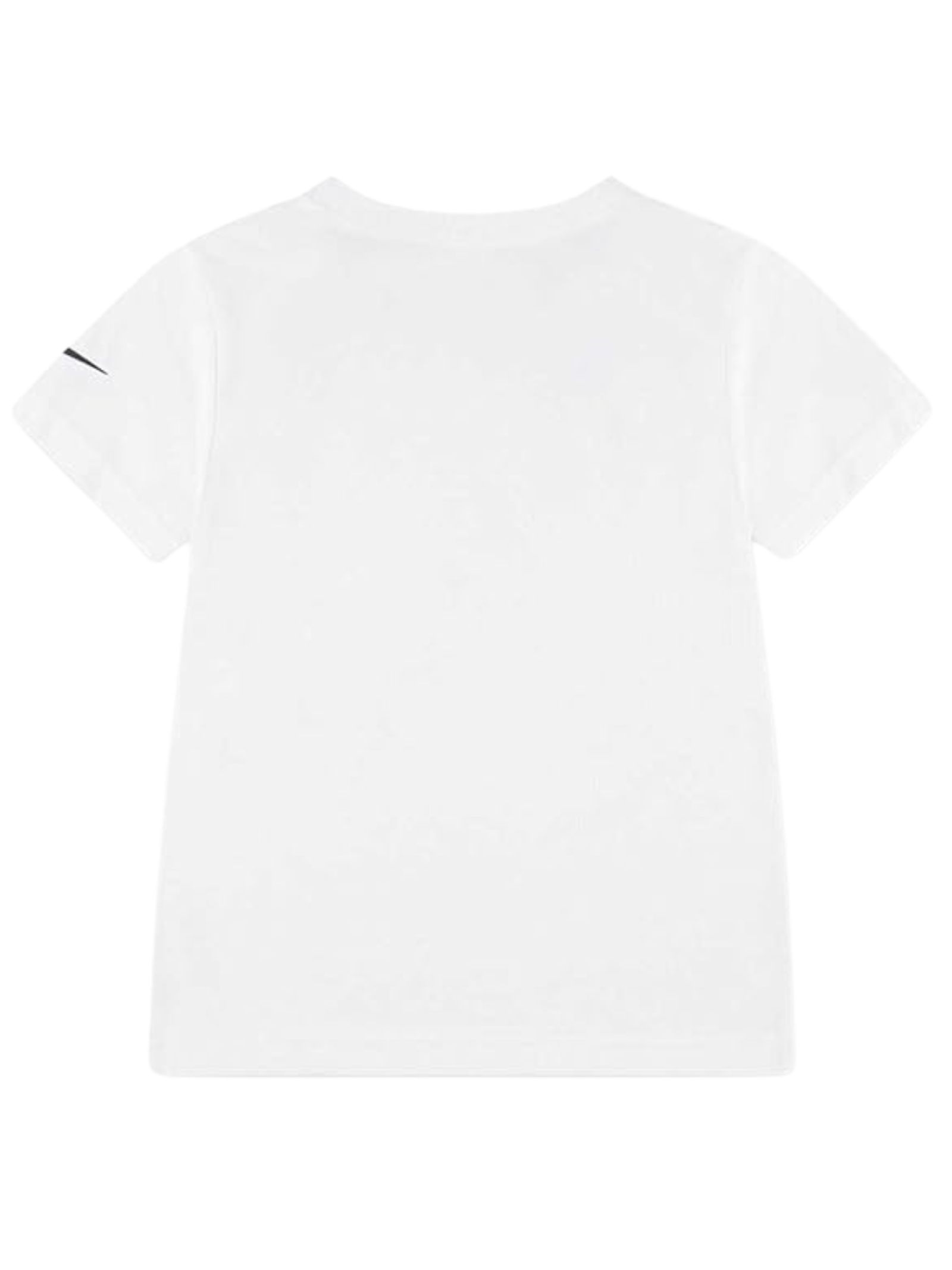 Nike Kids t-shirt di colore bianco, modello girocollo, mezza manica, stampa centrale a contrasto multicolor con logo, vestibilità regolare. Composizione: 60% cotone 40% poliestere
