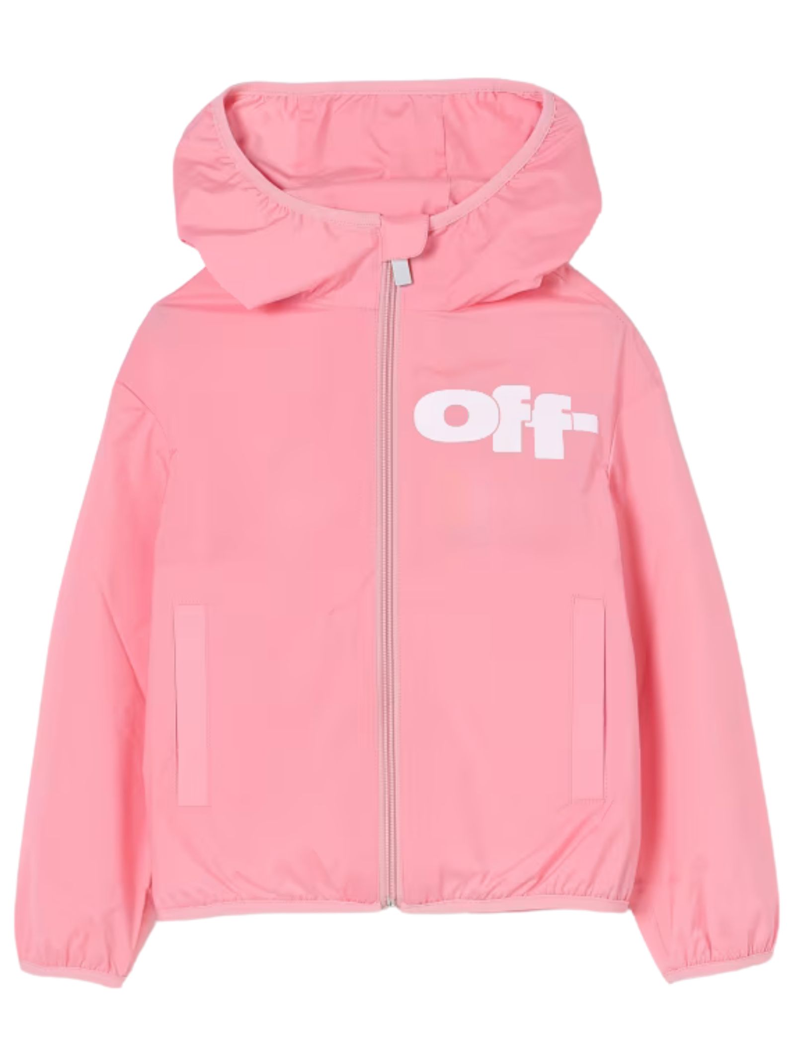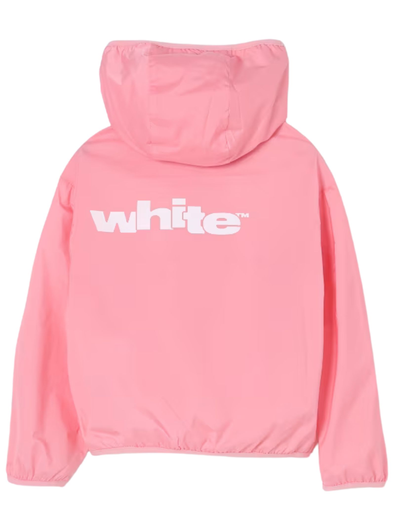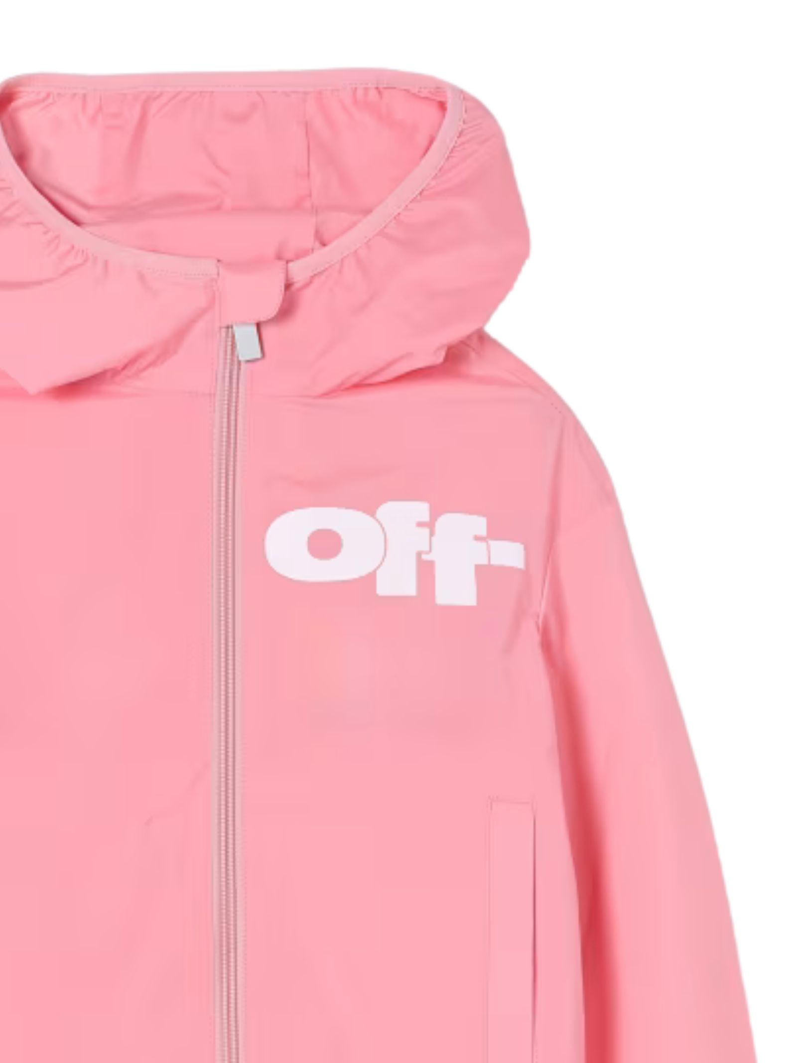 Off-White Kids giubbino antivento di colore rosa, modello con cappuccio, maniche lunghe, interno sfoderato, chiusura con zip, tasche a fessura, logo a contrasto bianco diviso tra il davanti e il retro, vestibilità regolare. Composizione: 100% poliestere