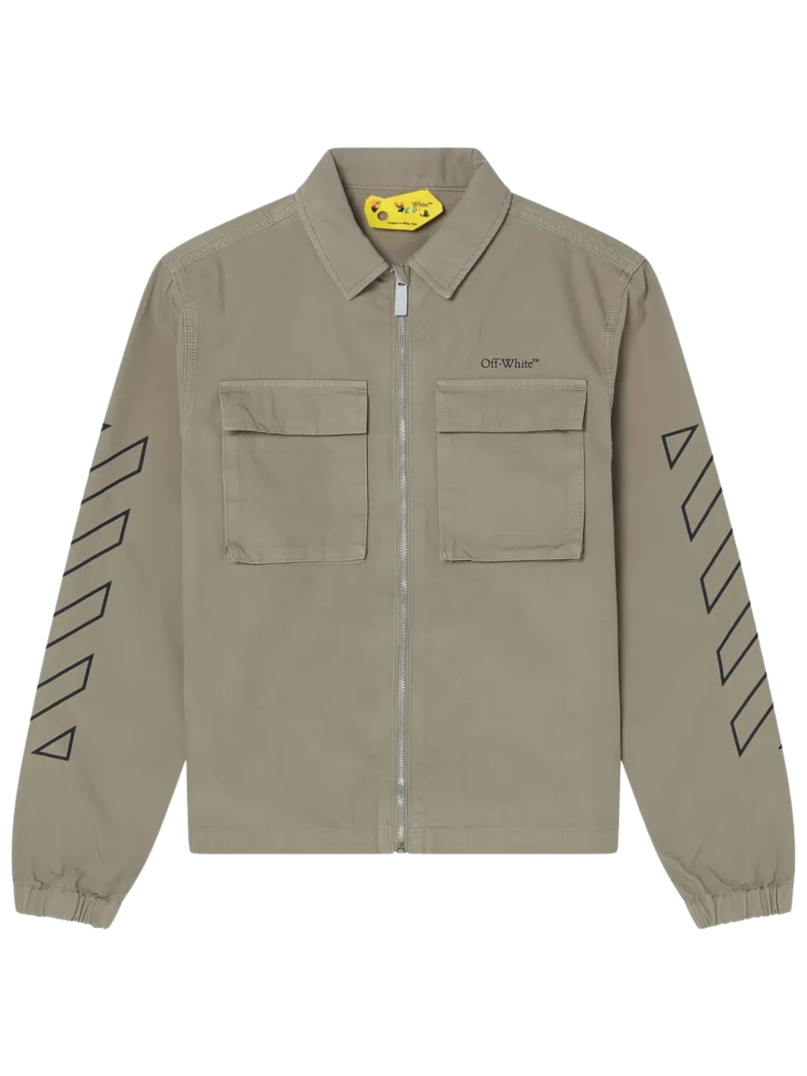 Off-White Kids giubbino di colore verde, chiusura frontale con zip, due tasche con patta sul petto, orli elasticizzati, stampa con logo sul petto e stampa lungo le maniche, vestibilità regolare. Composizione: 100% cotone