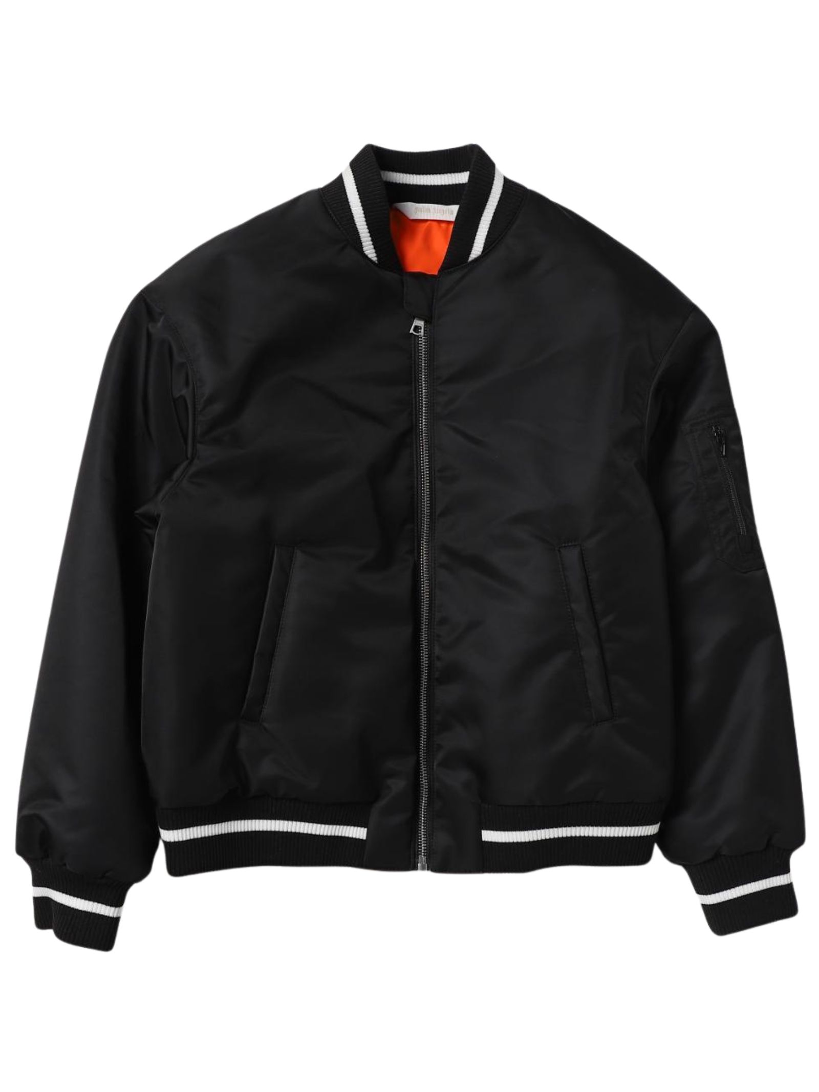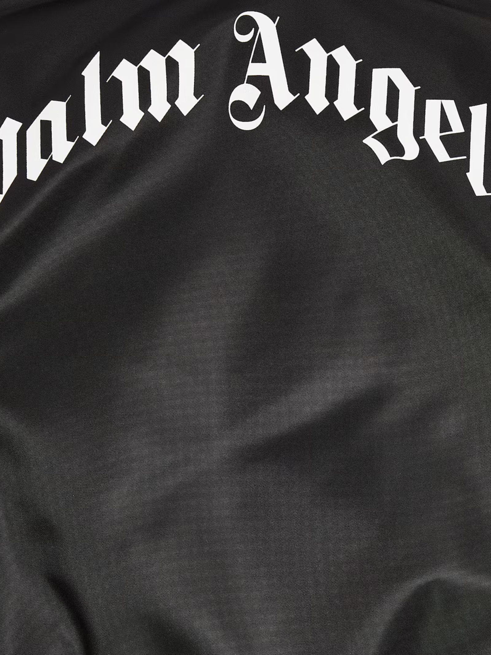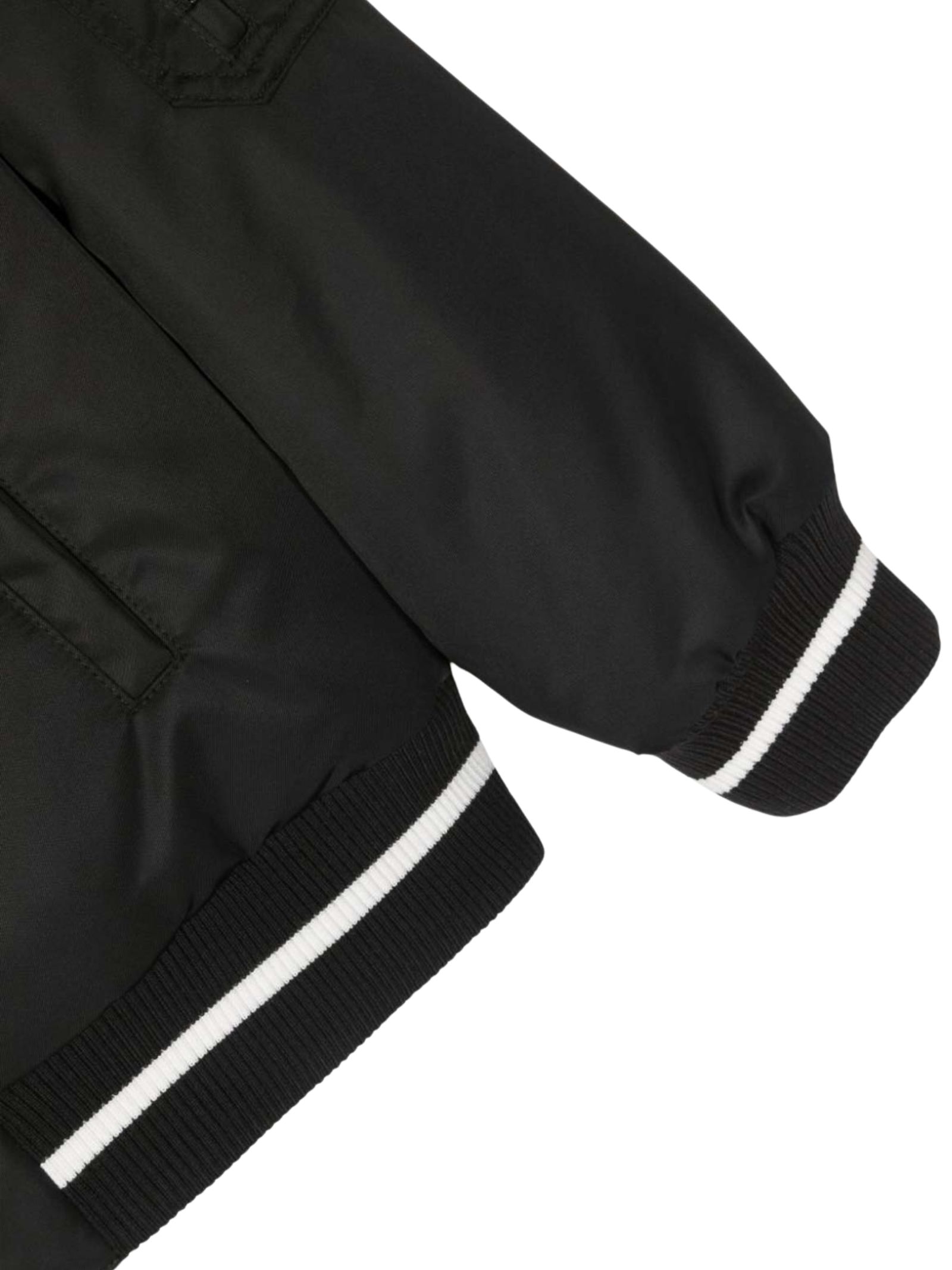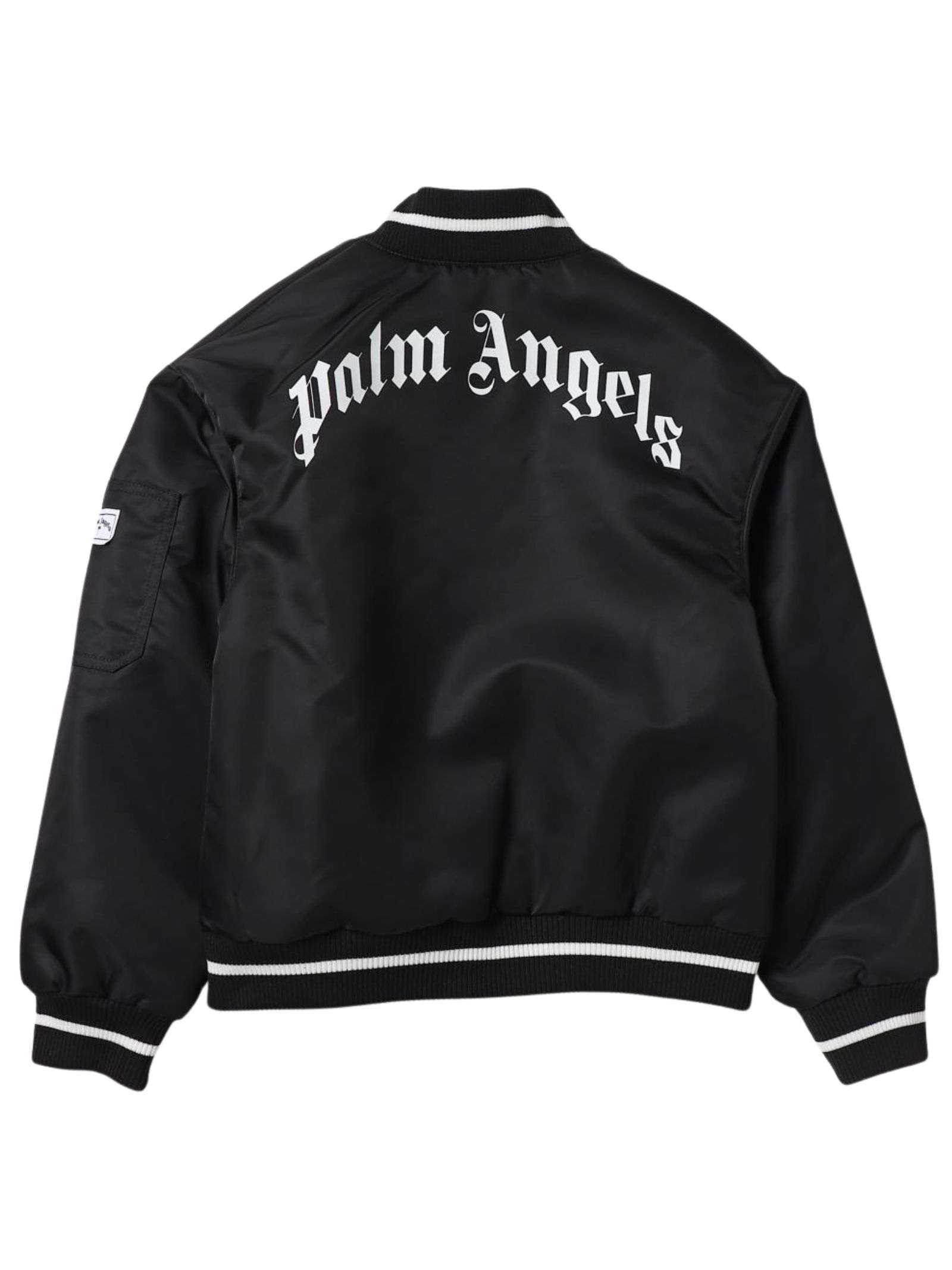 Palm Angels Kids giubbino bomber di colore nero, rivestimento in tessuto tecnico, maxi logo a contrasto bianco sul retro, rifinito con bordi a coste a righe, tasche a fessura e una zip argentata. Composizione: poliammide 100%. Imbottitura: 100% poliestere. Made in Italy