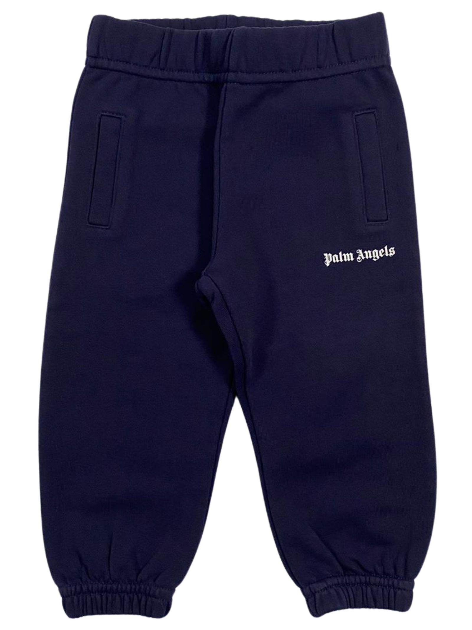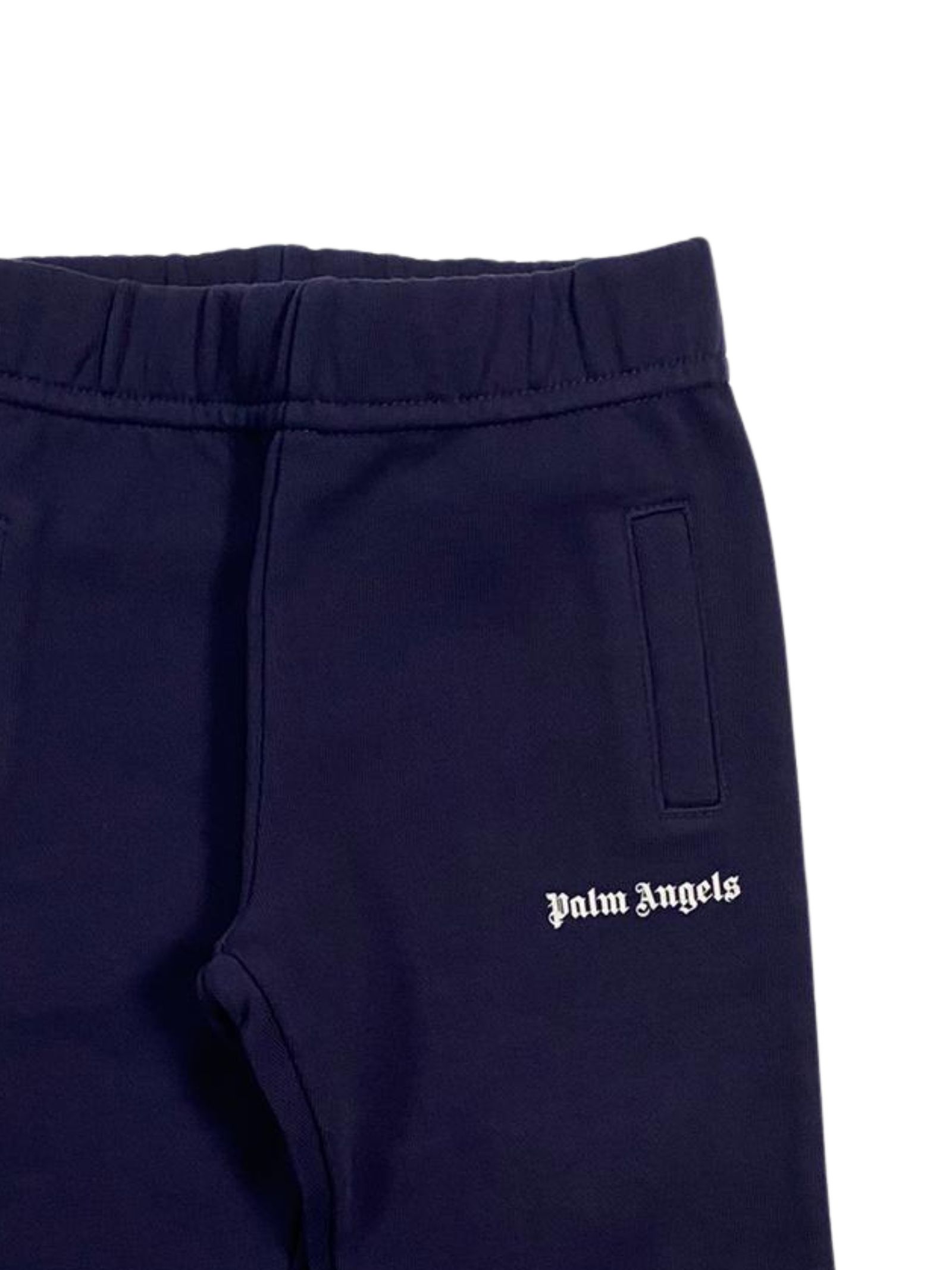 Palm Angels Kids pantalone di colore blu, modello con elastico in vita, due tasche a filo laterali, una tasca a fessura sul retro, stampa logo a contrasto bianco, elastici alle caviglie. Composizione: 100% cotone