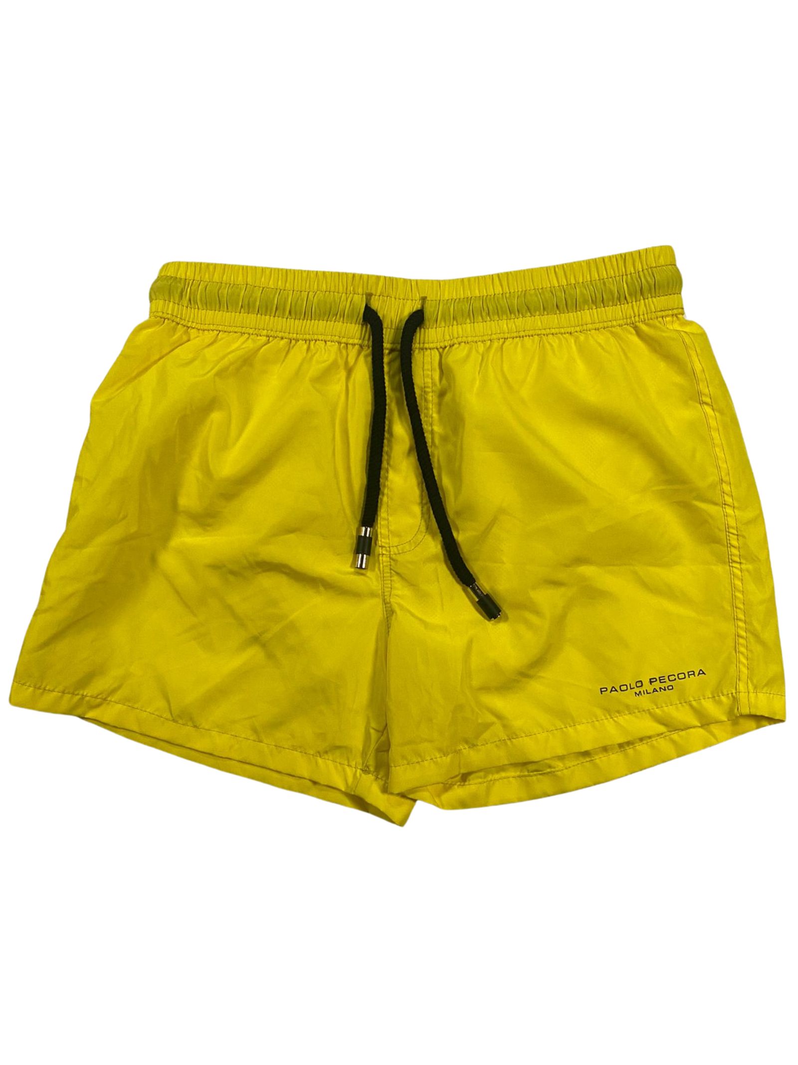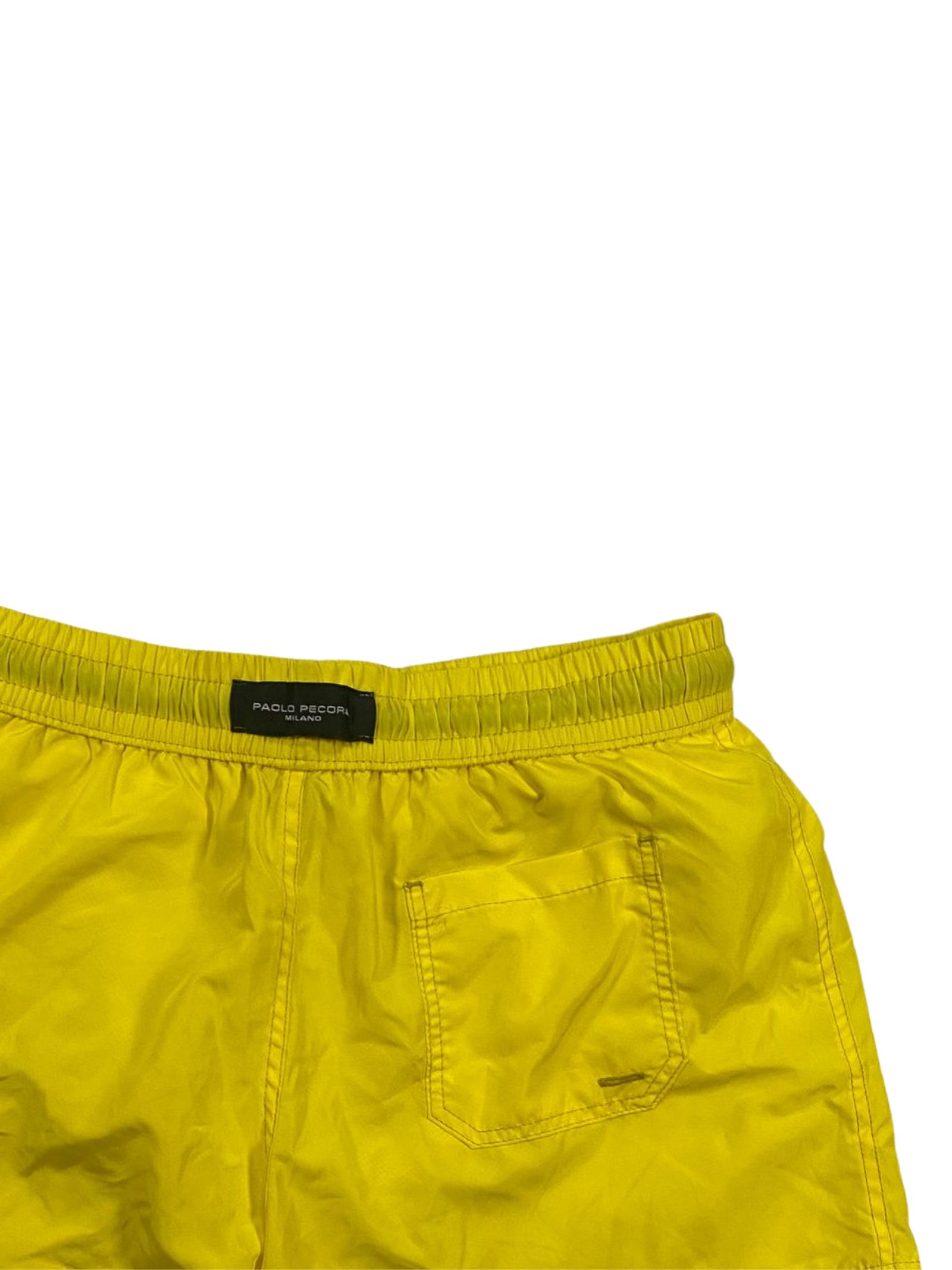 Paolo Pecora Kids costume da bagno di colore giallo, modello boxer, realizzato in nylon ad asciugatura rapida, coulisse in vita, tasche laterali, tasca sul retro, slip interno in rete, patch con logo applicato. Composizione: 100% Nylon. Made in Italy