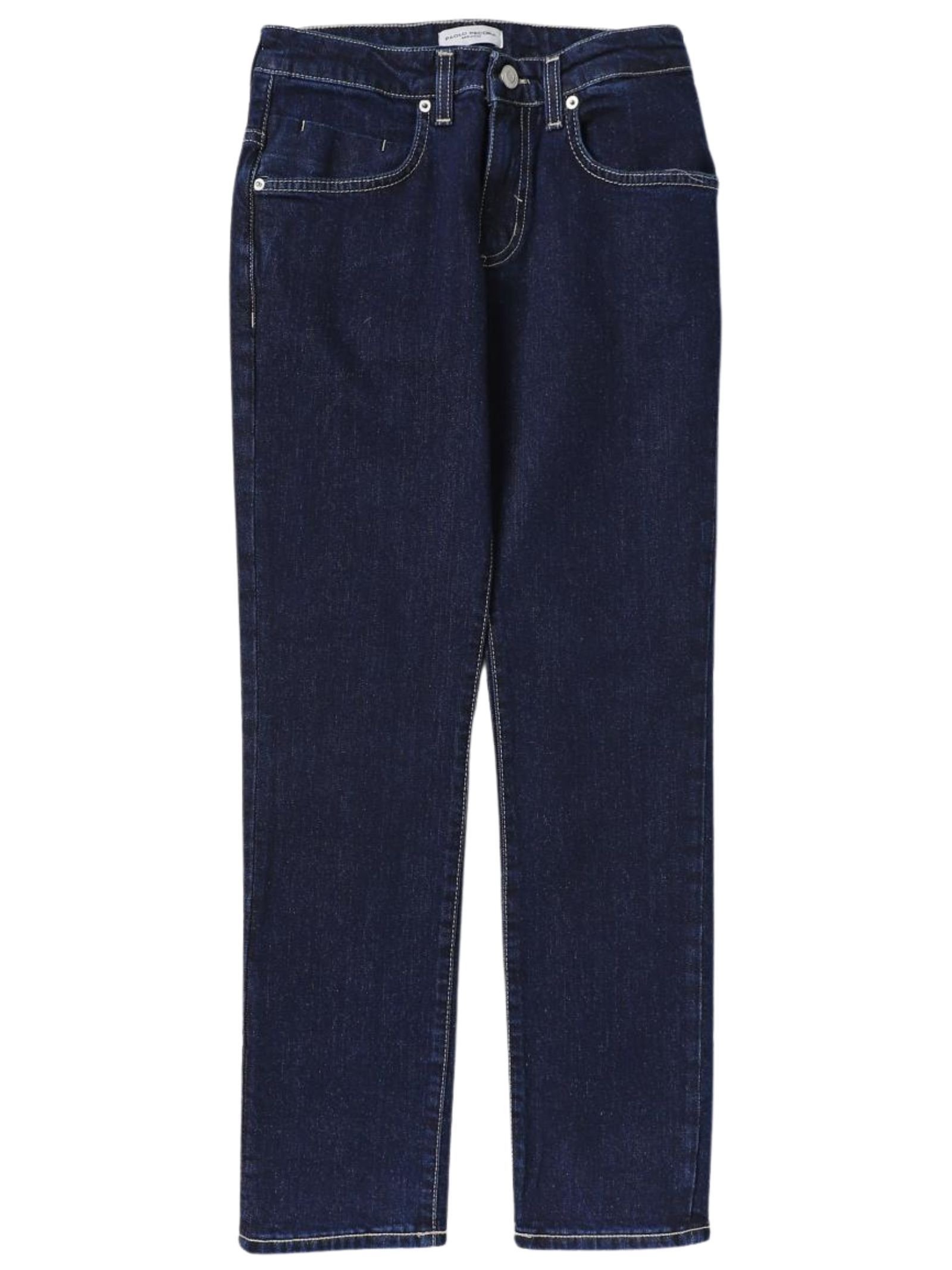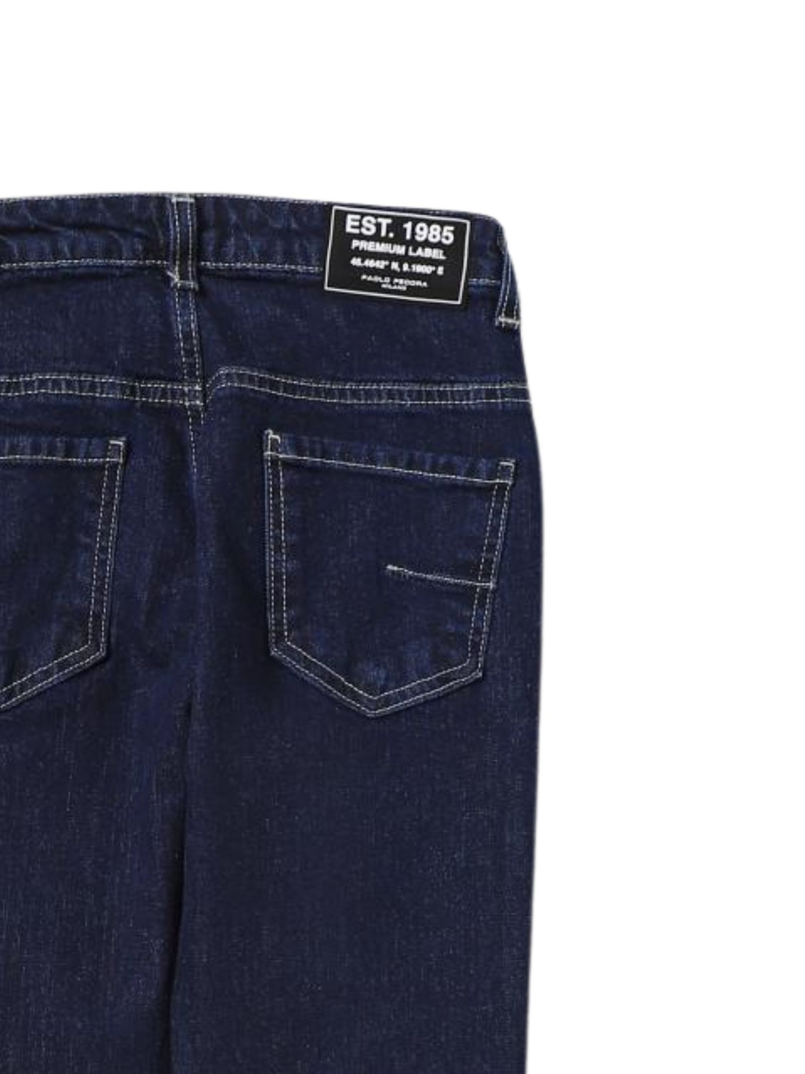 Paolo Pecora Kids jeans di colore blu, cuciture a vista, modello 5 tasche, vita regolare, passanti, patch con logo sul retro, vestibilità regolare. Composizione: 98% cotone 2 % elastan. Made in Italy